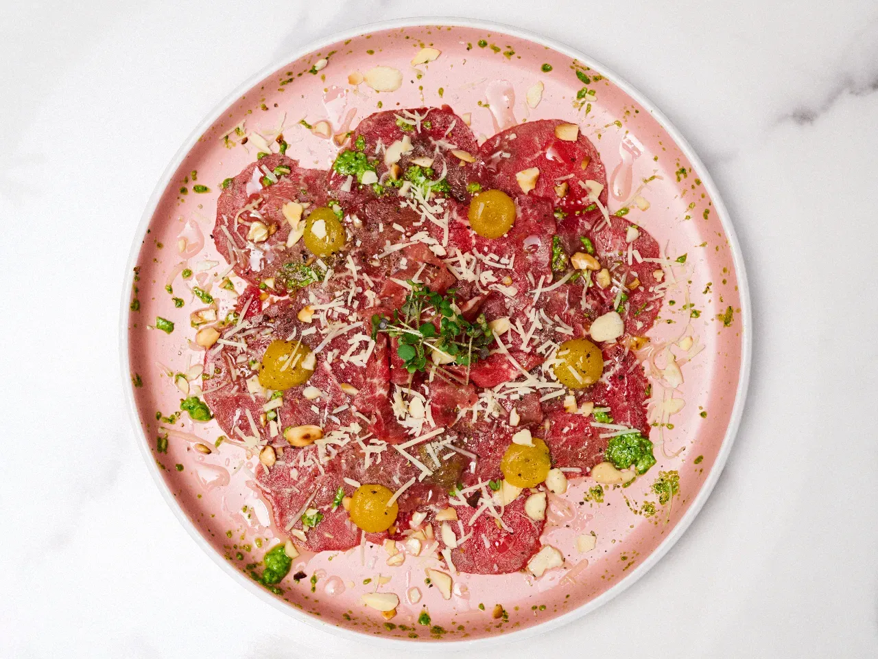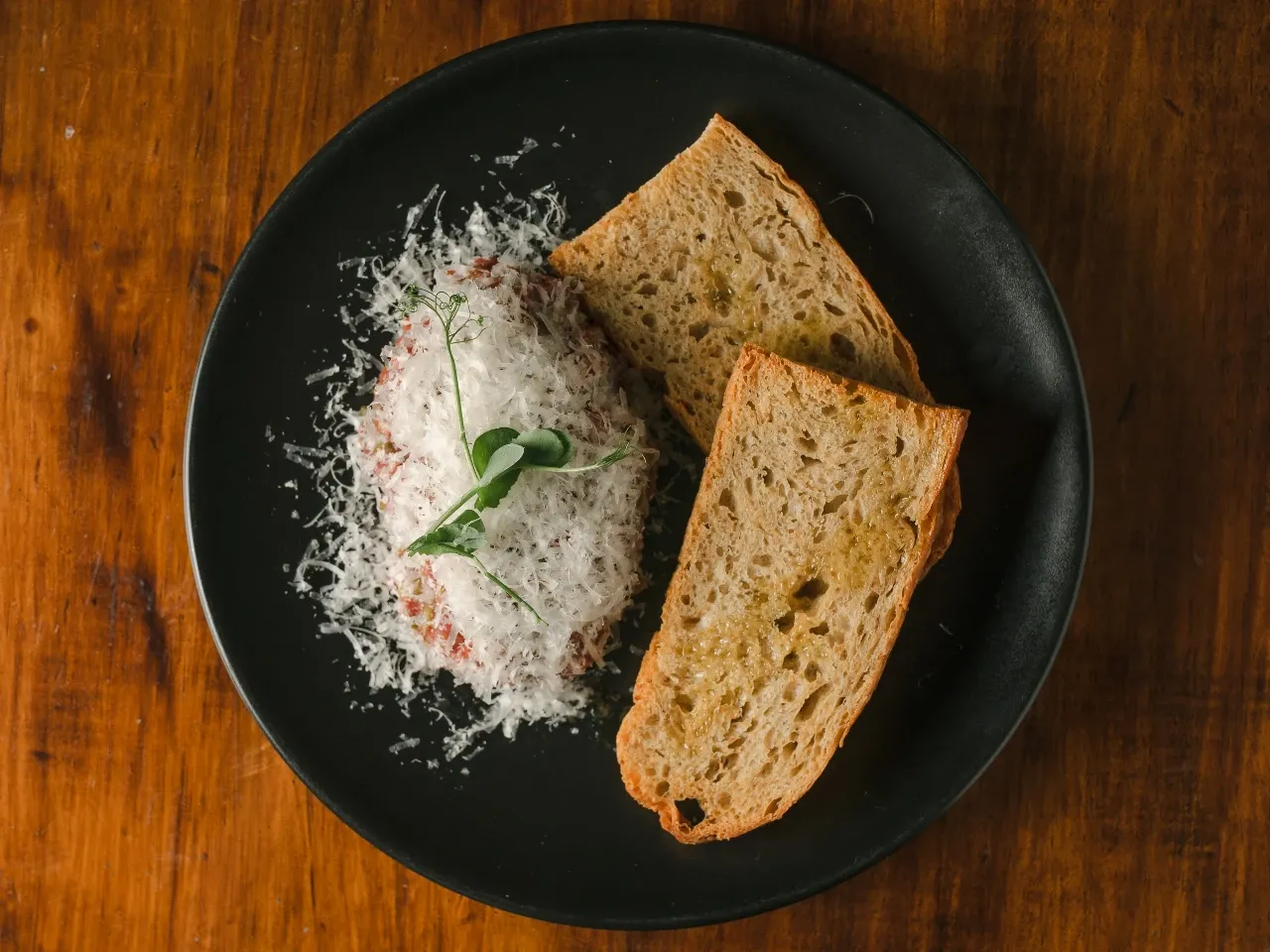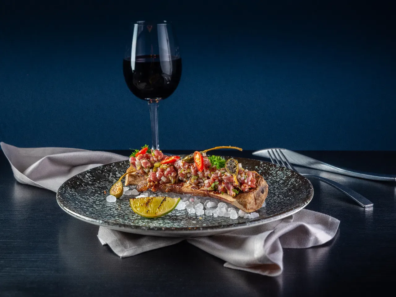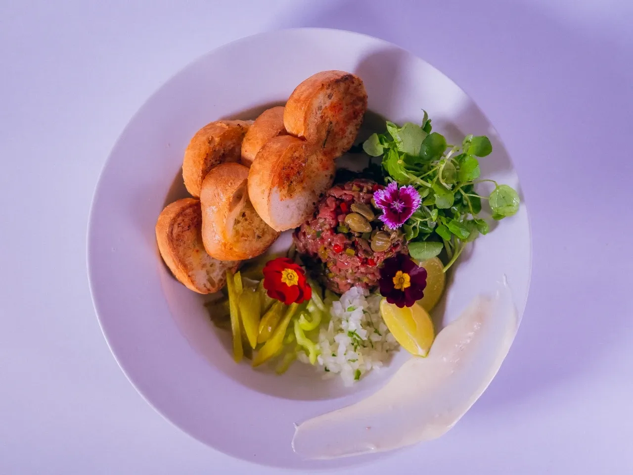 Carne de res molida en el momento, servida con pepinillos, cebolla perla, tostadas y Ali Oli