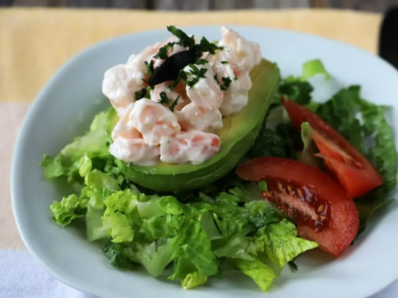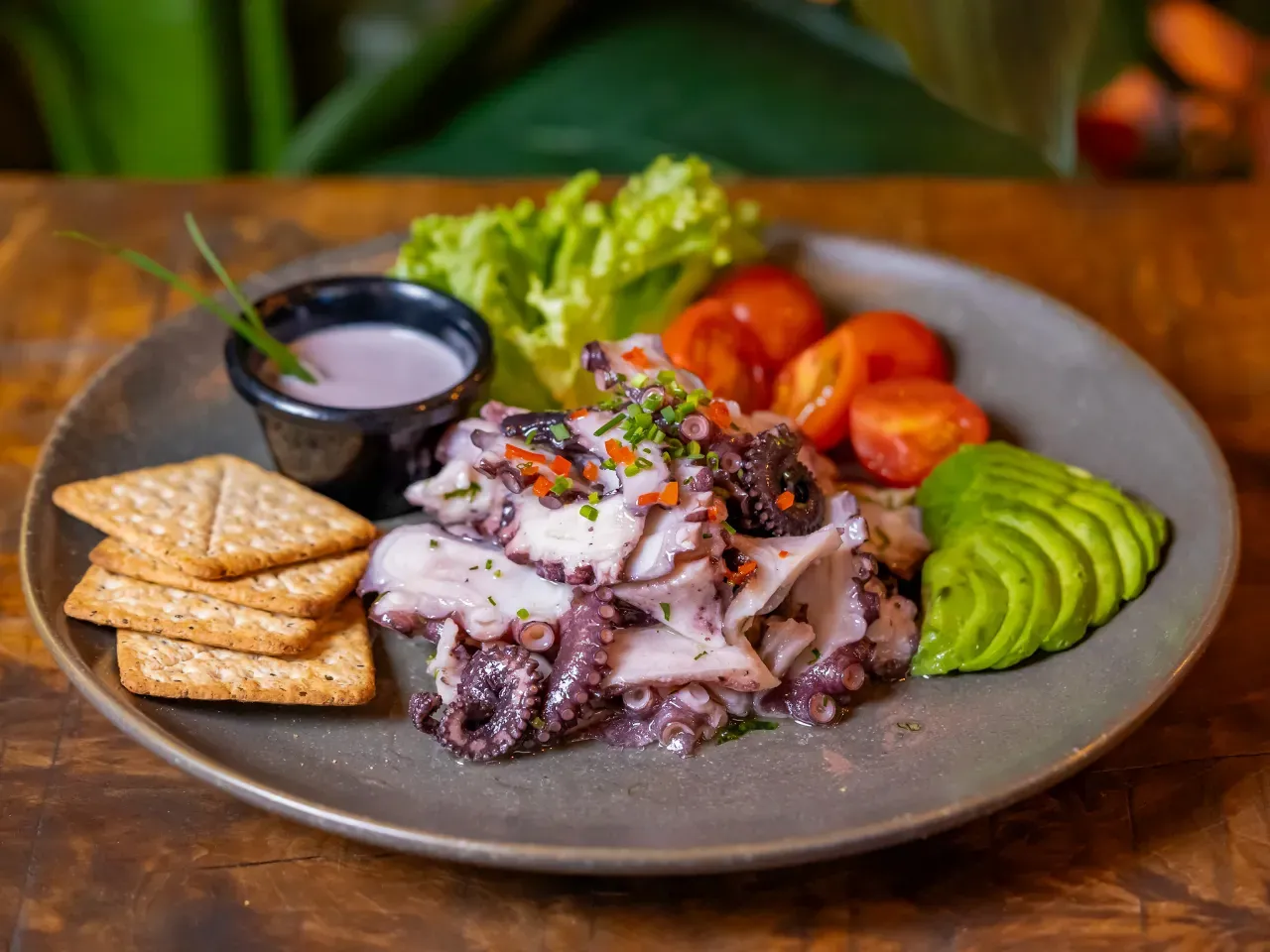 Pulpo fresco en salsa de olivo, terminado con palta, acompañado de galletas de soda.