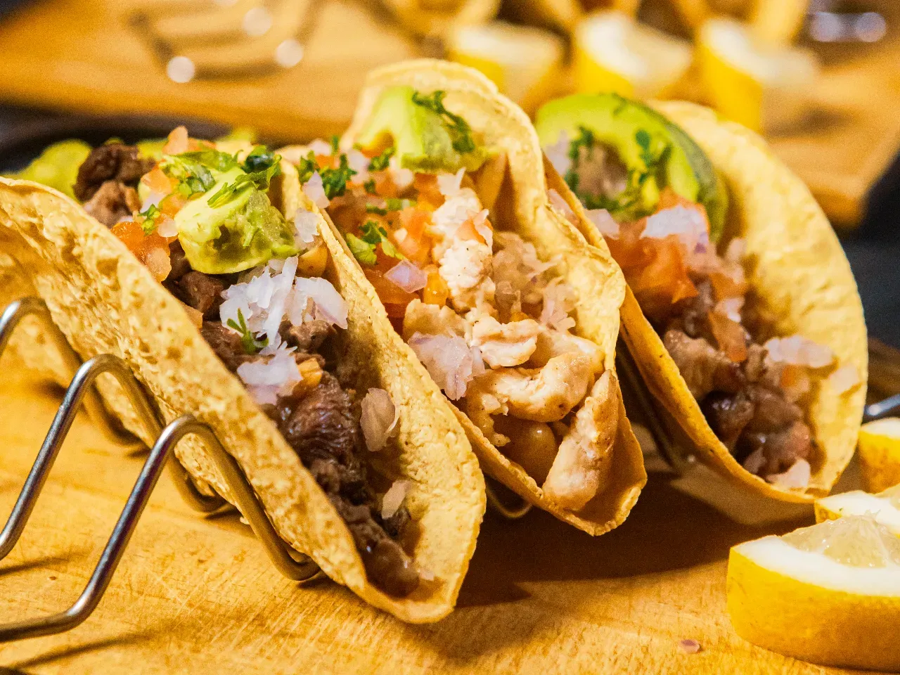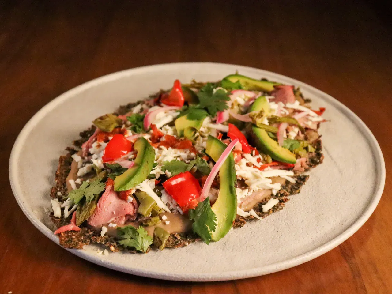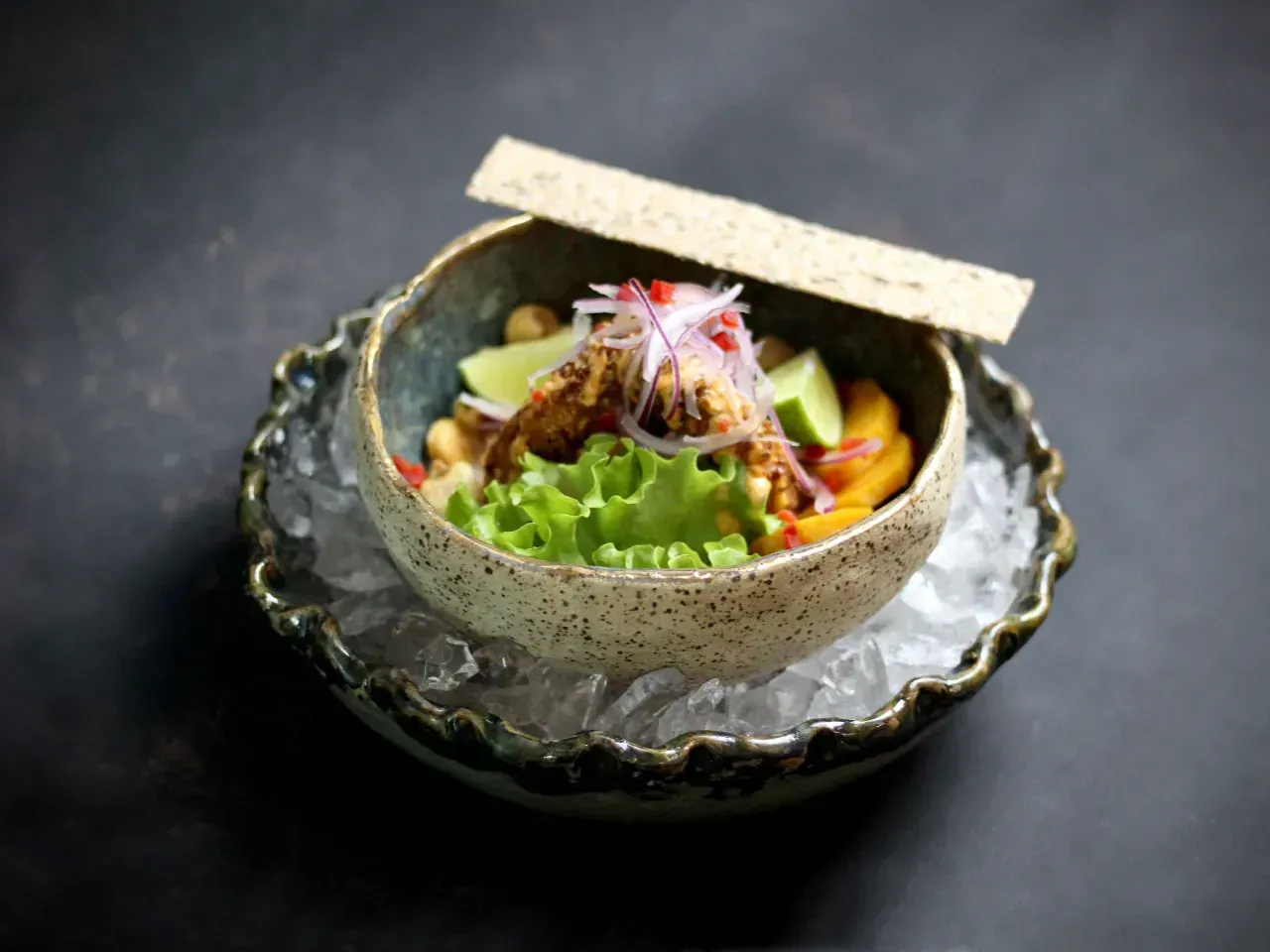 Tortillas de maíz crujiente con puré de palta, ceviche limeño, crema salsa acevichada y ajies encurtidos.