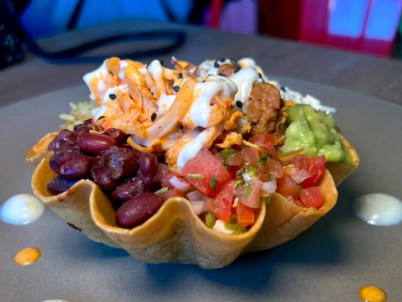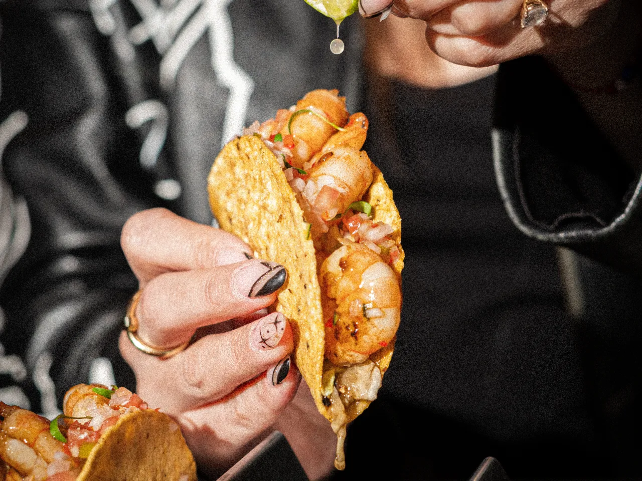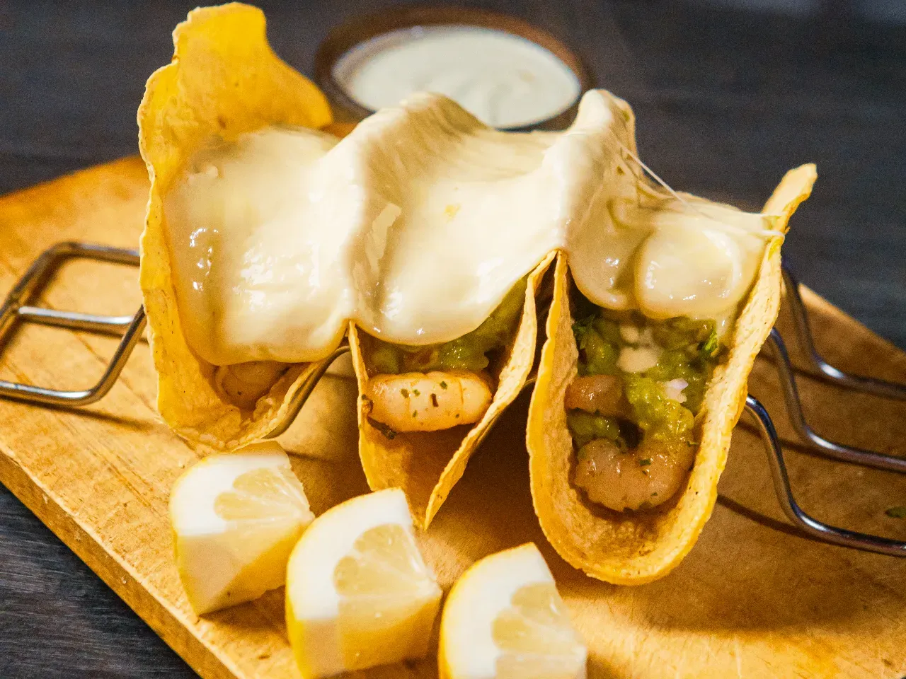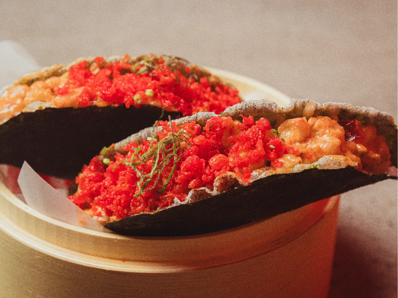 Tortilla de maíz frita, camarón, sweet chilli, repollo al wok, pico de gallo y katsuobushi (2u)