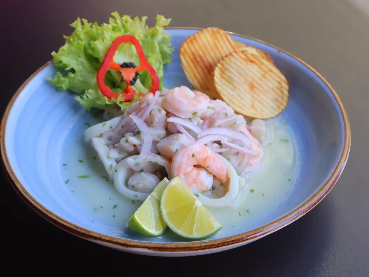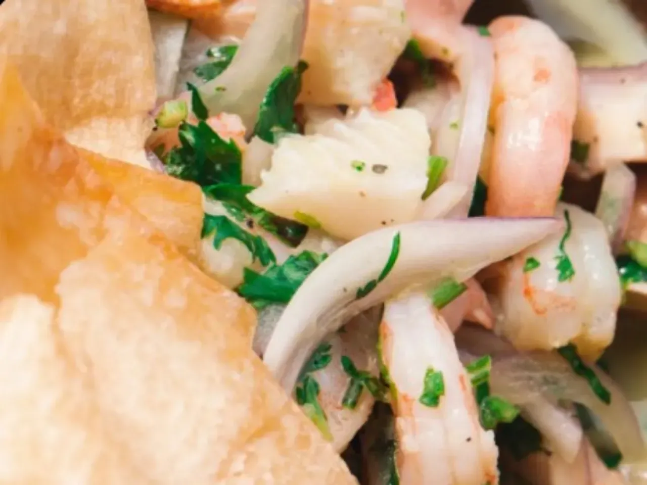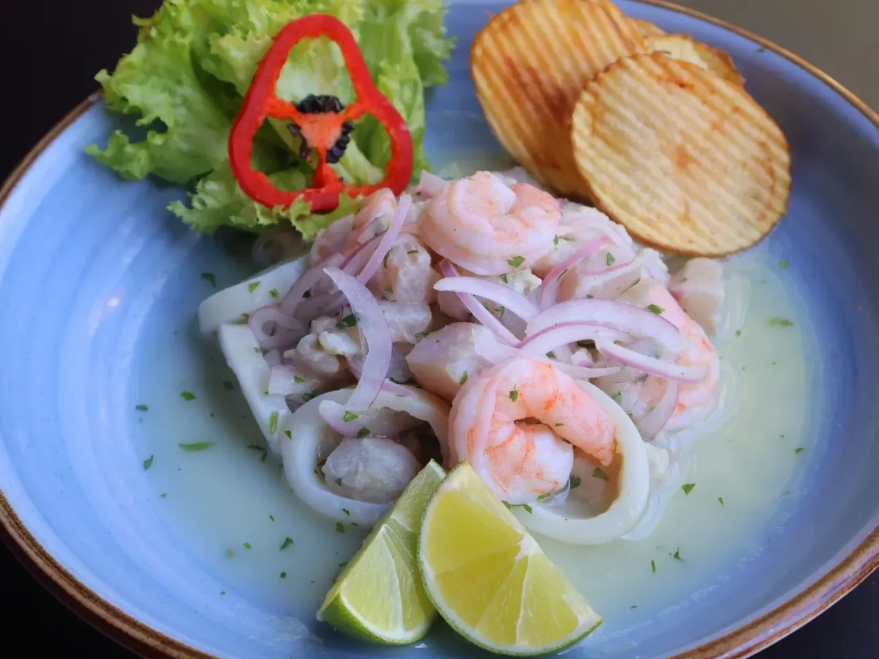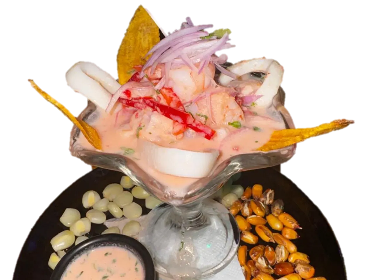 Mixtura de mariscos y pescado, previamente cocidos y marinados en jugo de limón de pica, leche de tigre, cebolla y especias.