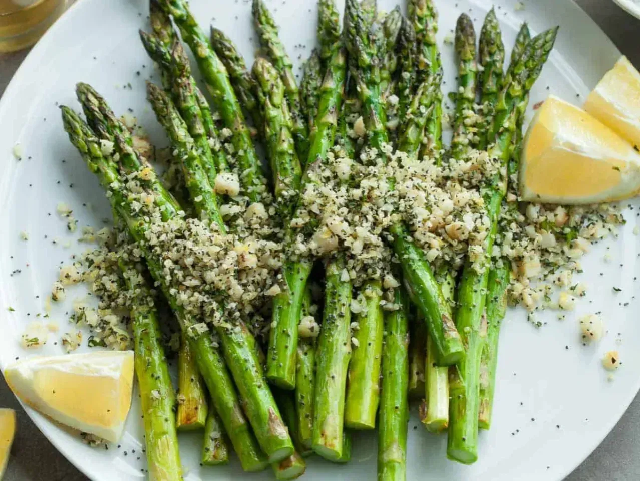 Finas lacas de verduras de la temporada acompañada de salsa de mostaza Dijon, miel y parmesano con hojas frescas