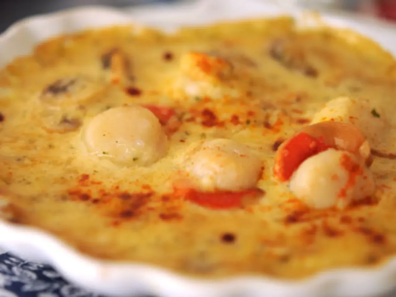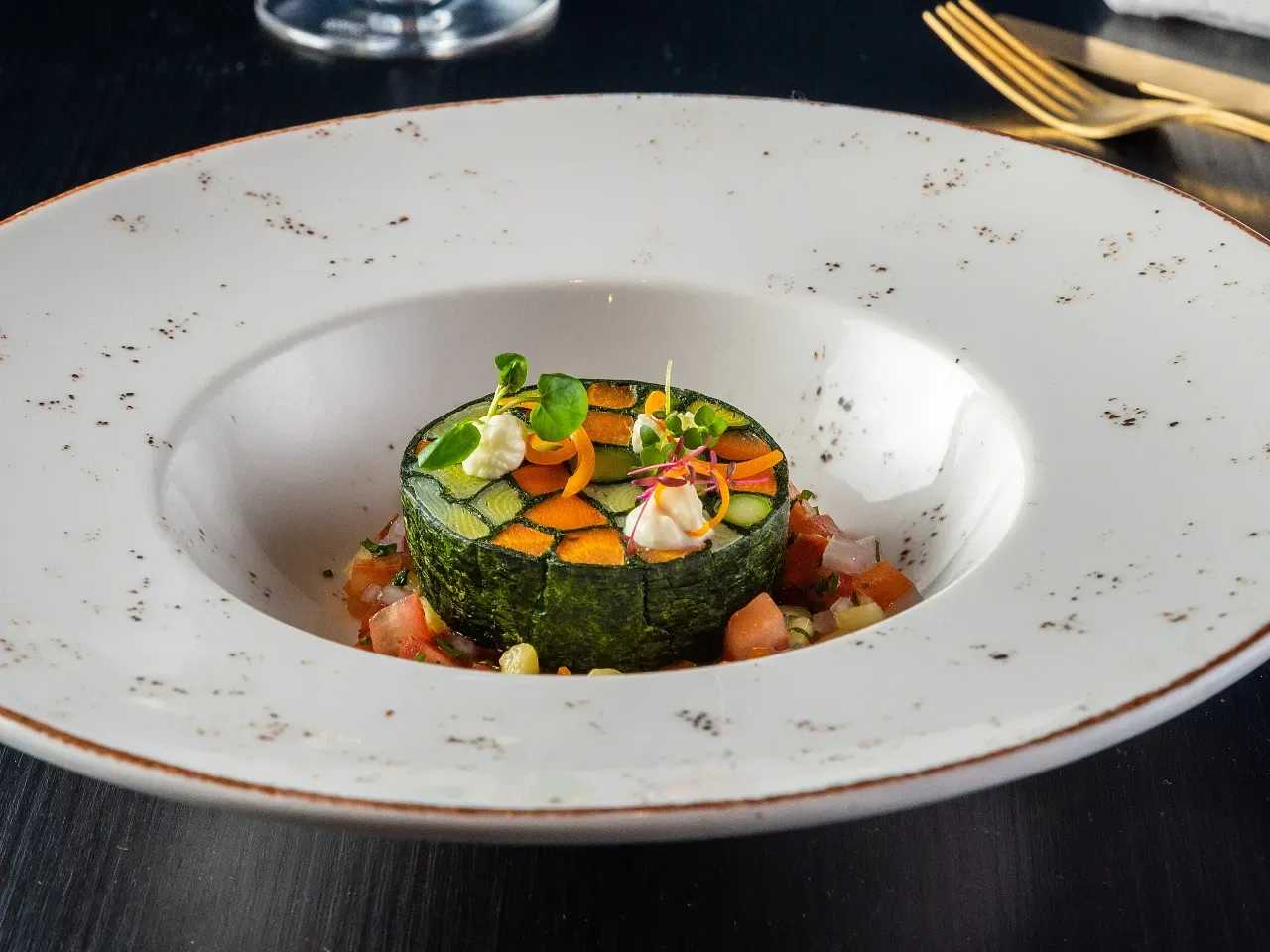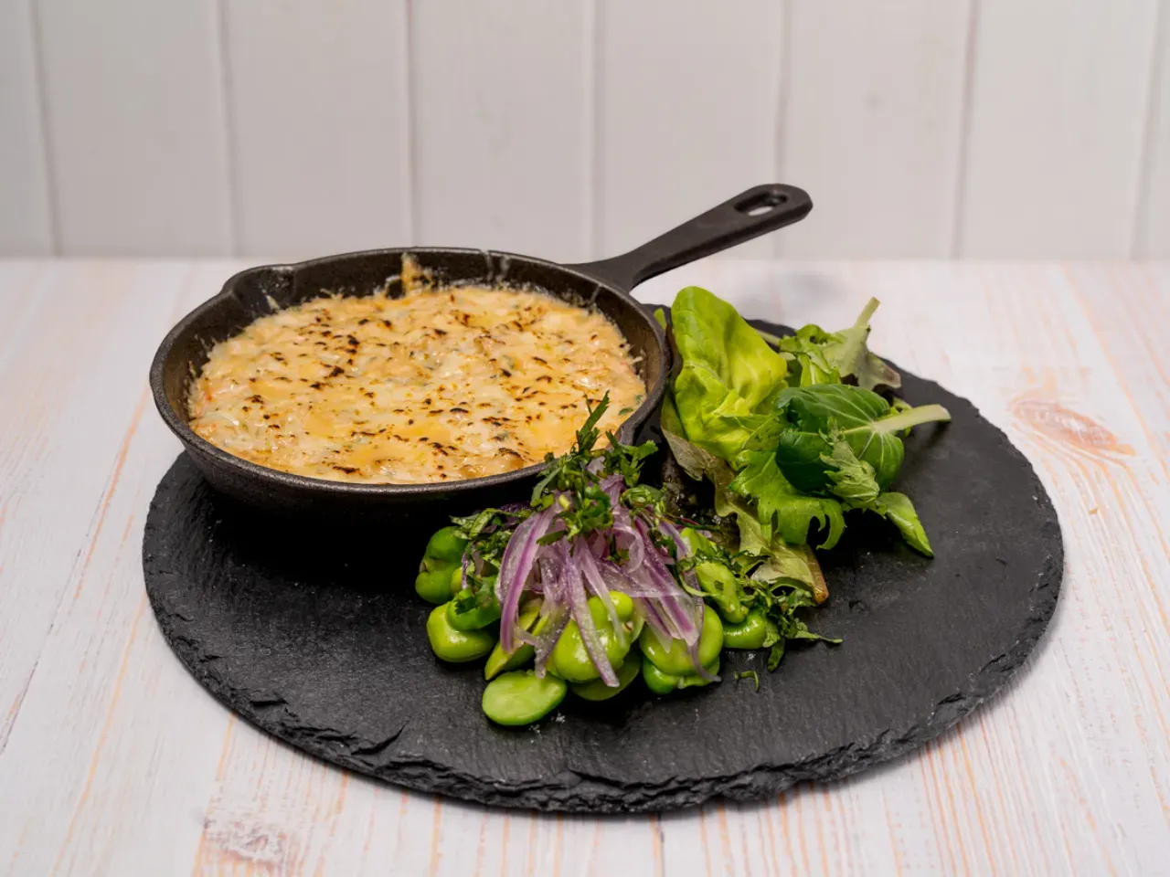 Verduras de la temporada gratinada con leche y queso de origen vegetal, delicadamente sazonada
