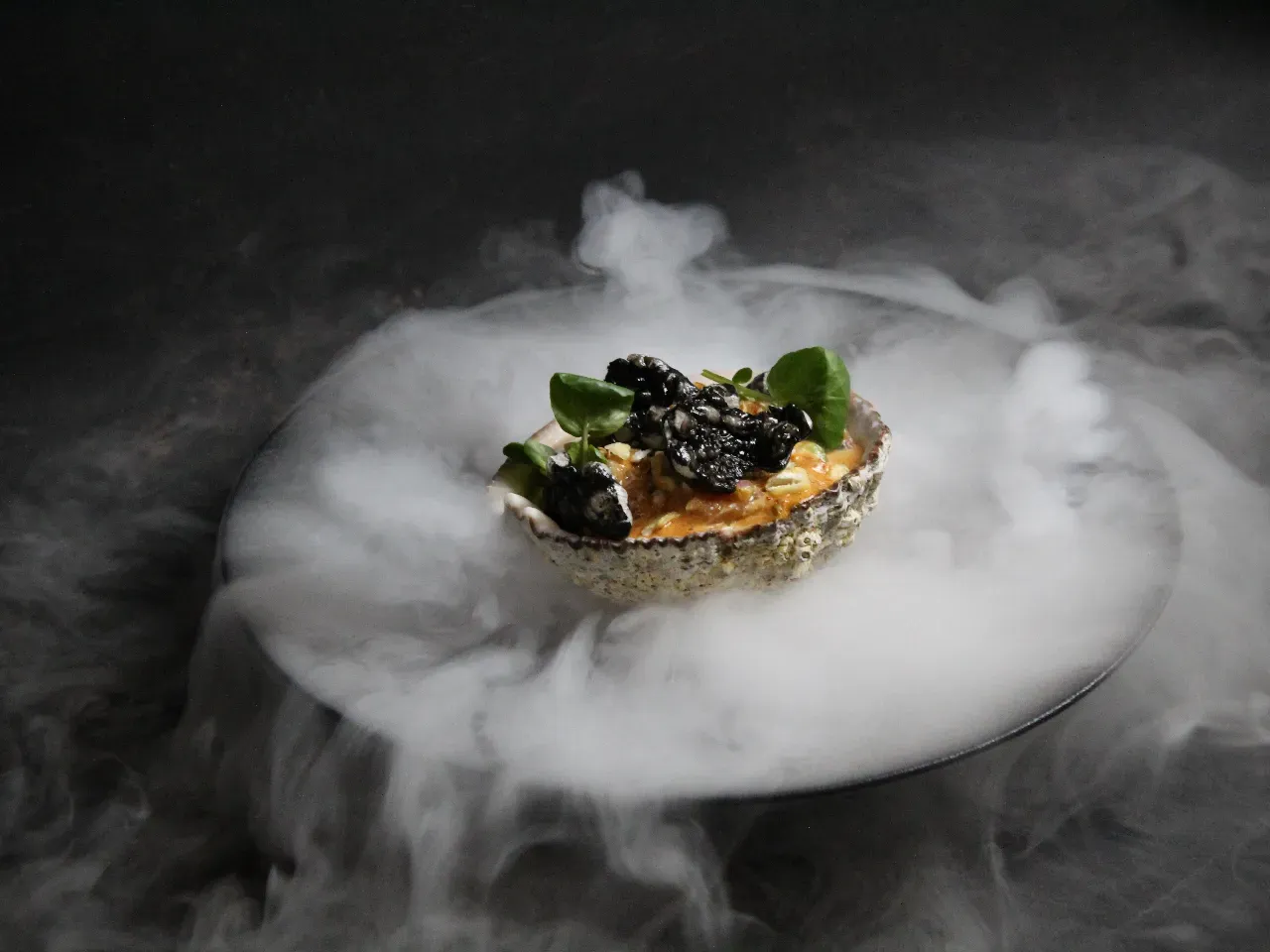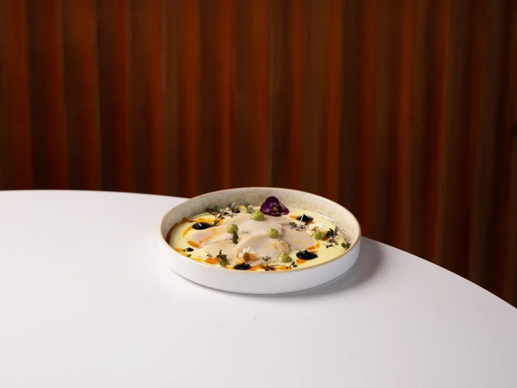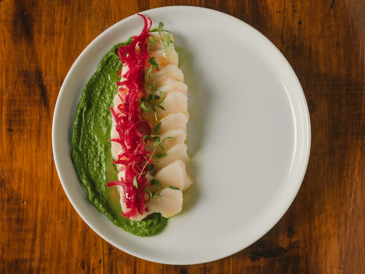 Láminas de locos marinados con aceite de oliva y jugo de limón. Servido con mayonesa acevichada de ají amarillo, aceite de clorofila y polvo de tinta de calamar.