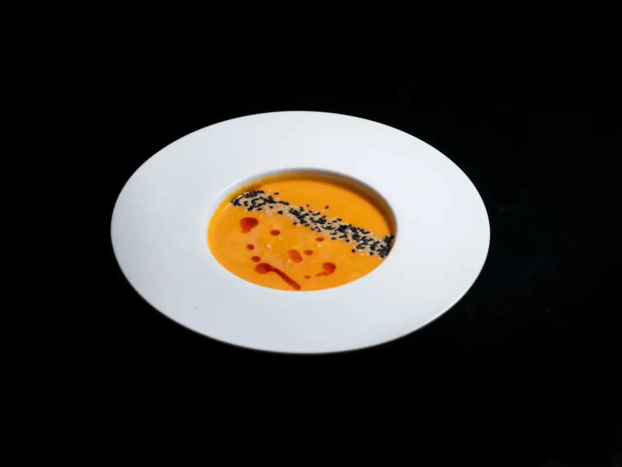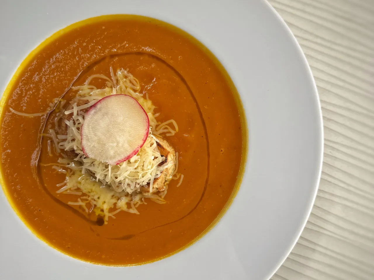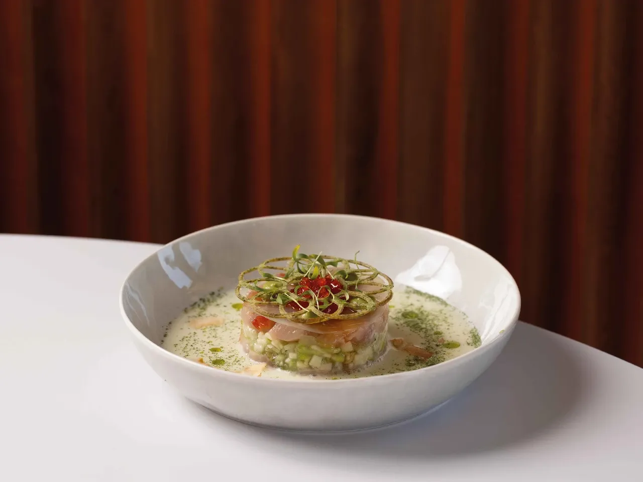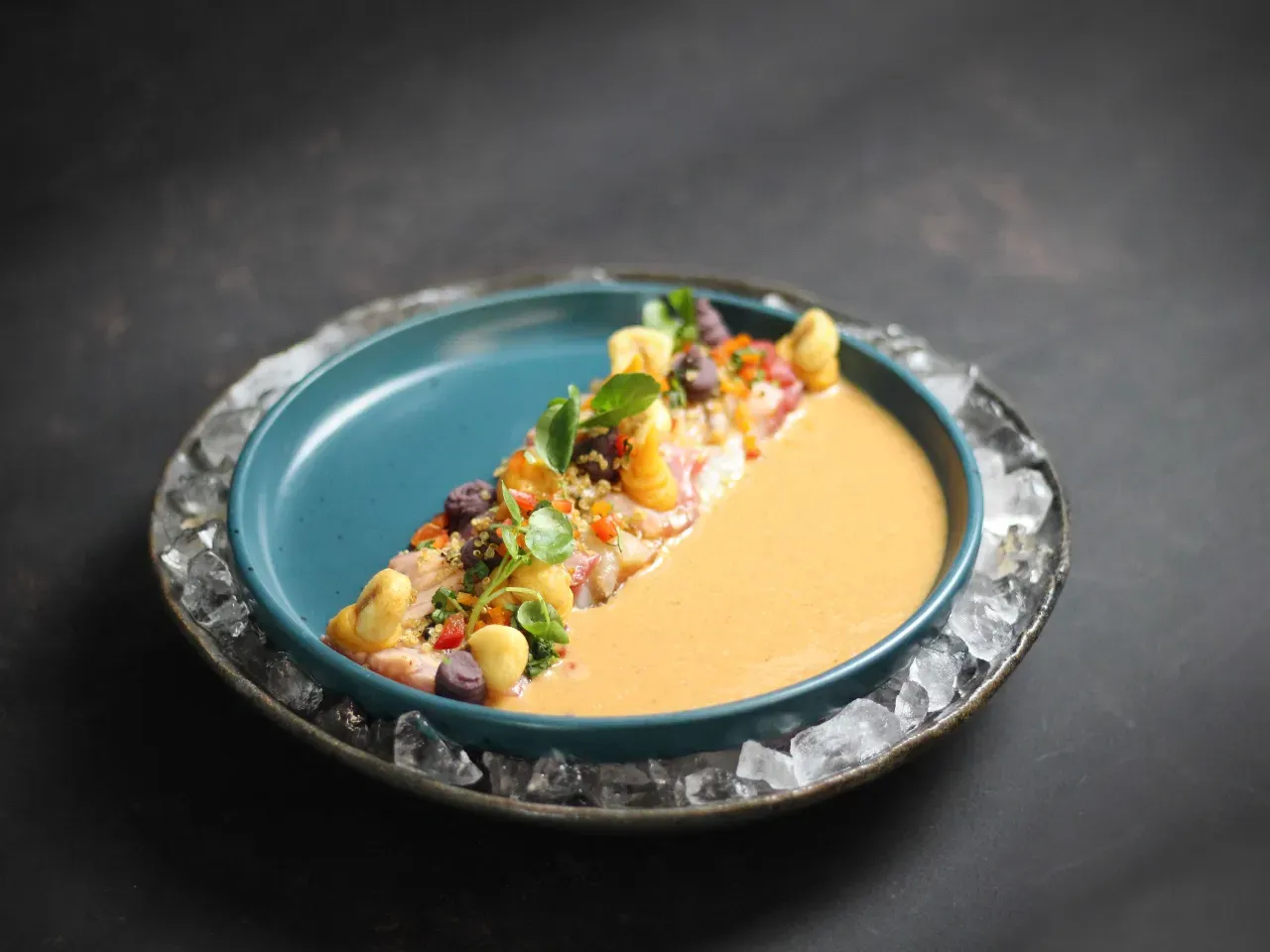 Sopa fría de almendras y ajo, trabajada hasta lograr una textura sedosa y delicada. Se acompaña de una mini ensalada de camarones nacionales, con pepino previamente desaguado para potenciar su frescor, aliñado con sal, pimienta y zest de limón. Un plato fresco y elegante, donde la suavidad del gazpacho contrasta con la textura y el …