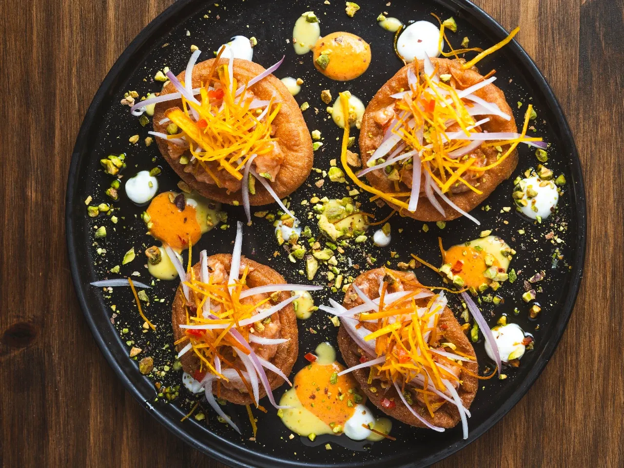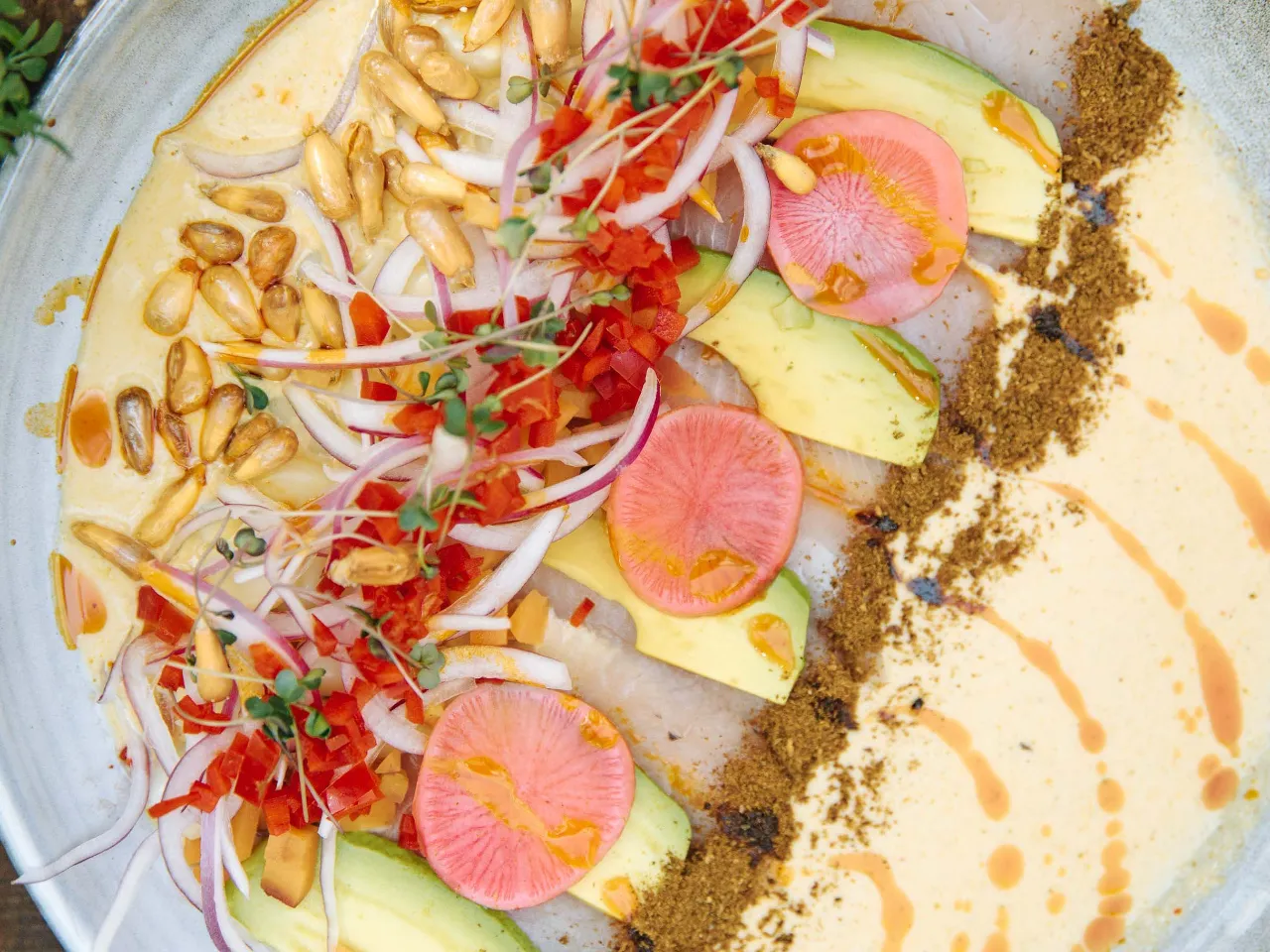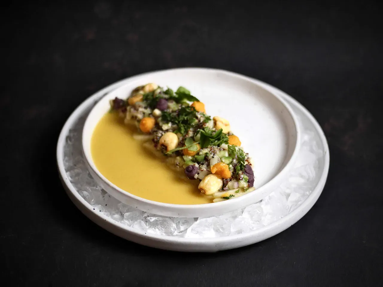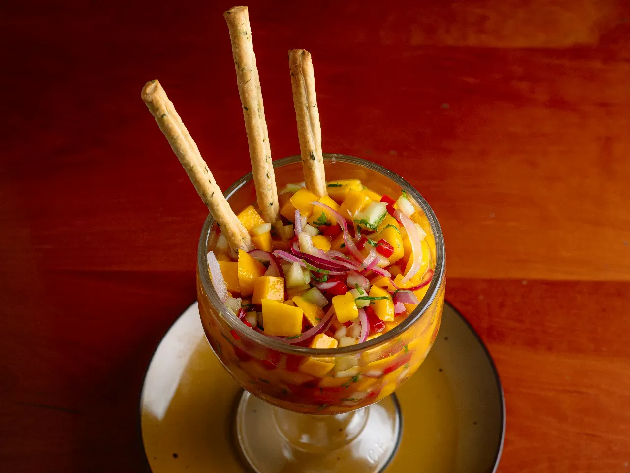 Versión india del clásico Ceviche Peruano con cebolla morada, pepino alaska, pimentones, nabo y cilantro aderezado con nuestra leche de tigre vegana con un toque de chaat masala.