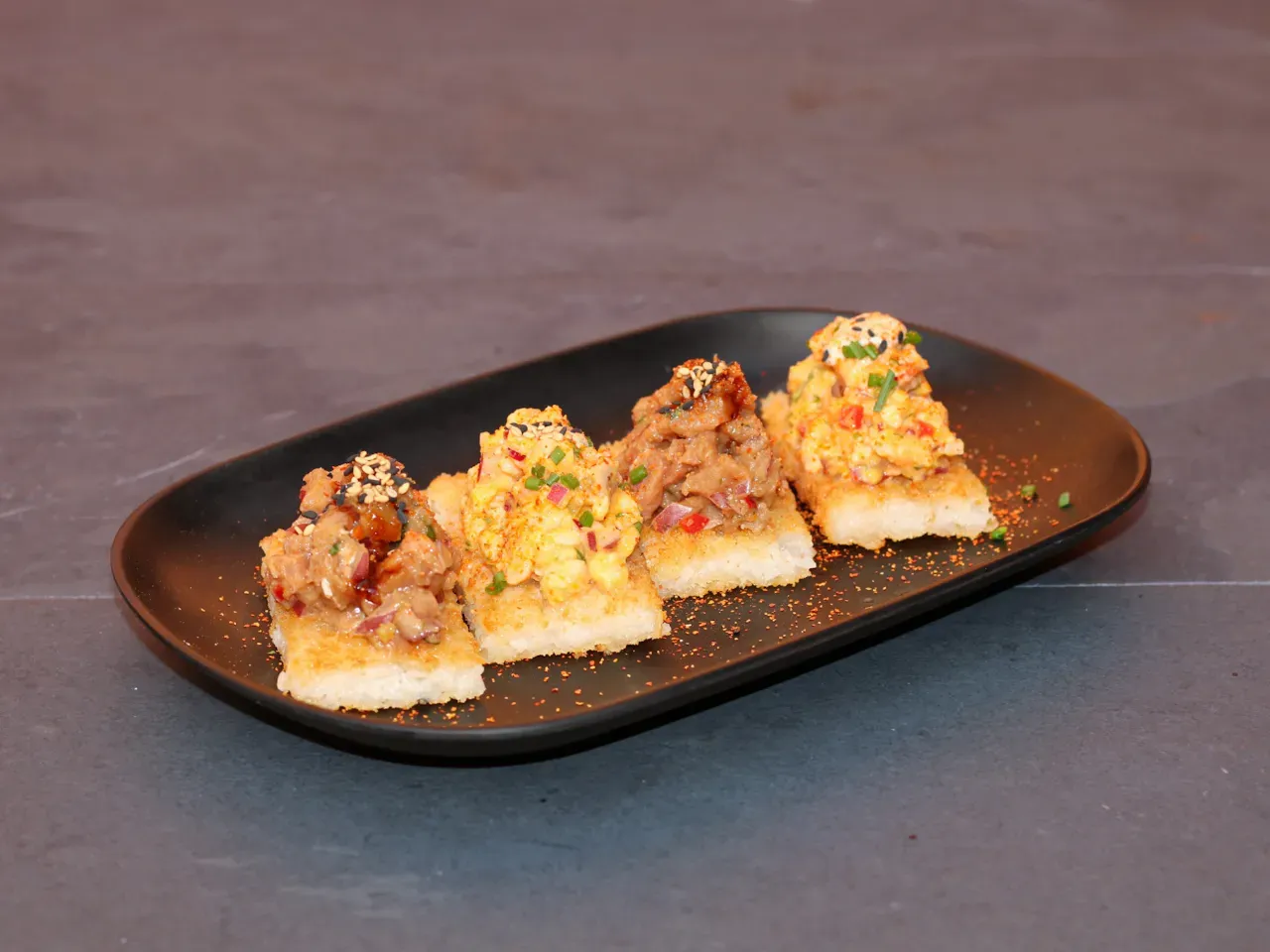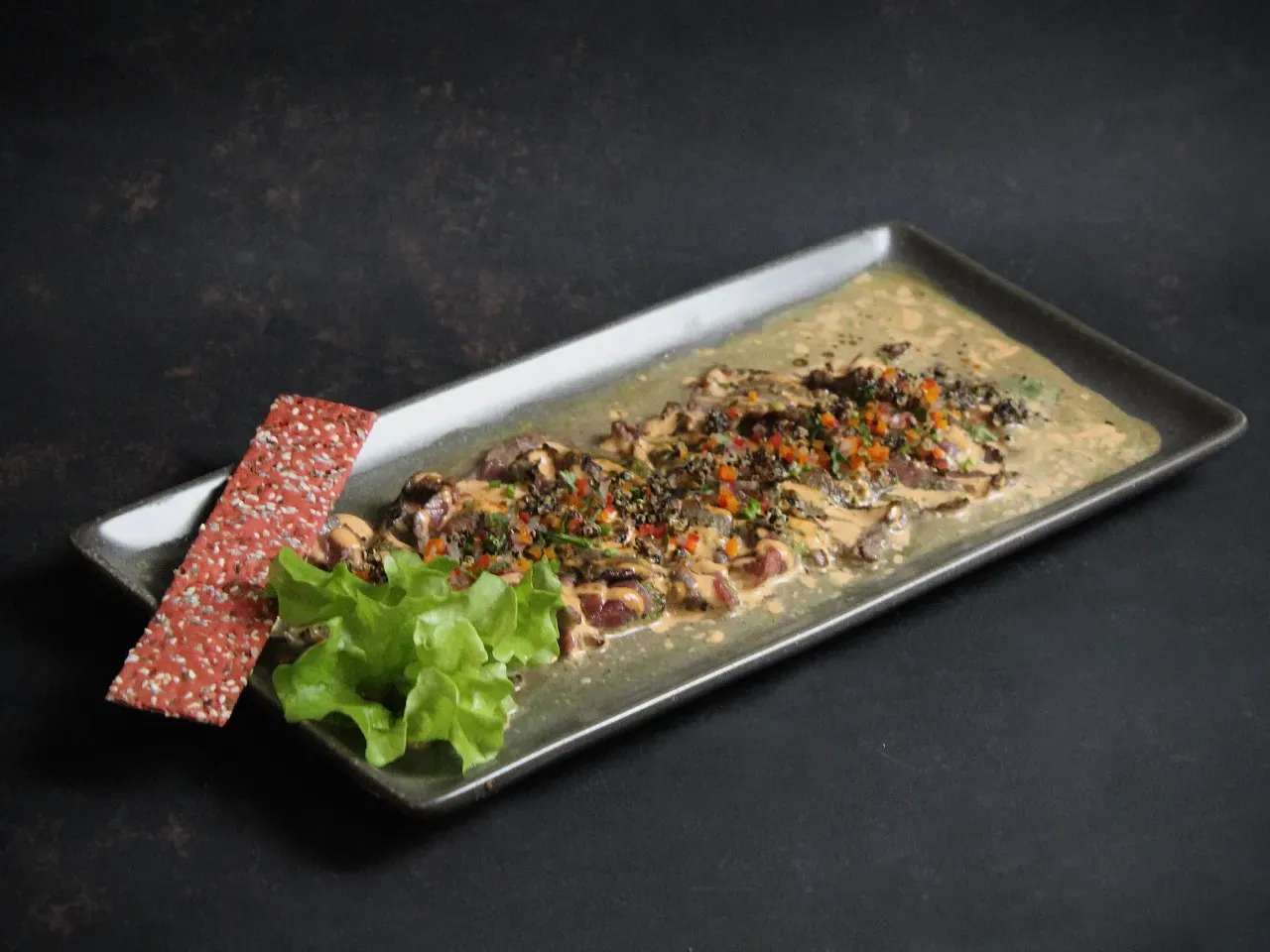 Crocante de Arroz con tartar de betarraga confitada en mantequilla e hinojo, mayonesa Teriyaki.