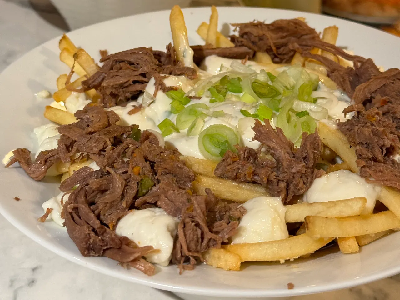 Papas fritas con queso cheddar, Pulled Pork de la casa, cebollin y crema acida