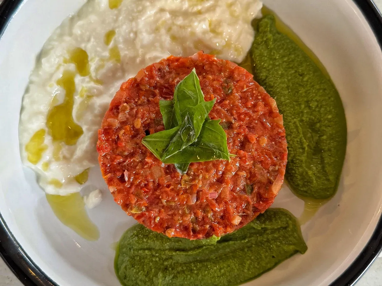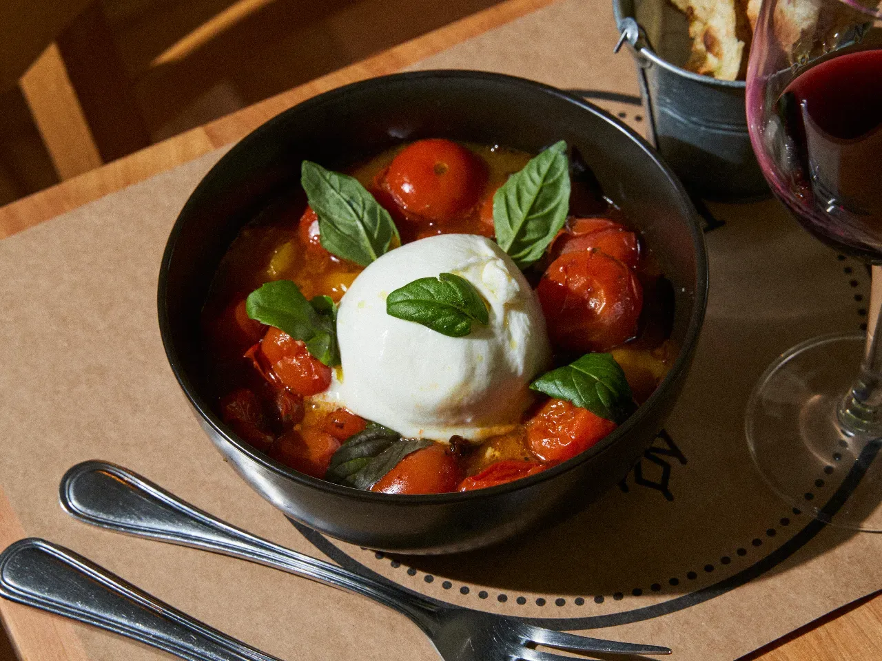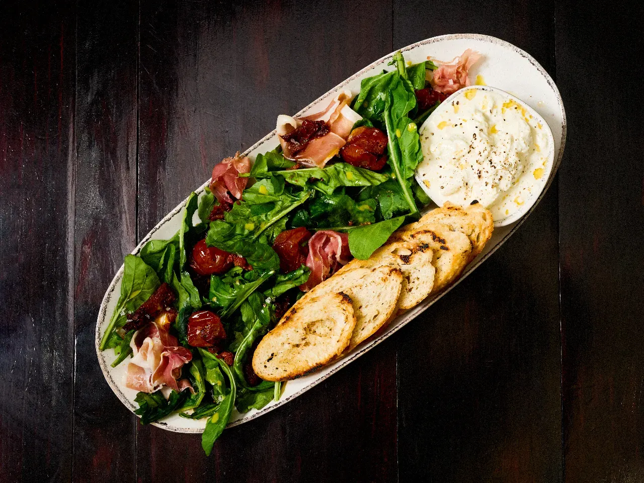 Burrata rellena de pesto con crujientes de serrano, mezclum y tomate uvalina.