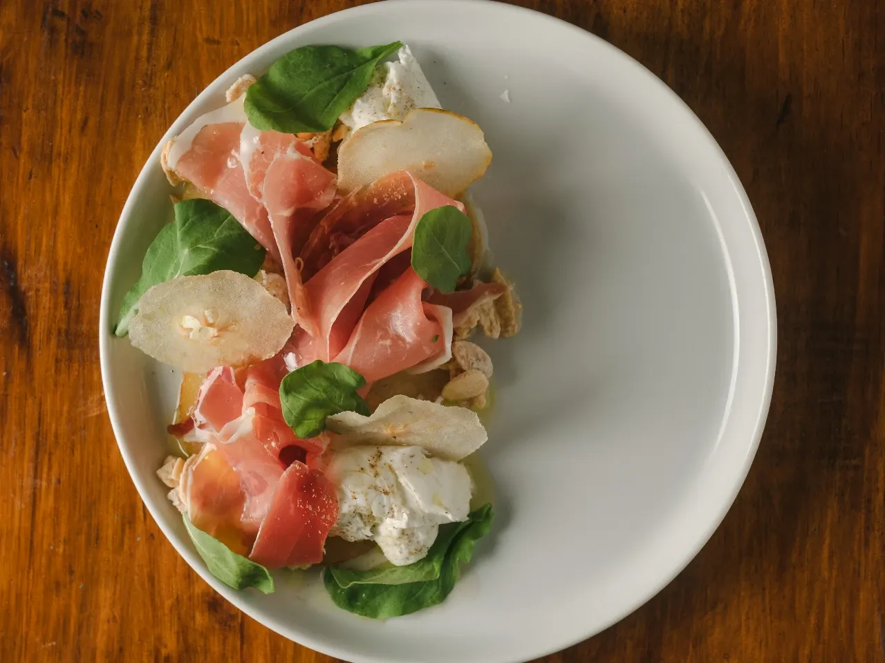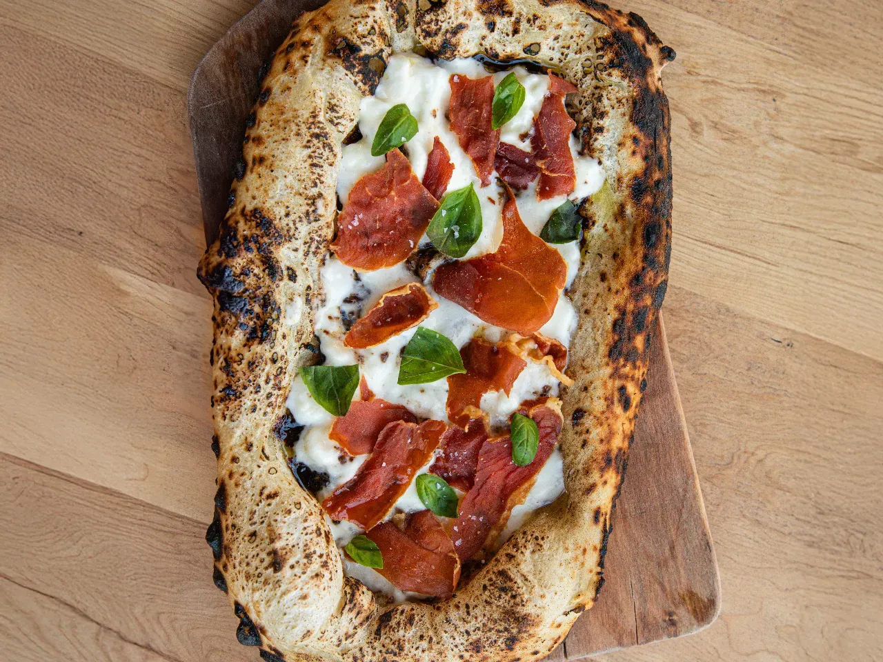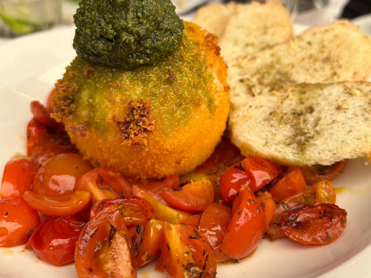 Burrata rellena de pesto con crujientes de serrano, mezclum y tomate uvalina.