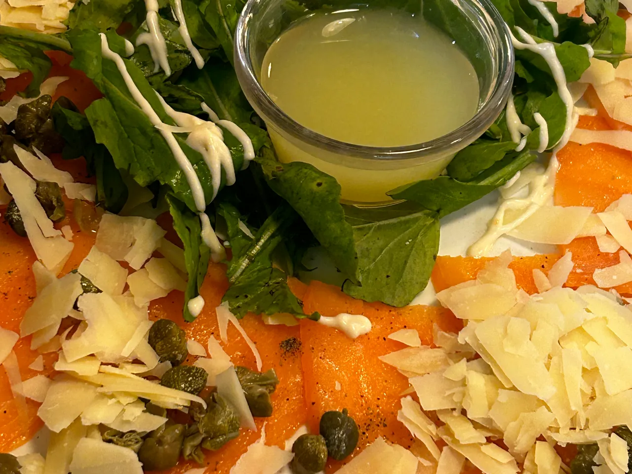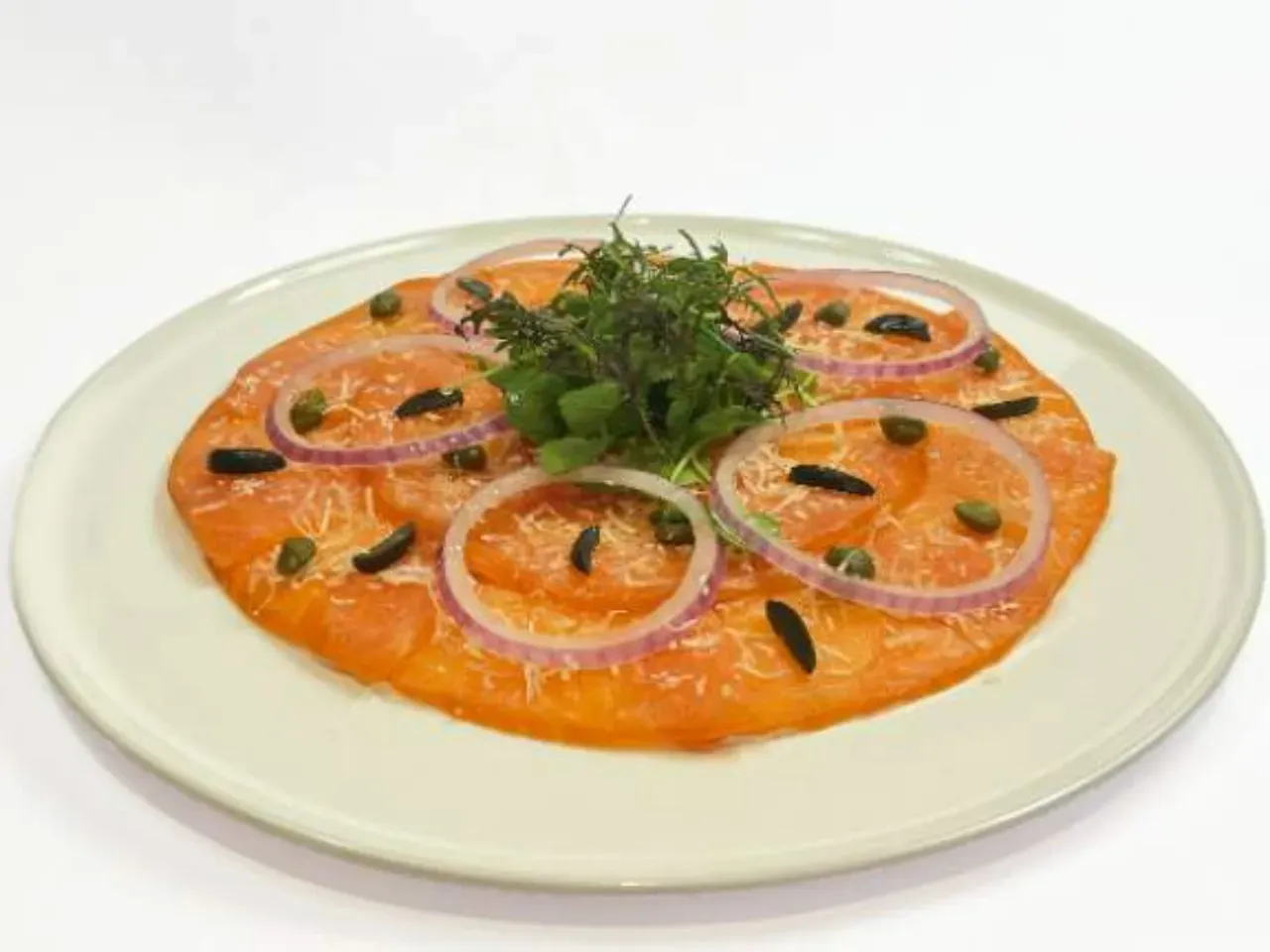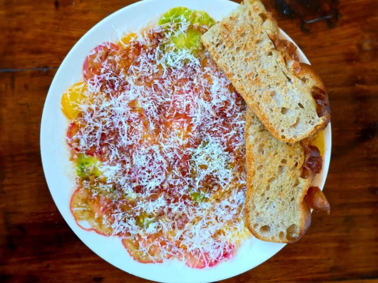 finas laminas de tomates de colores con un dressing de soya y aceto, finalizado con queso granapadano y cebolla morada en brunoisse.
