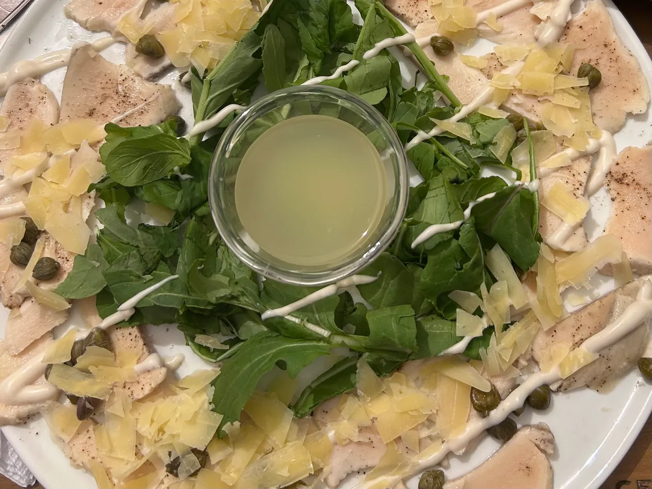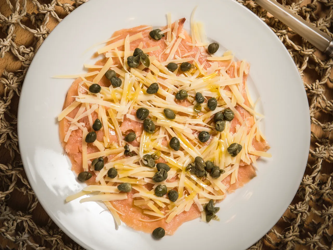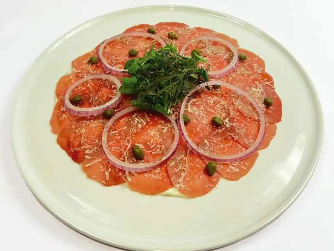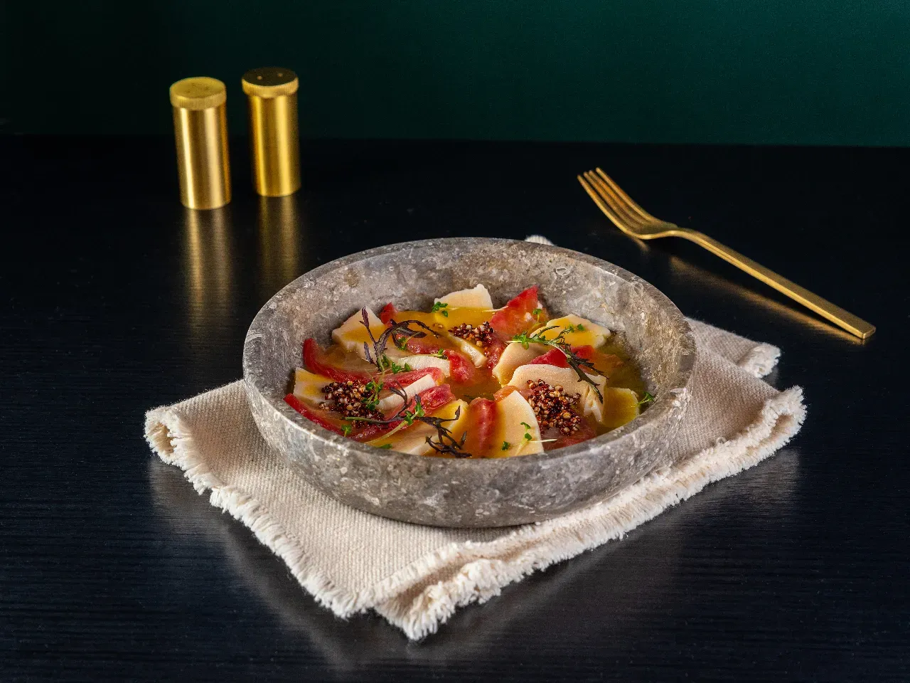 finas laminas de tomates de colores con un dressing de soya y aceto, finalizado con queso granapadano y cebolla morada en brunoisse.