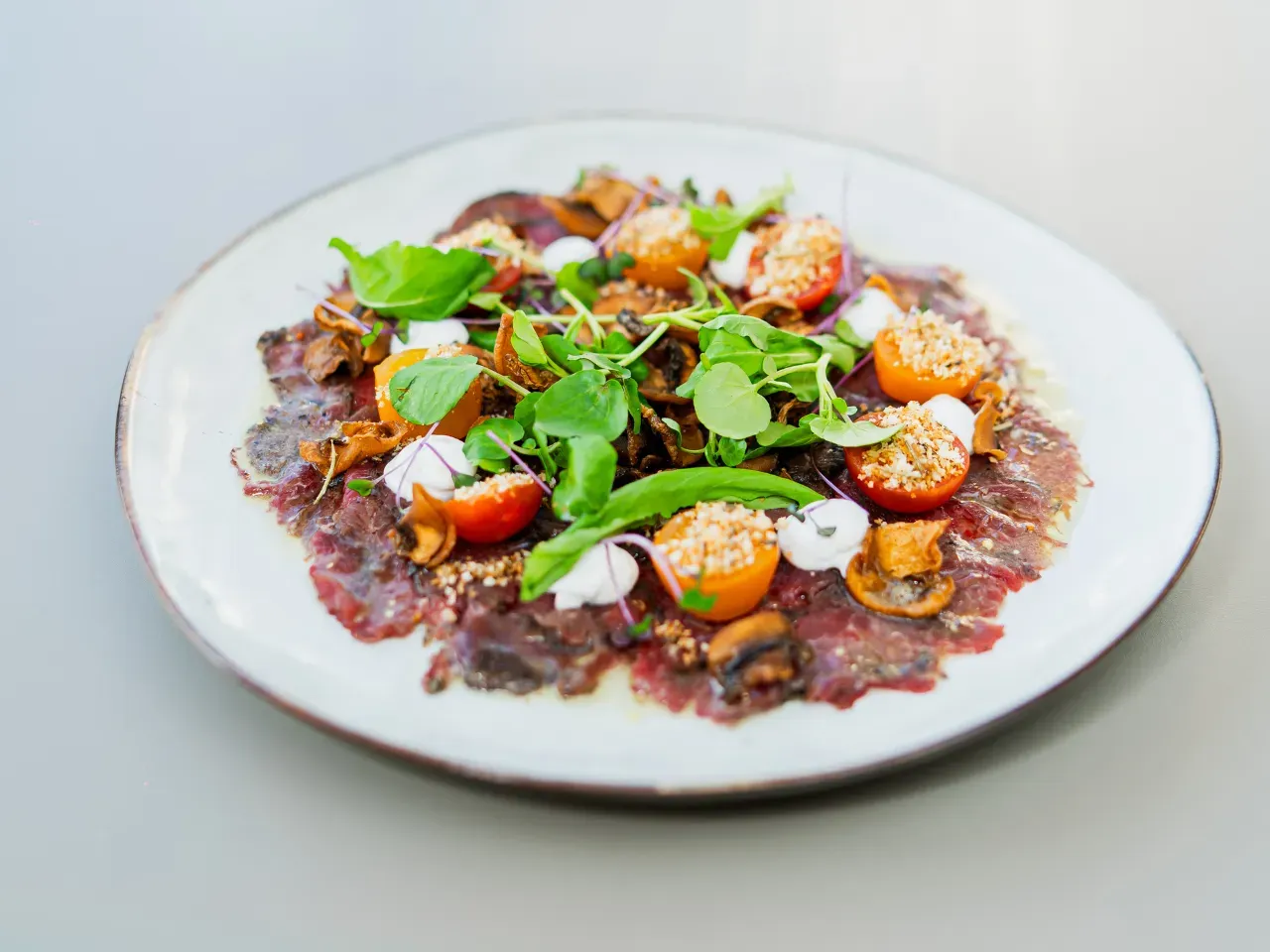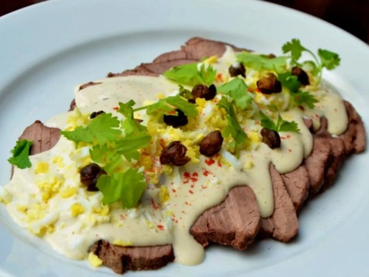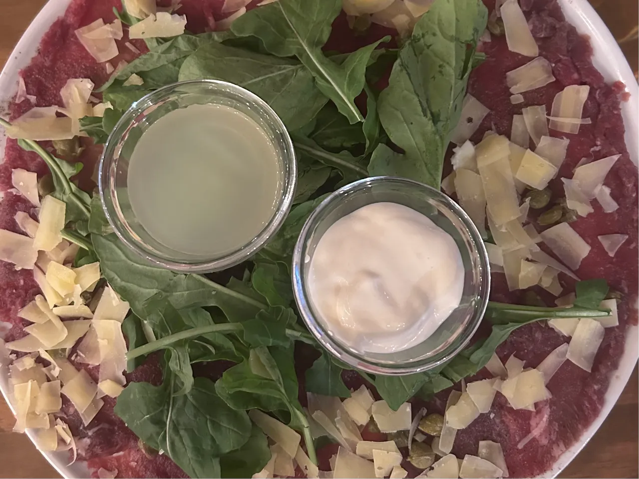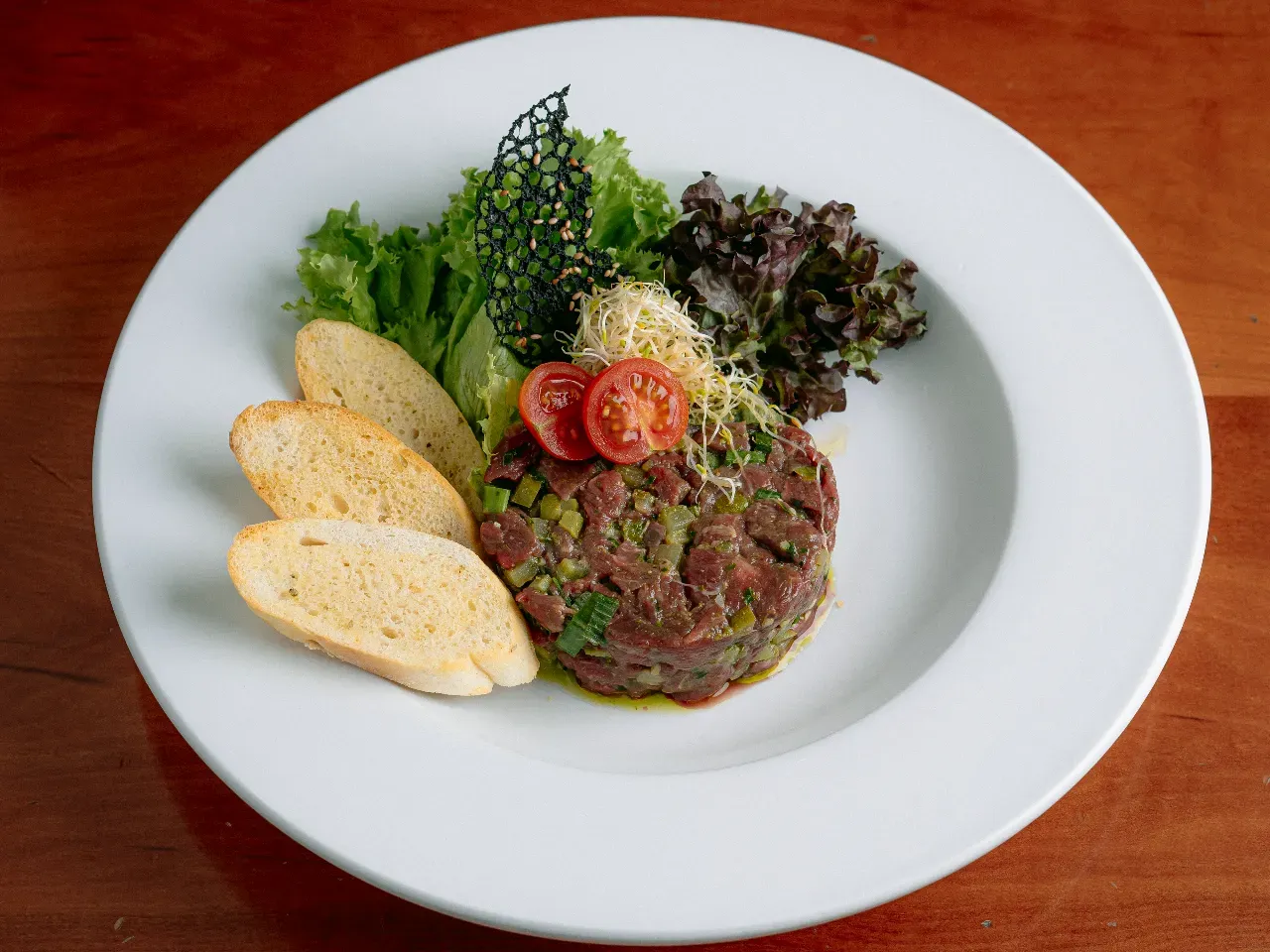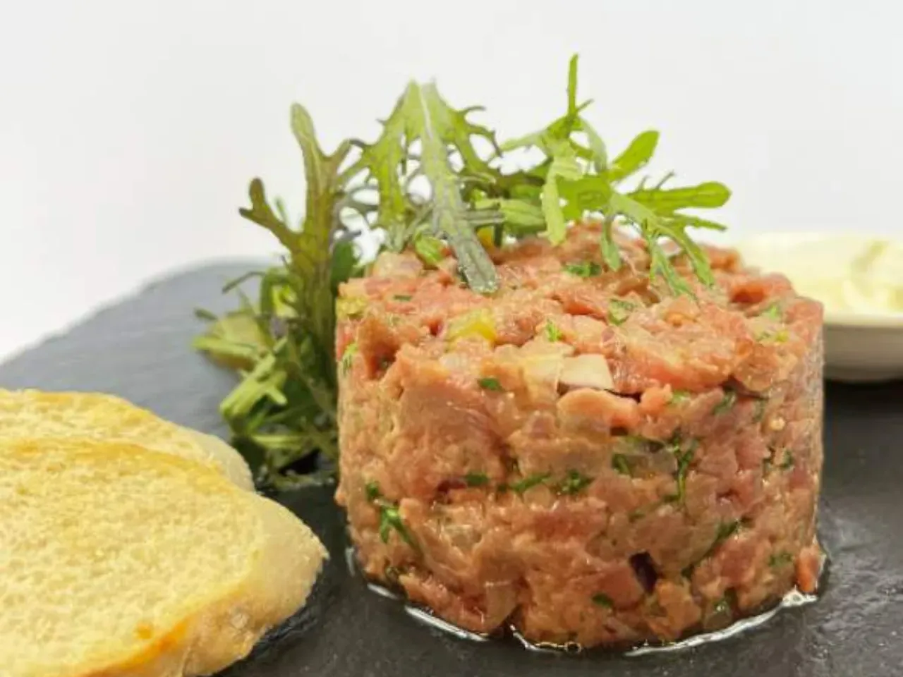 carne de filete finamente cortado, aderazado con mostaza alcaparras, mayonesa,pepinillos y cebolla, terminado con una mini ensalada y tostadas
