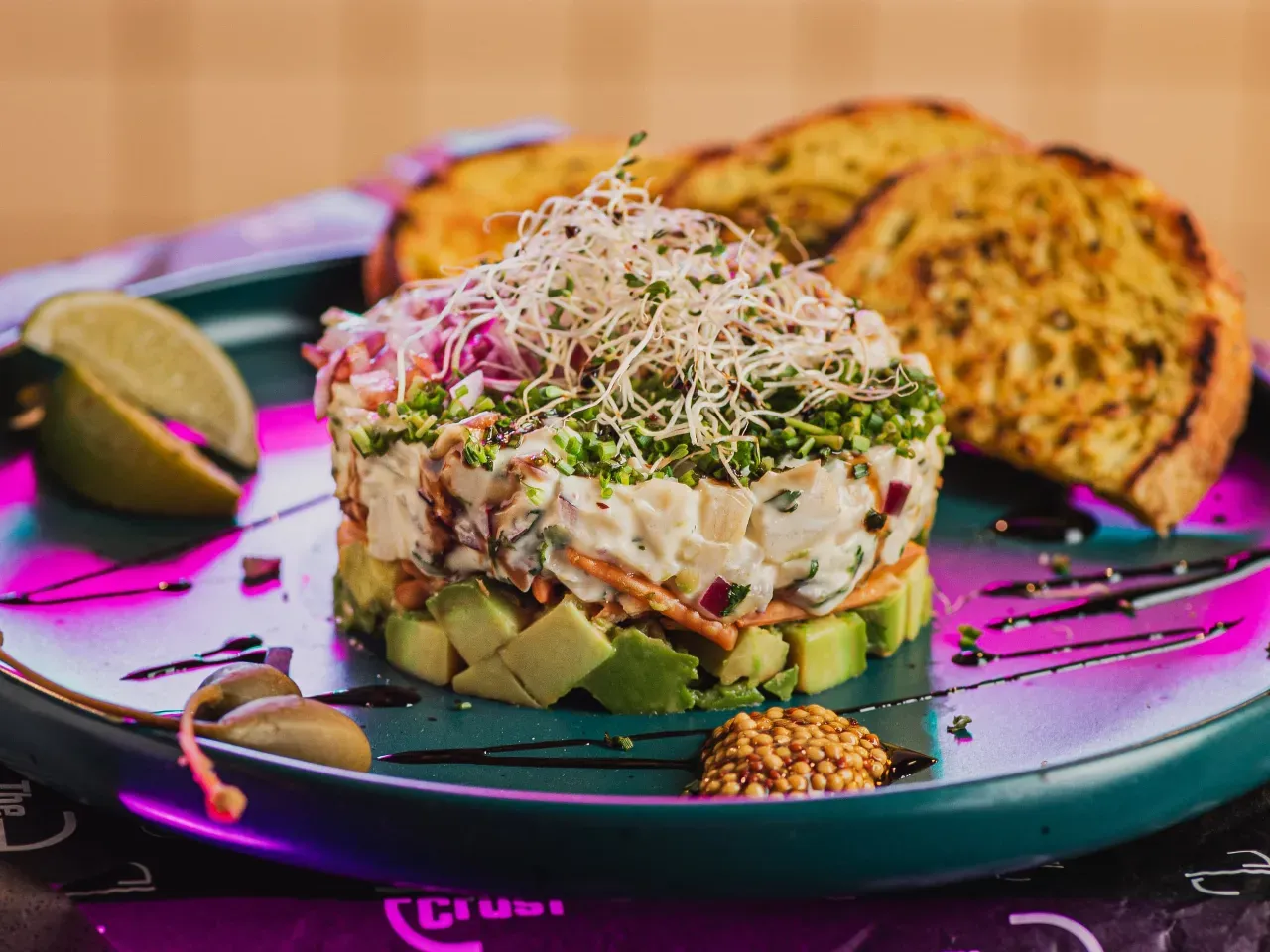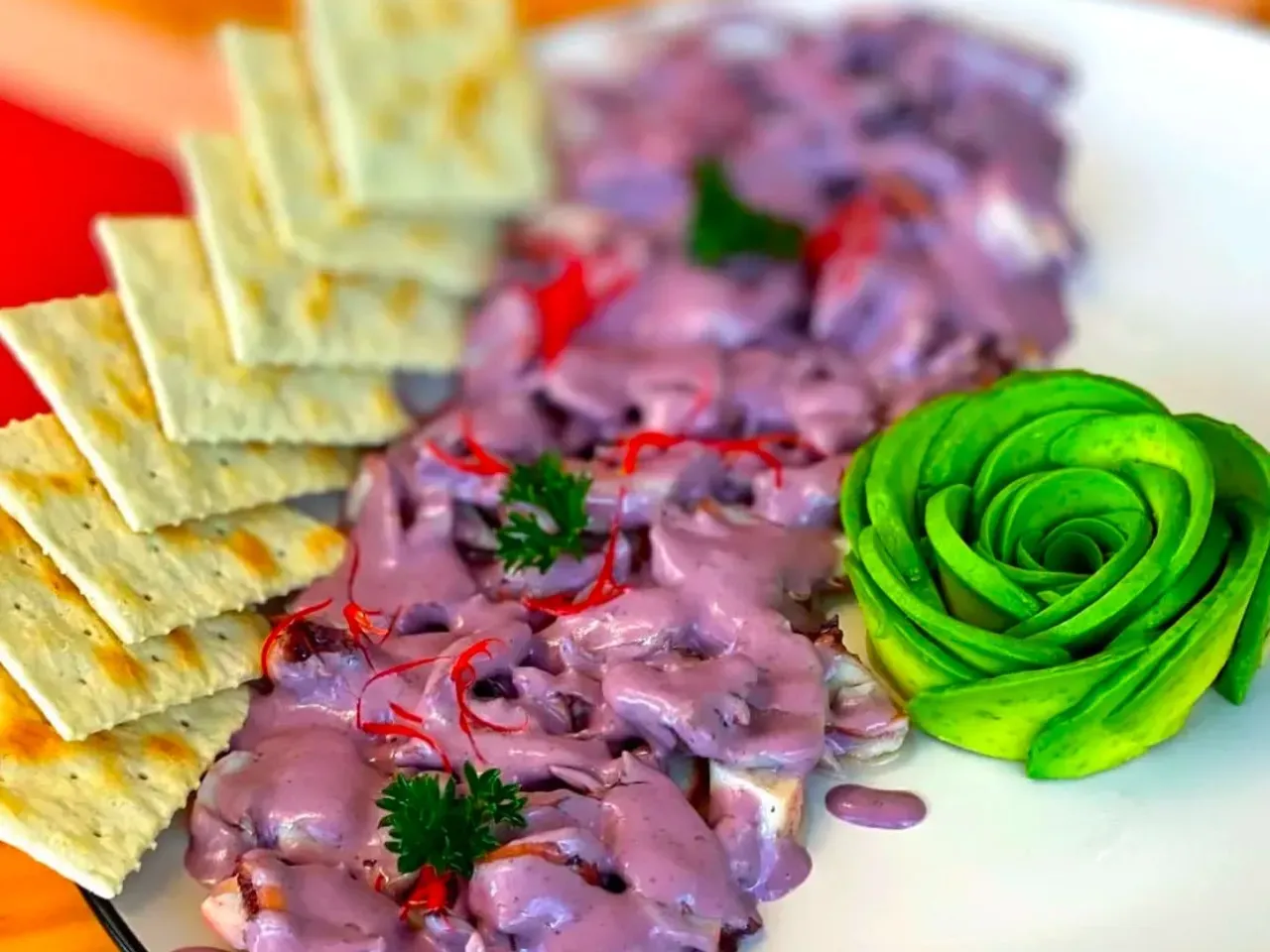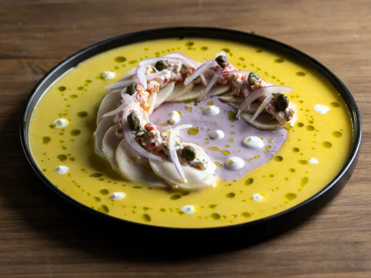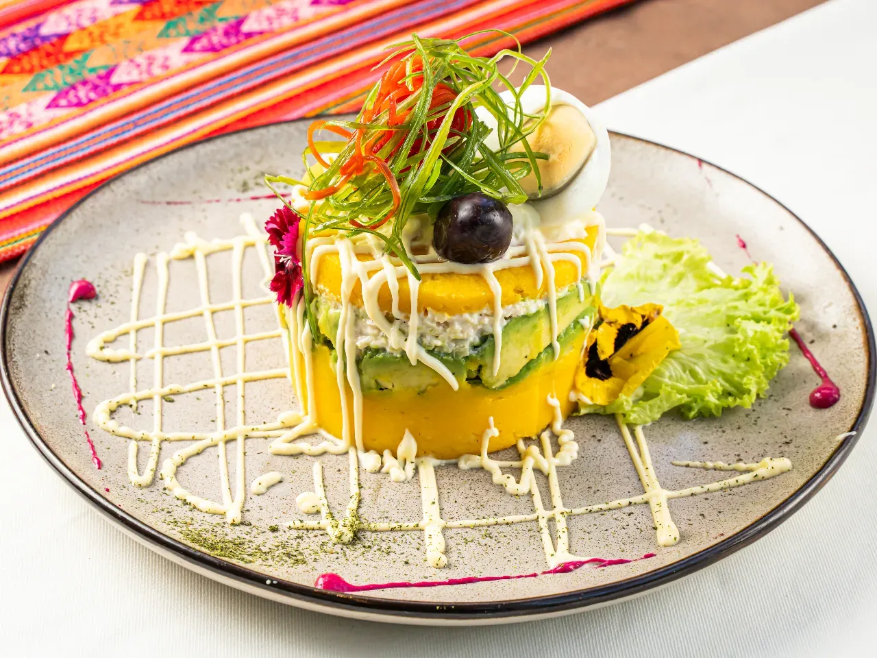 Suave causa de papa amarilla acompañada de jaiba fresca desmenuzada, ligada con mayonesa cítrica y toques de limón, acompañado de laminas crocantes de camote.