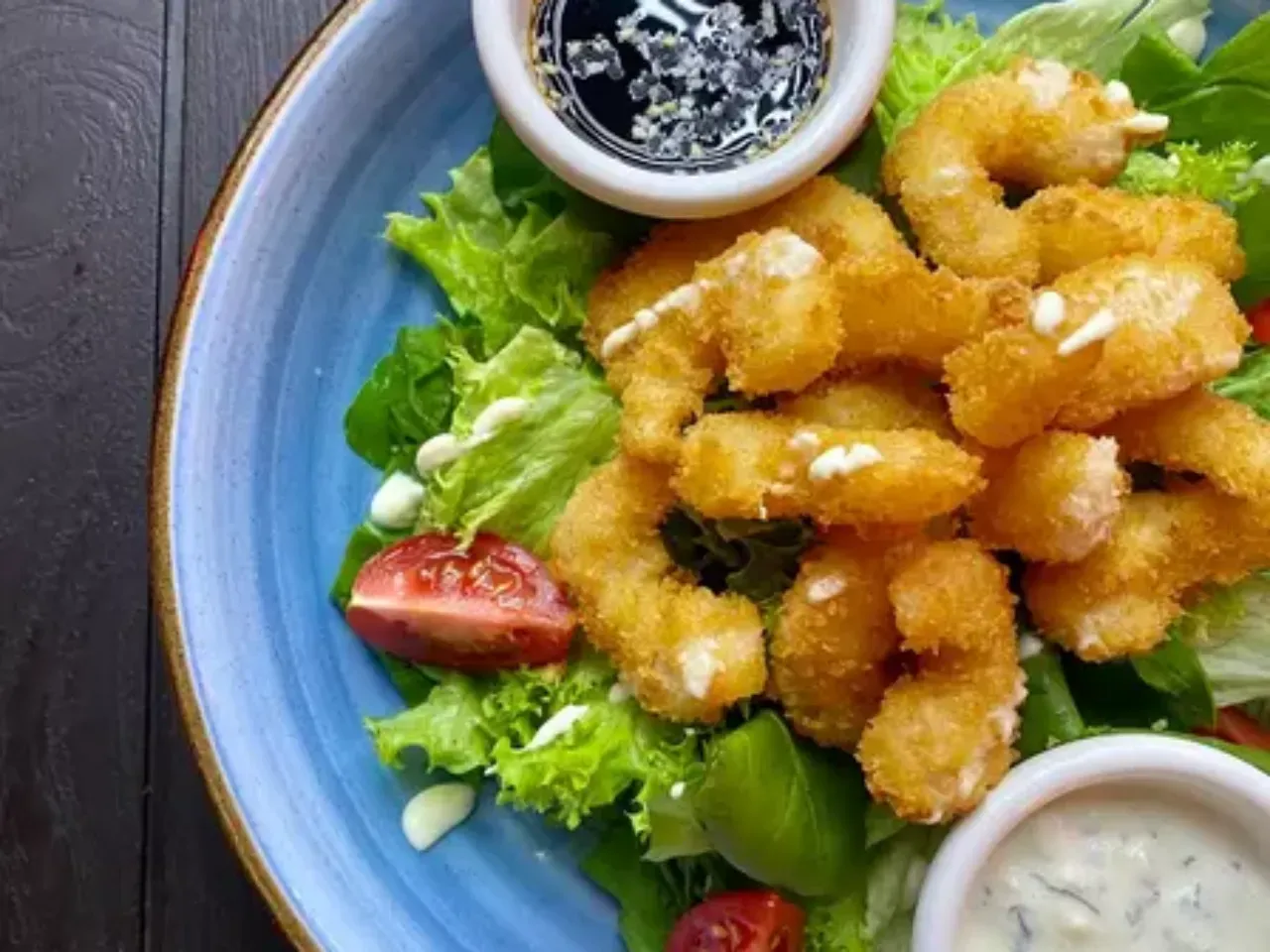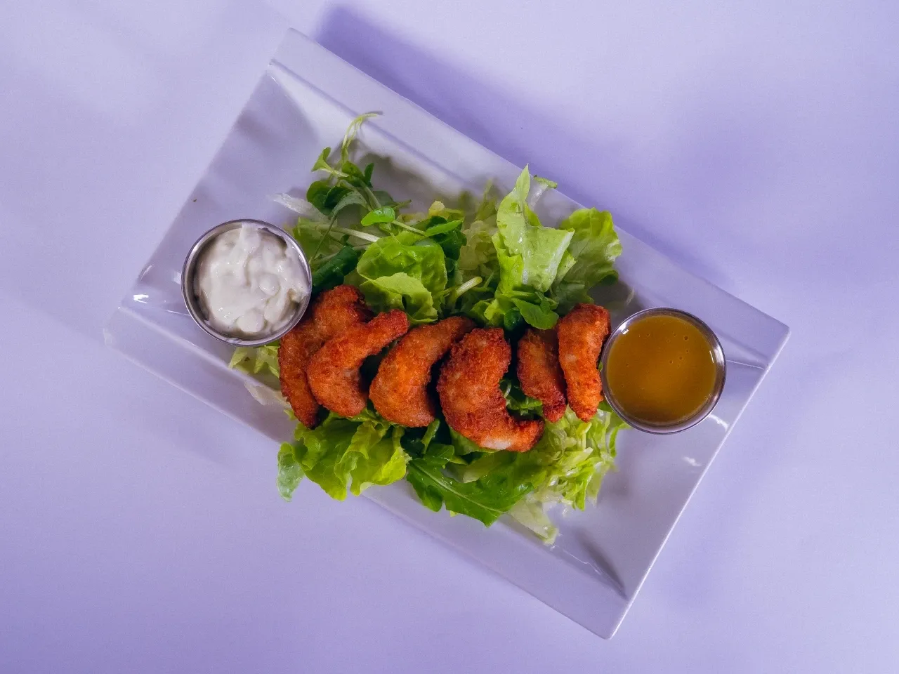 Crujientes aritos de cebolla fritos, acompañados de nuestra iconicas empanditas de queso con salsa pomodoro y la seleccion de los mas frescos, crujientes y delicados camarones apanados servidos con salsa de soya.