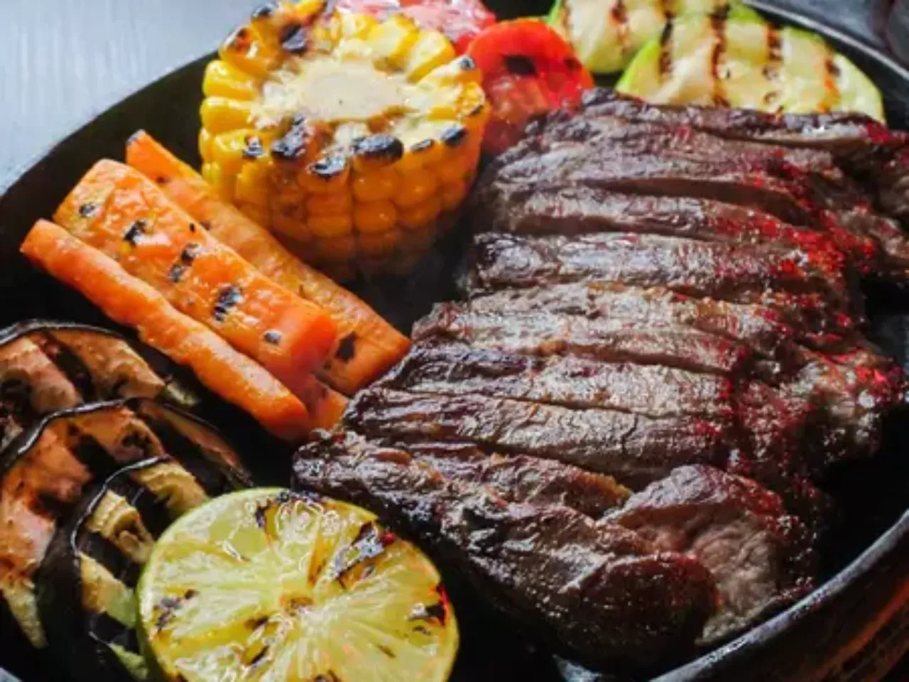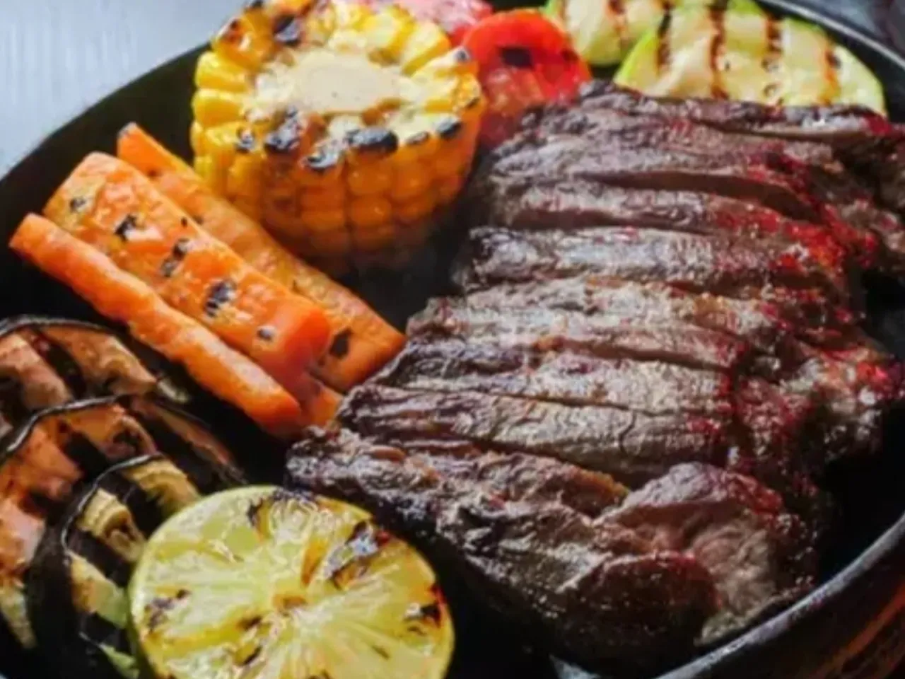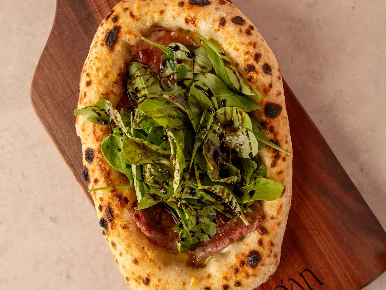 Matambre a la parrilla, queso mozzarella, salsa de tomate, orégano y oliva.