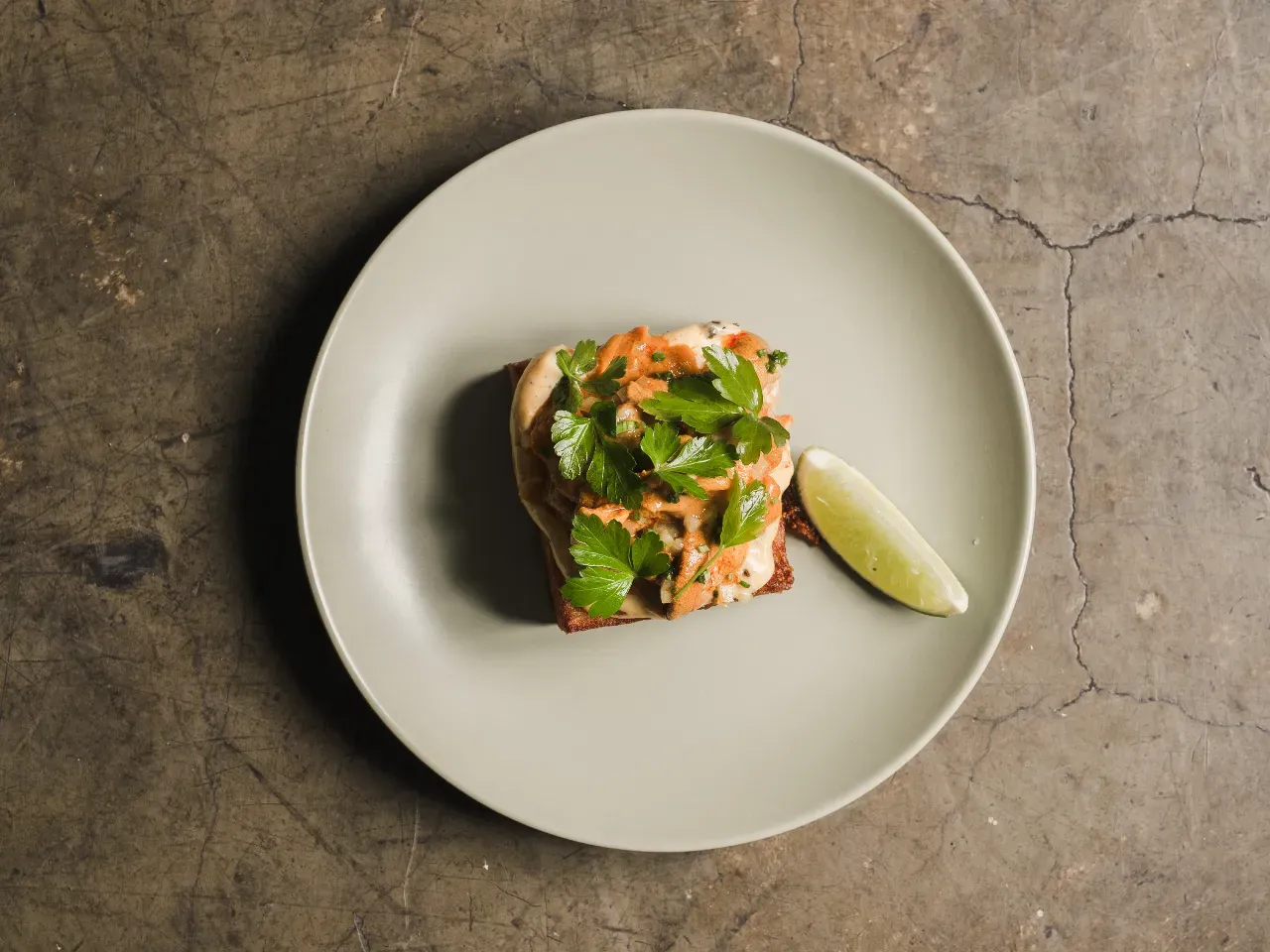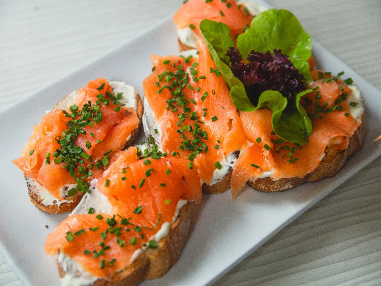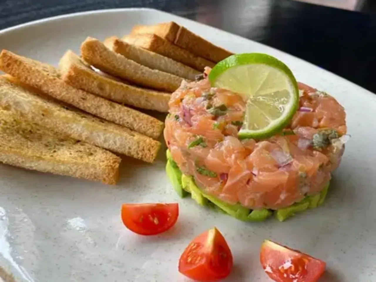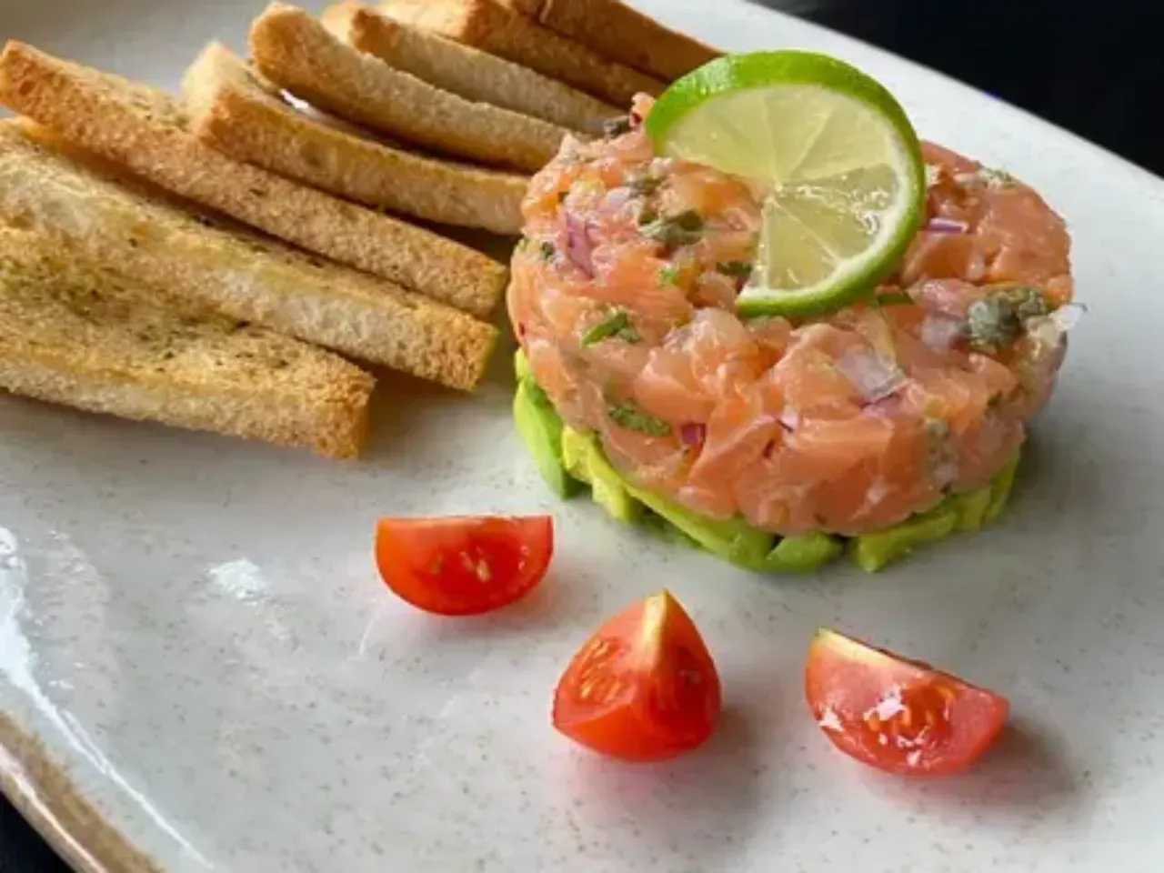 Deliciosos cubos de salmón austral, marinados en leche de tigre, con tostadas al merquén.