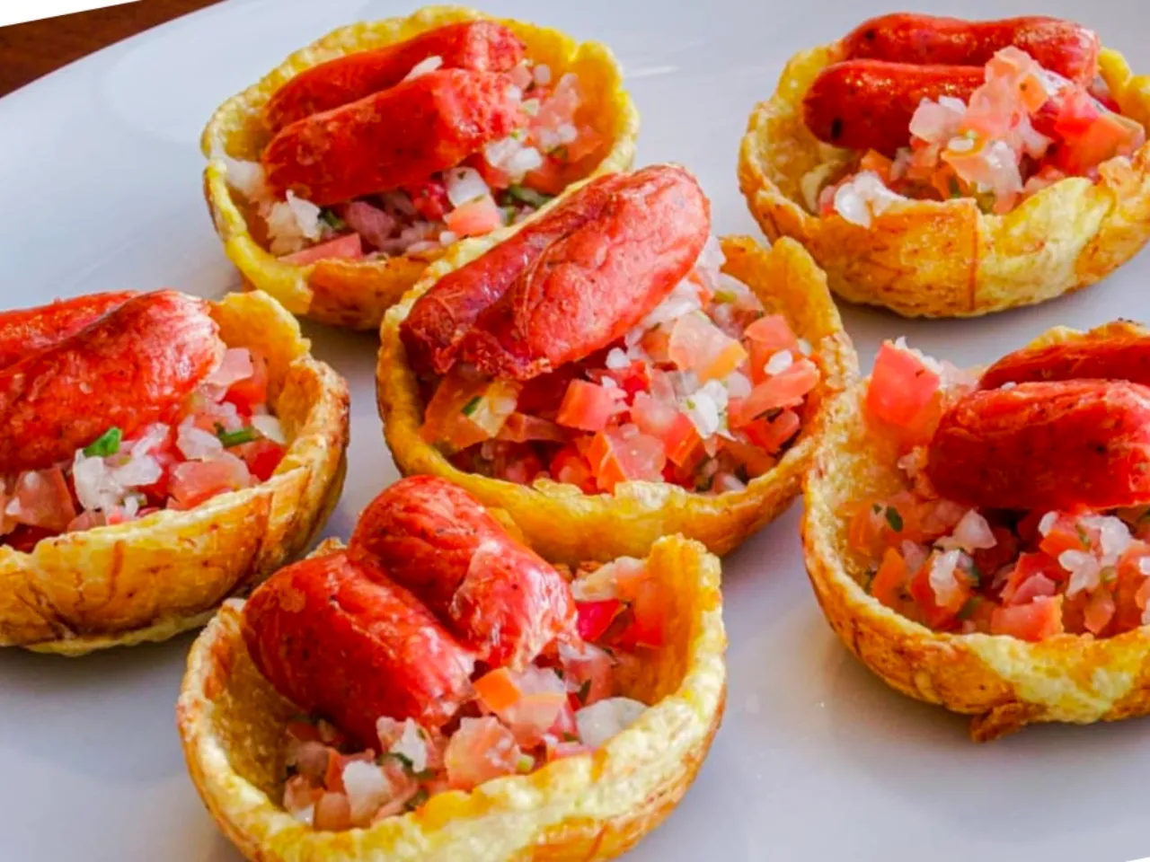 12 unidades de mini sopaipillas, acompañadas de chancho en piedra y pocillo de carne mechada.