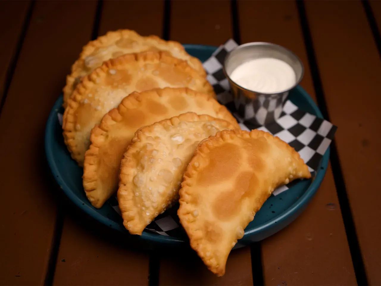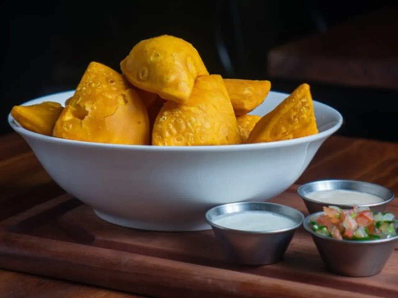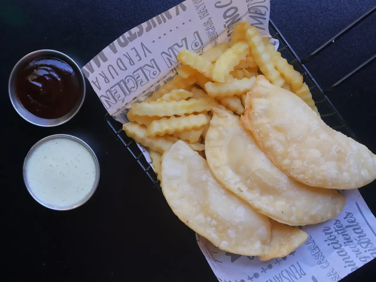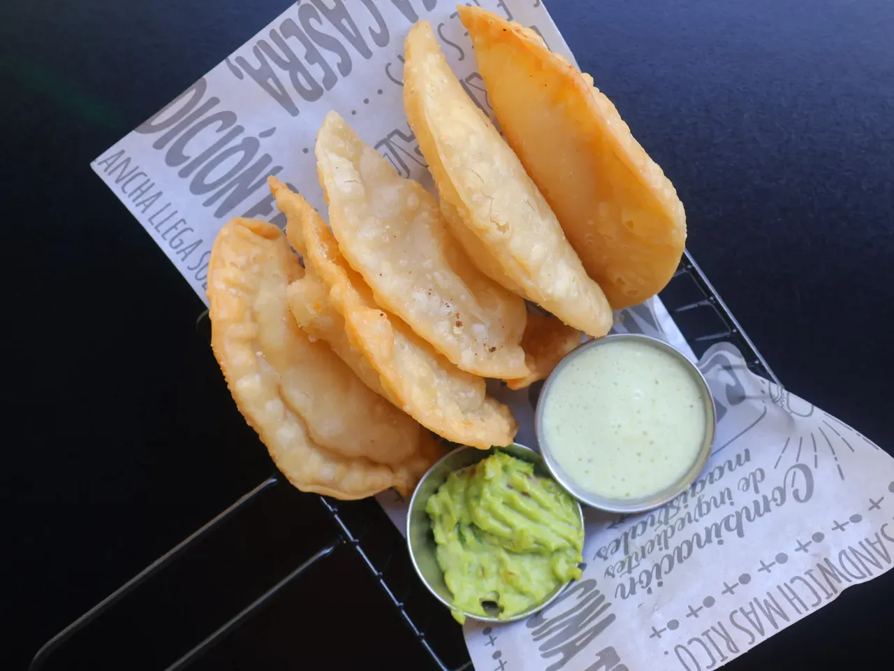 Masa de trigo frita, rellena con salteado de entraña, repollo morado. 2 unidades