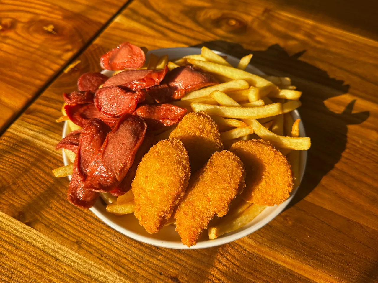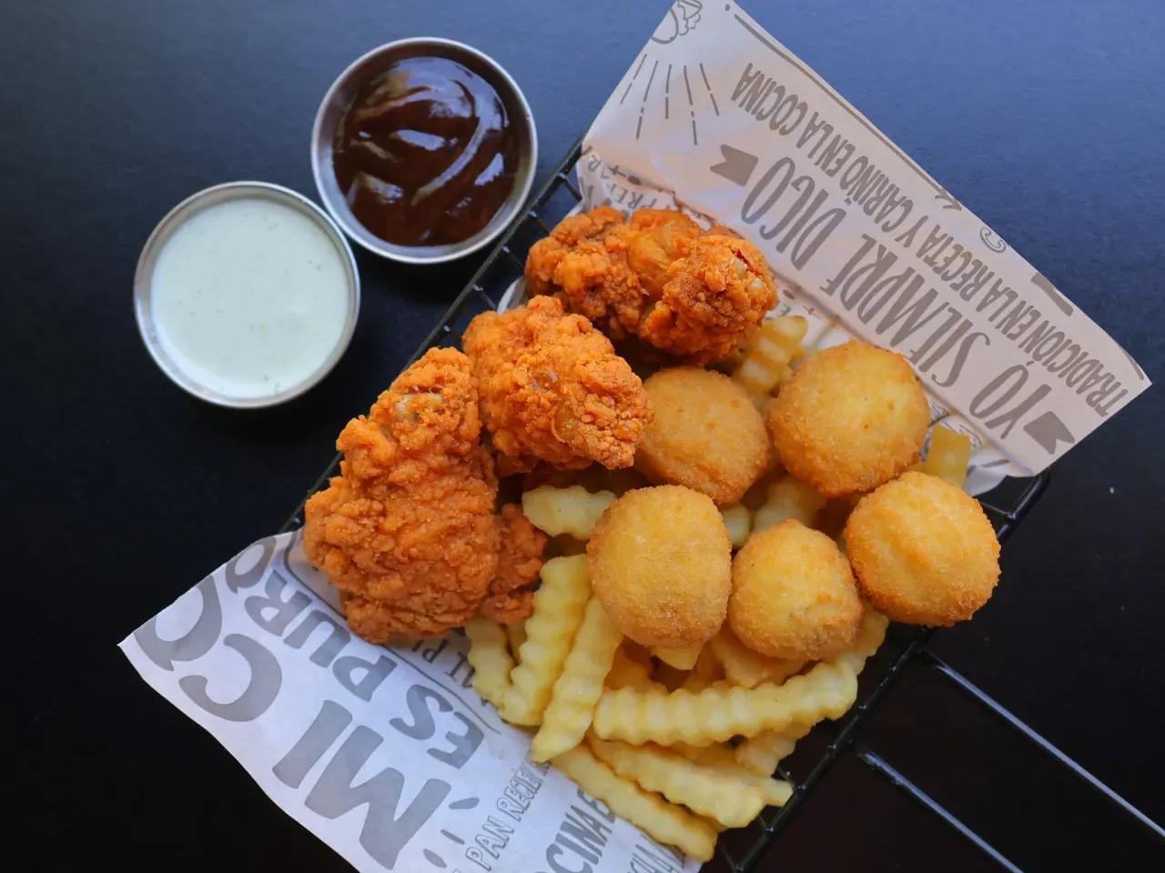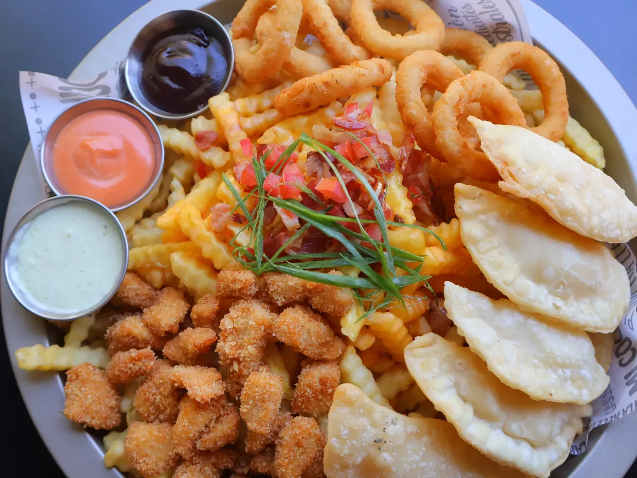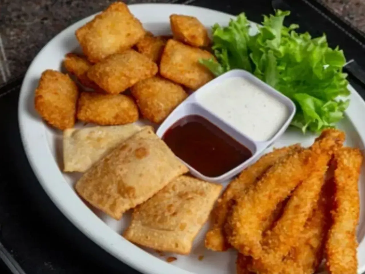 Una tabla espectacular conformada por empanitas de queso, tiritas de pollo y ravioles apanados.