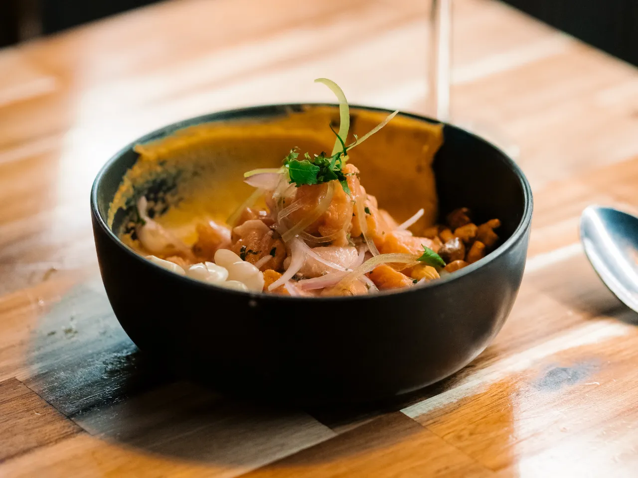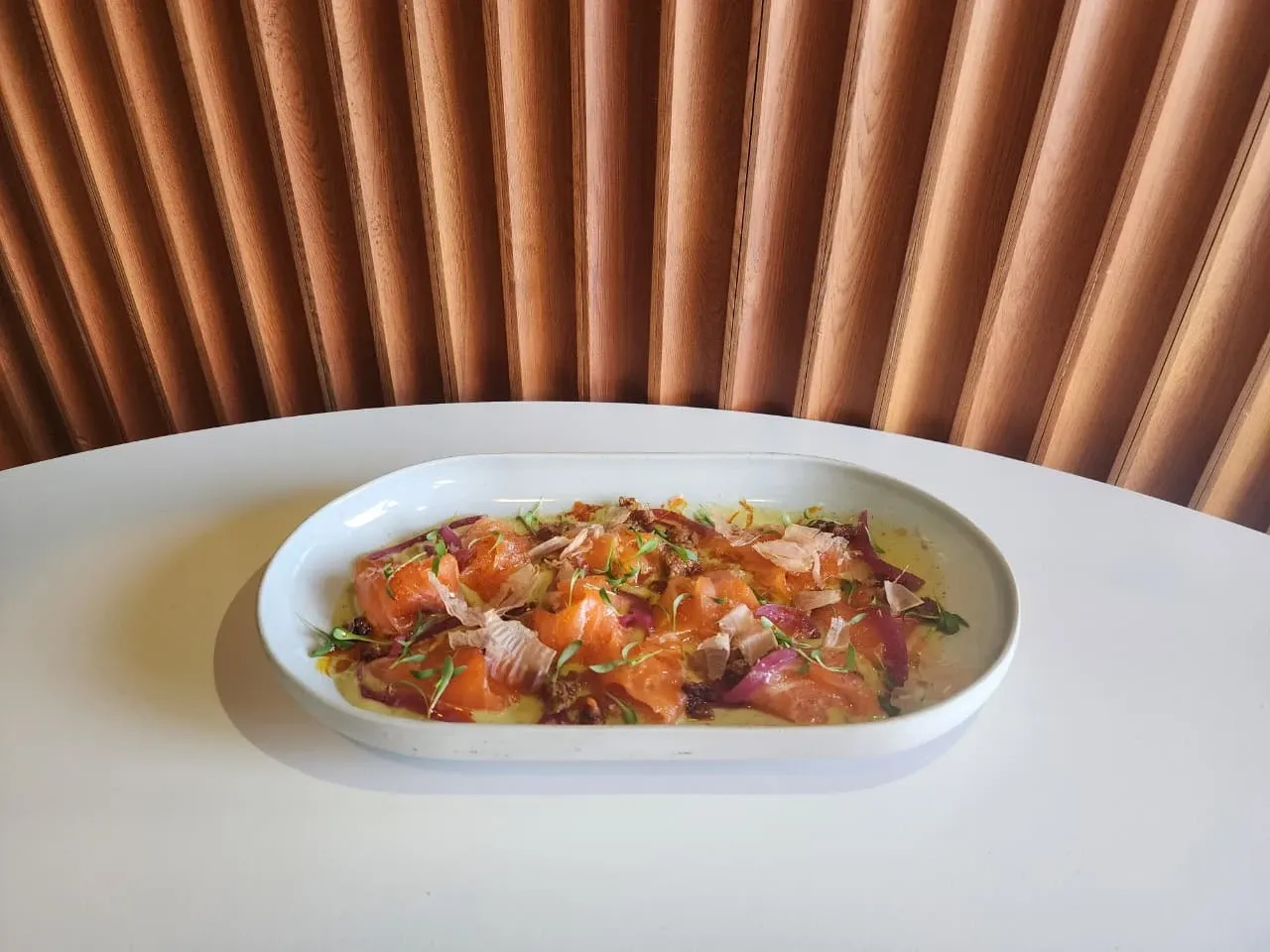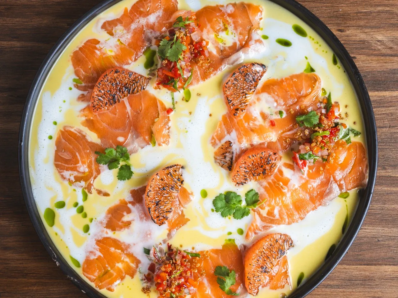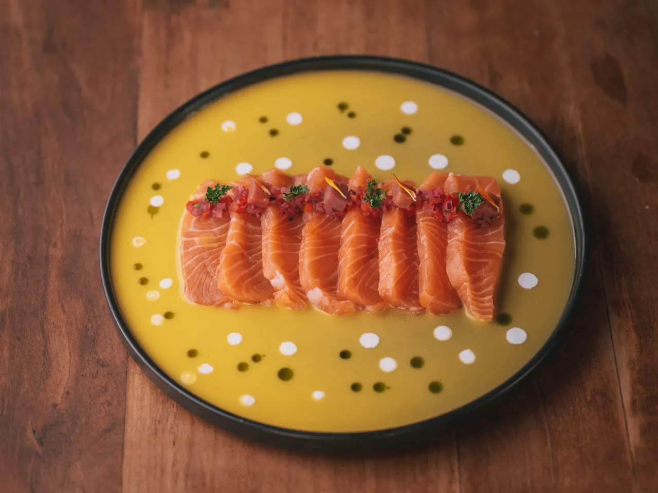 Láminas de salmón fresco sobre una limoneta de ají amarillo, pebre de palta, farofa y microgreens.