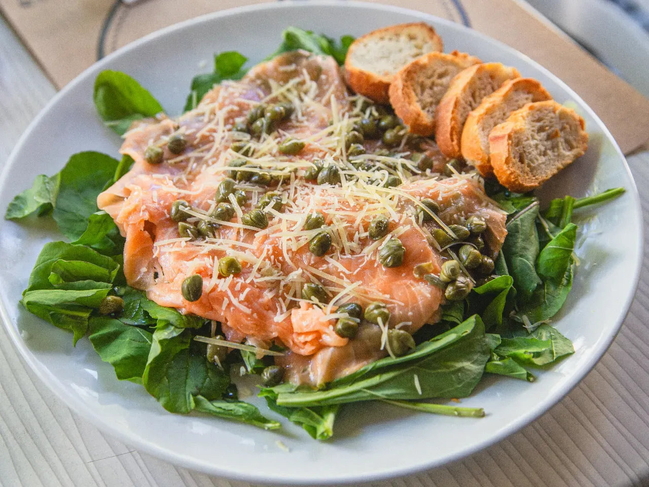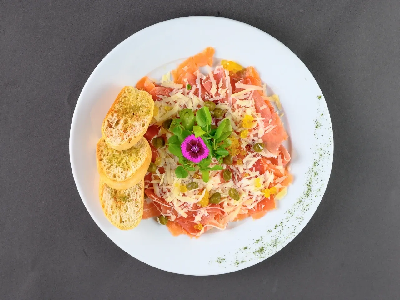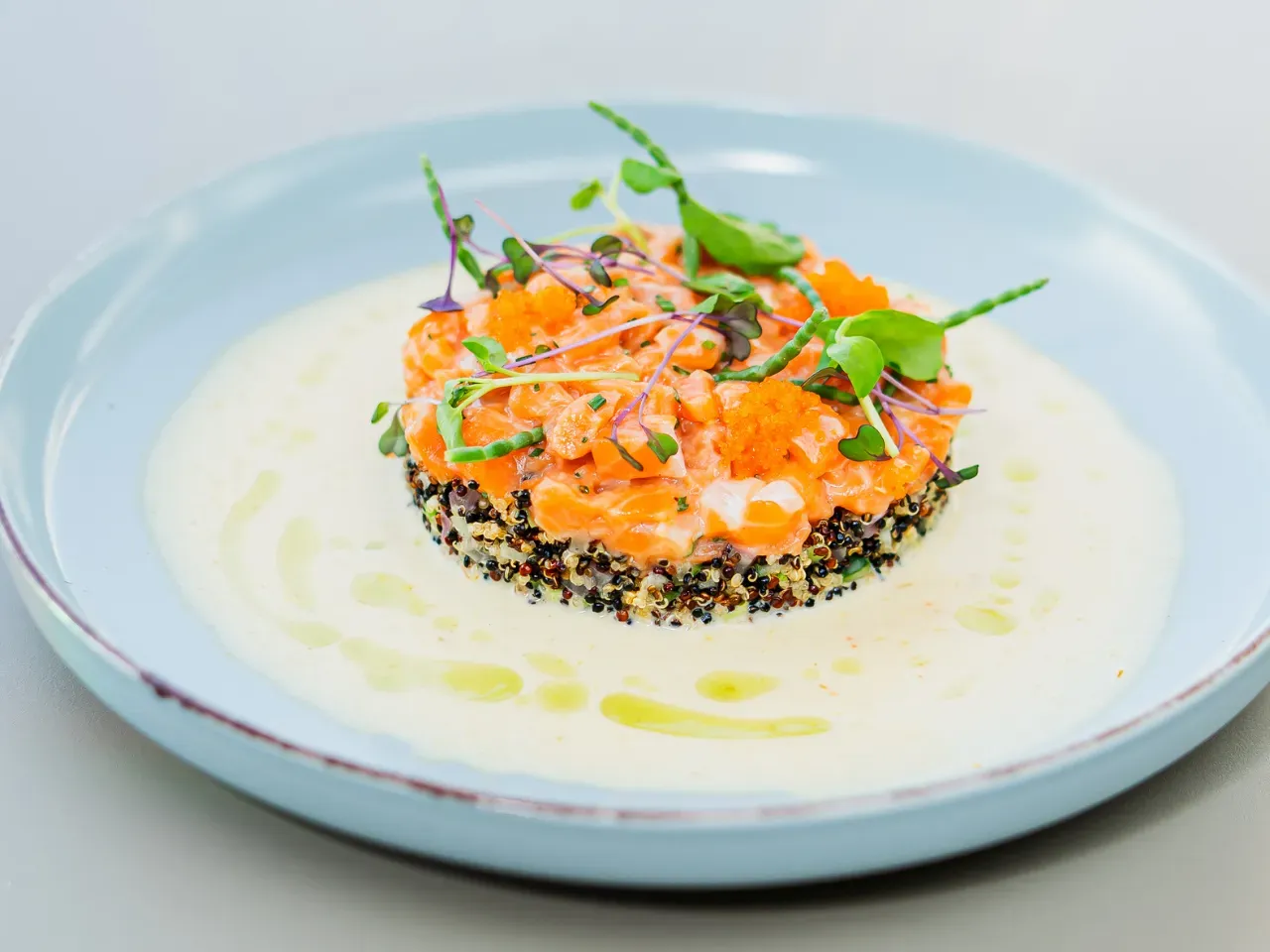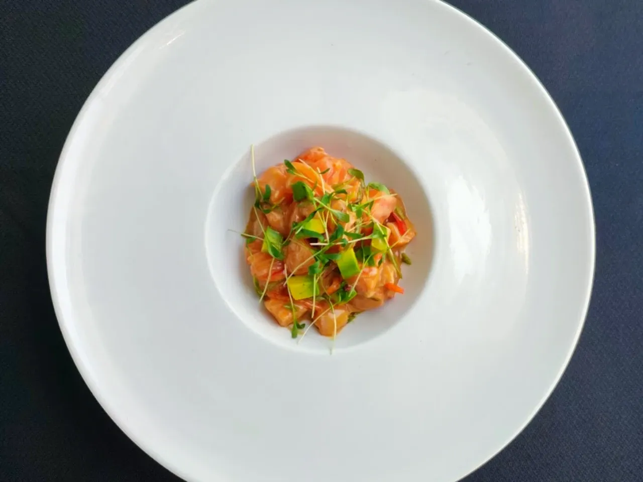 Láminas de salmón fresco sobre una limoneta de ají amarillo, pebre de palta, farofa y microgreens.