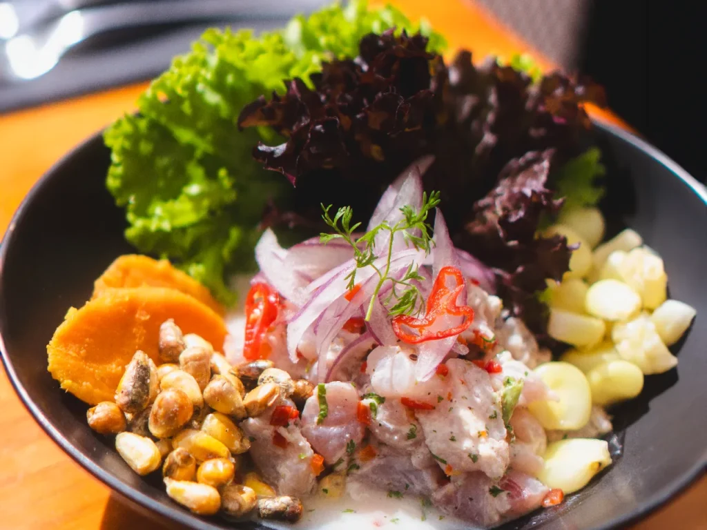 Pescado blanco en cubitos, marinado en sumo de limón condimentado en especias, cebolla morada, cilantro, choclo, camote y leche de tigre
