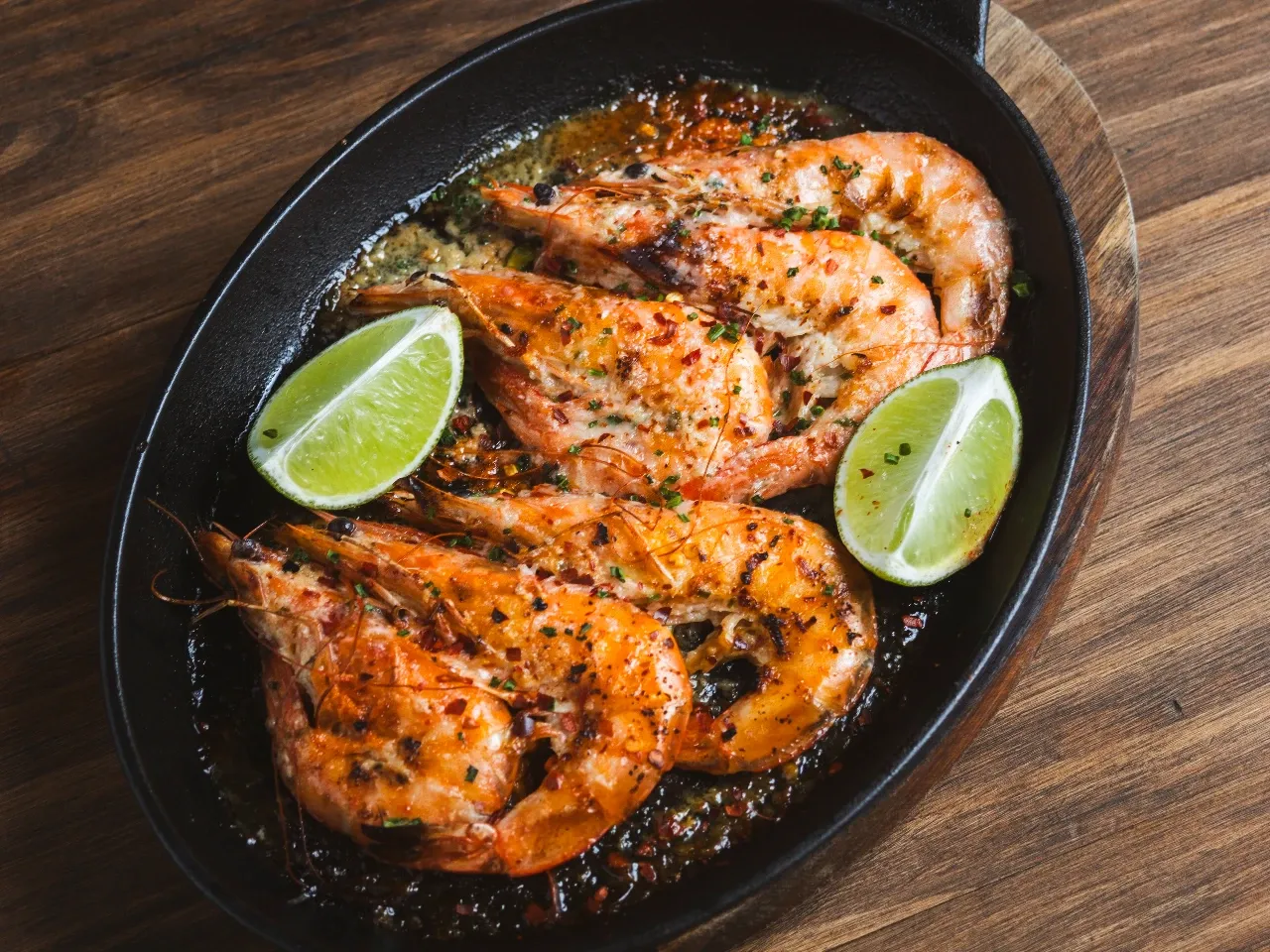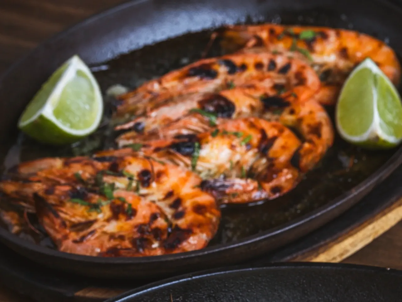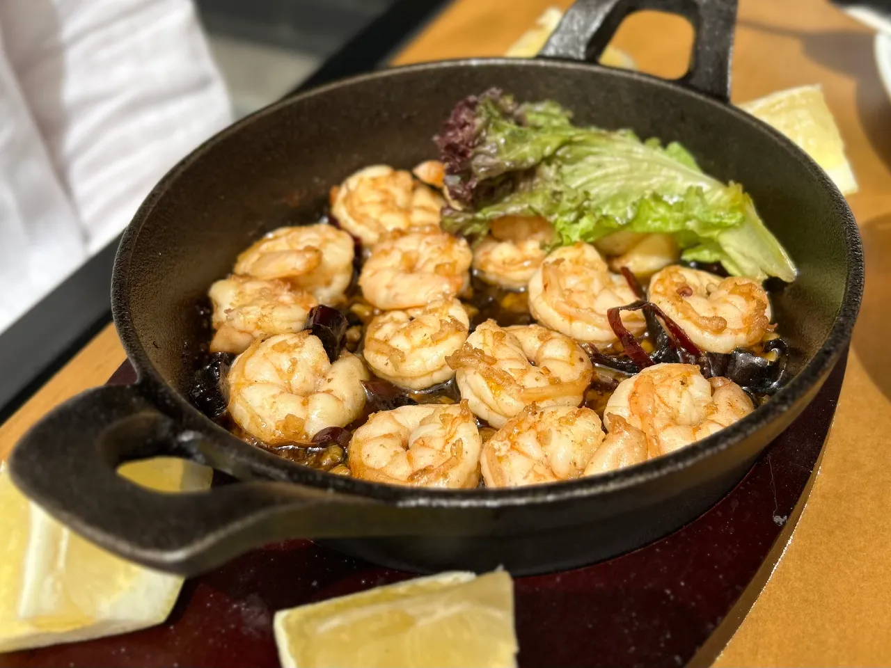 langostinos enteros y asados a las brazas y terminado con mantequilla de ajo