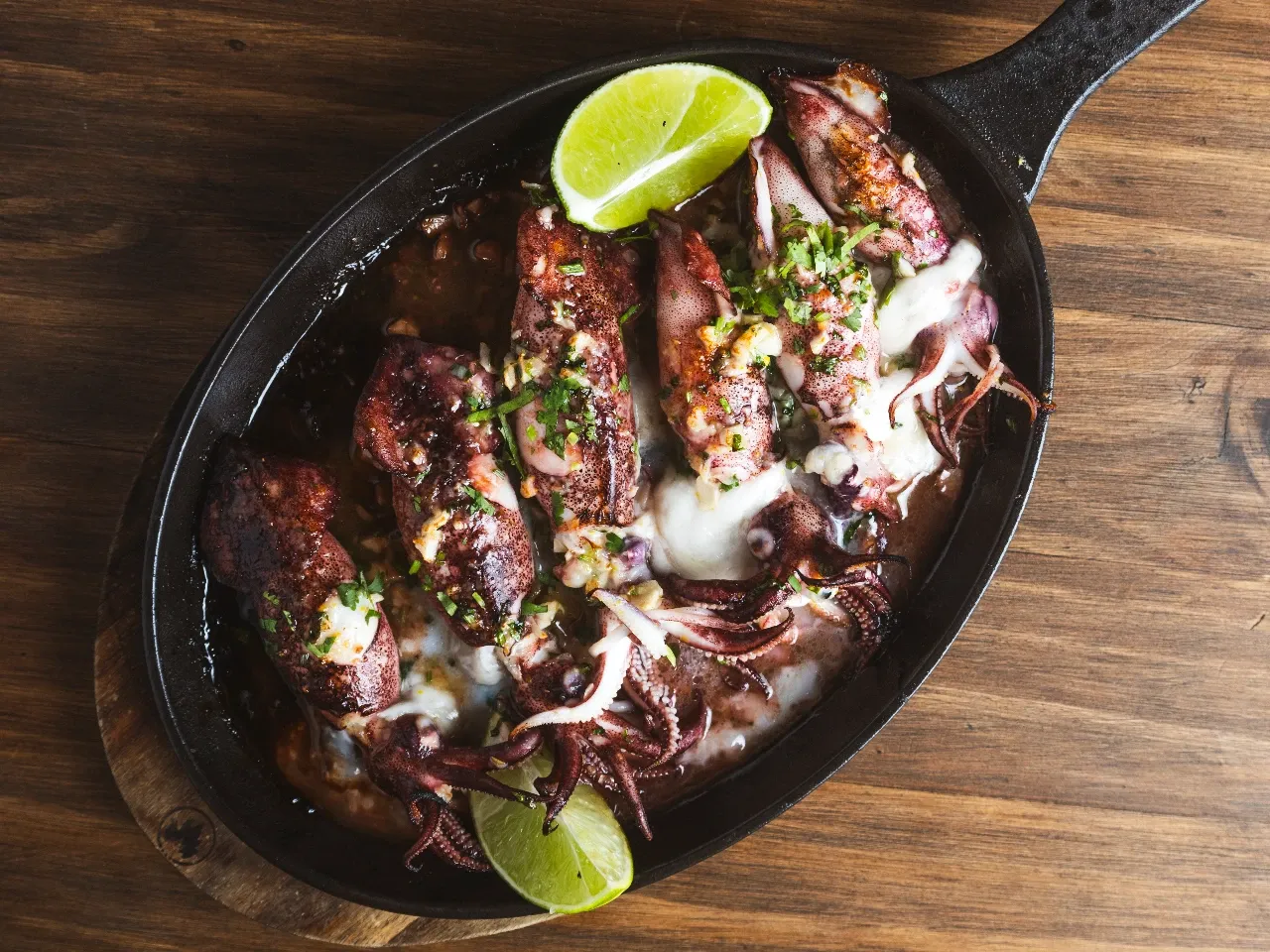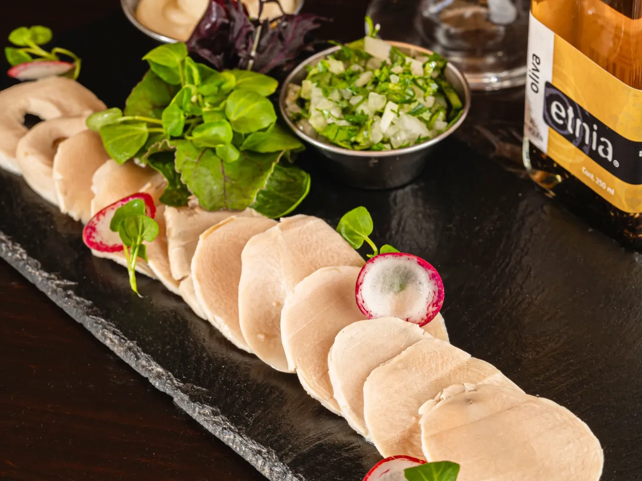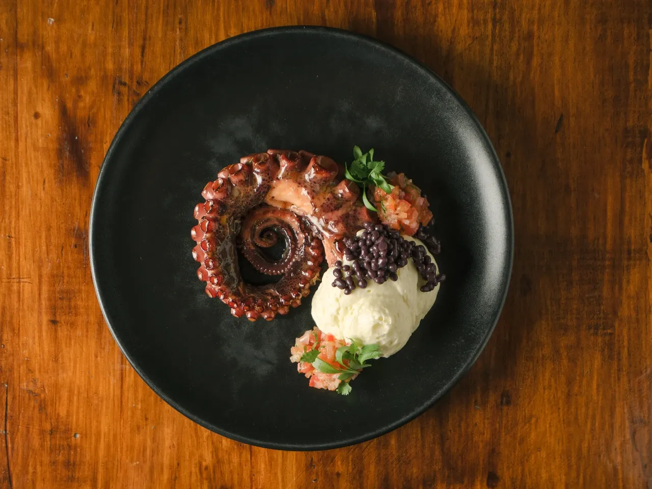 Laminas de pulpo en salsa de olivo verde y morado, alcaparras, palta y emulsión de rocoto