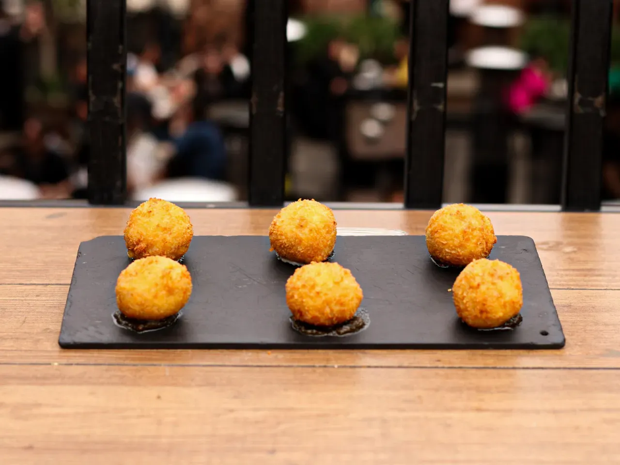 Dúo de croquetas de cabra con frutos secos y jamón serrano con salsa alioli y mermelada de tomates