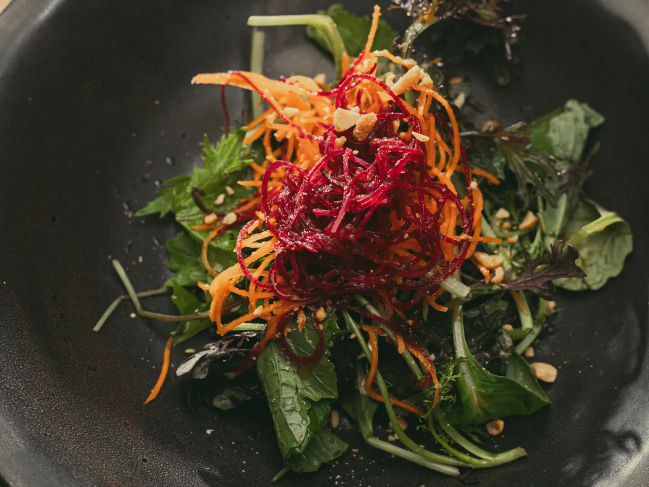 Láminas de remolacha, zucchini, zanahoria y pepino con rúcula, alcaparras y queso feta