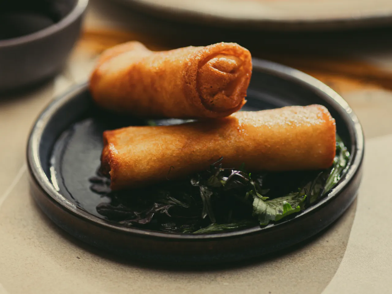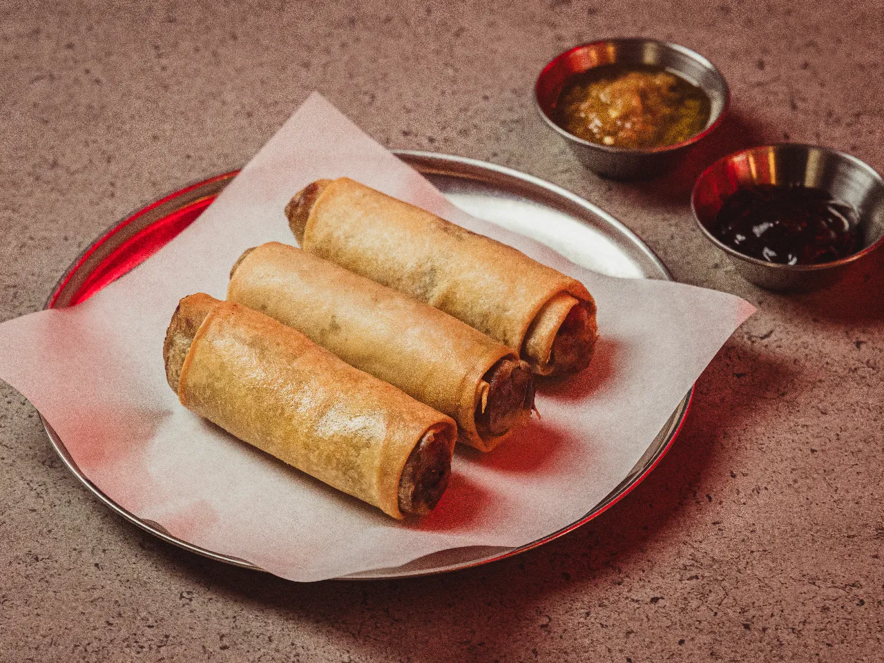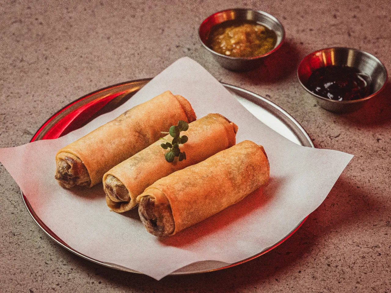 Rollos primera rellenos de lomo saltado al wok, acompañado de salsa de aji amarillo y tamarindo