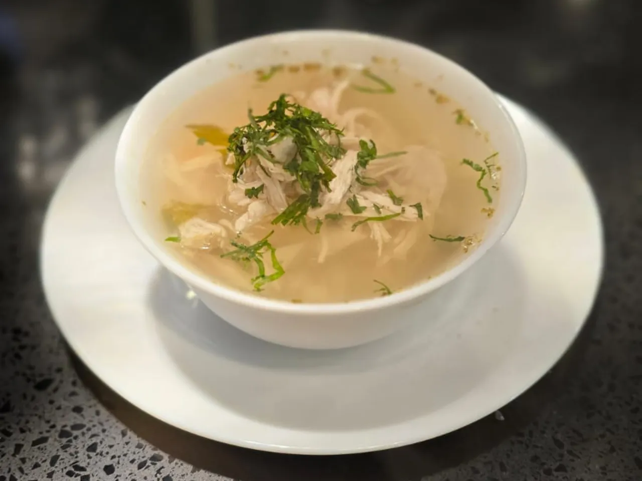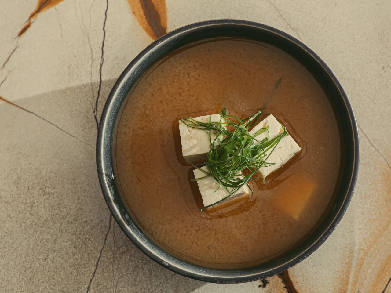 Sopa a base de poroto de soya, con tofu y cebollín.