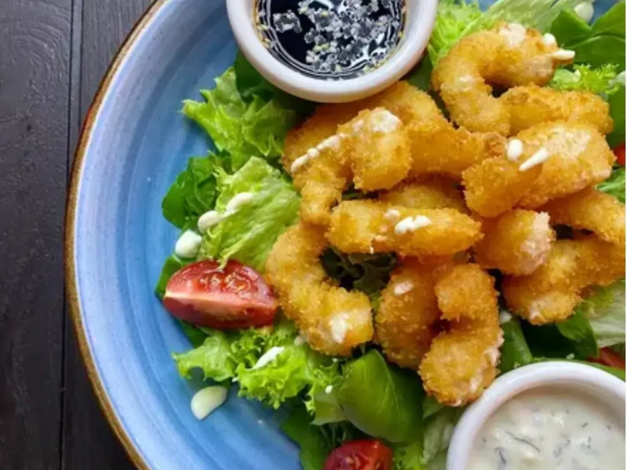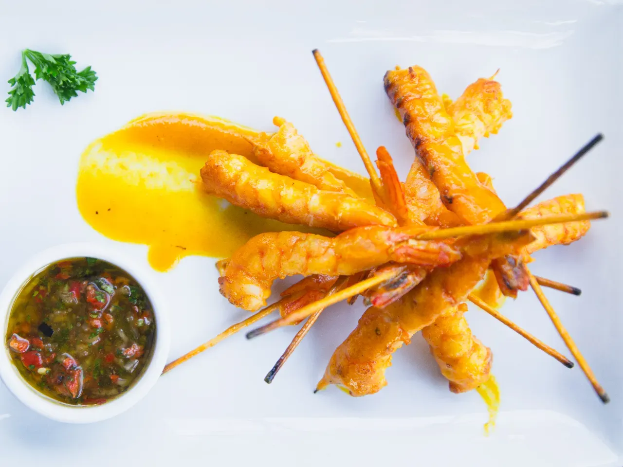 Camarones empalizados en panko acompañado de salsa tamarindo y reducción de vino