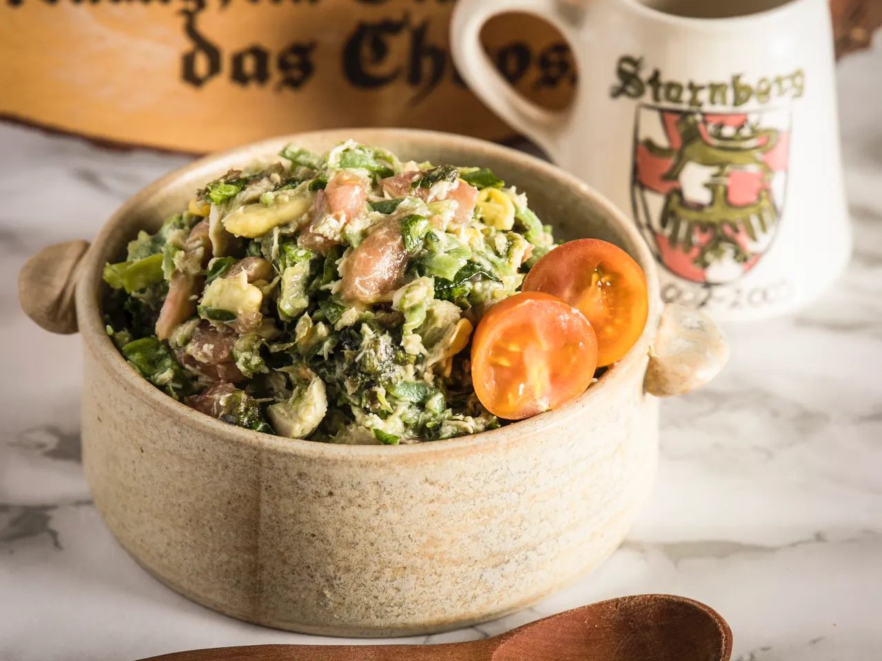Atun en salsa de soya, aceite de oliva, cebolla, alcaparras,pepinillo, palta, mostaza antigua