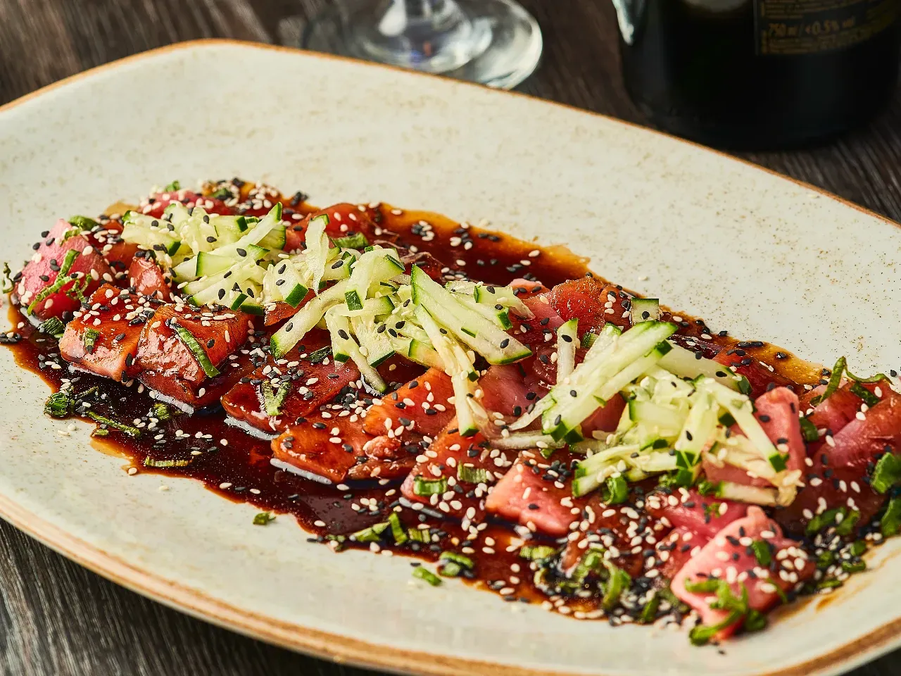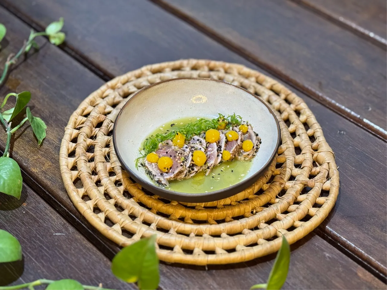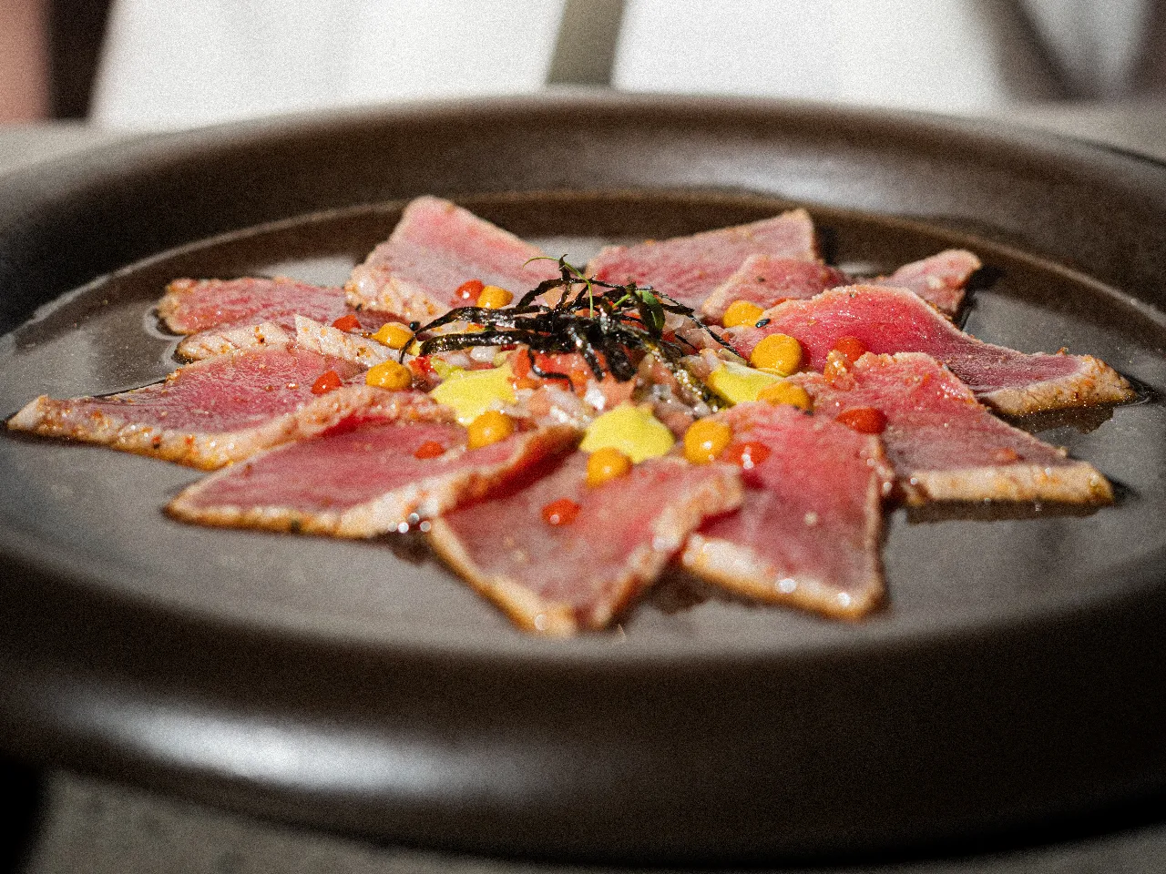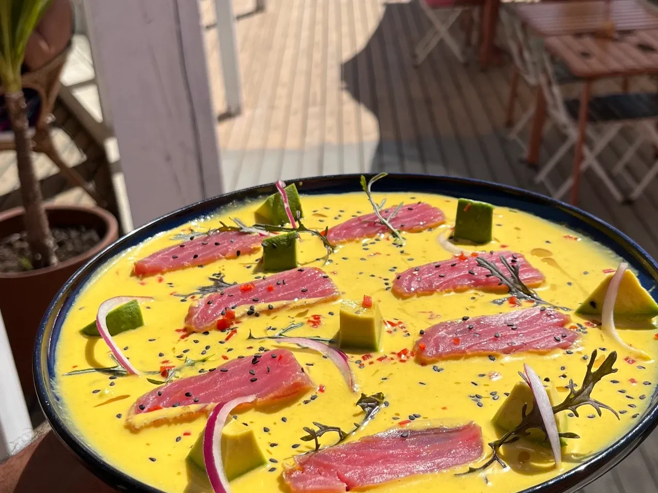 Laminas de atún sobre emulsión acevichada y ahumada de aji amarillo, acompañada de palta ,aceite de rocoto, cebolla morada fina y brotes.