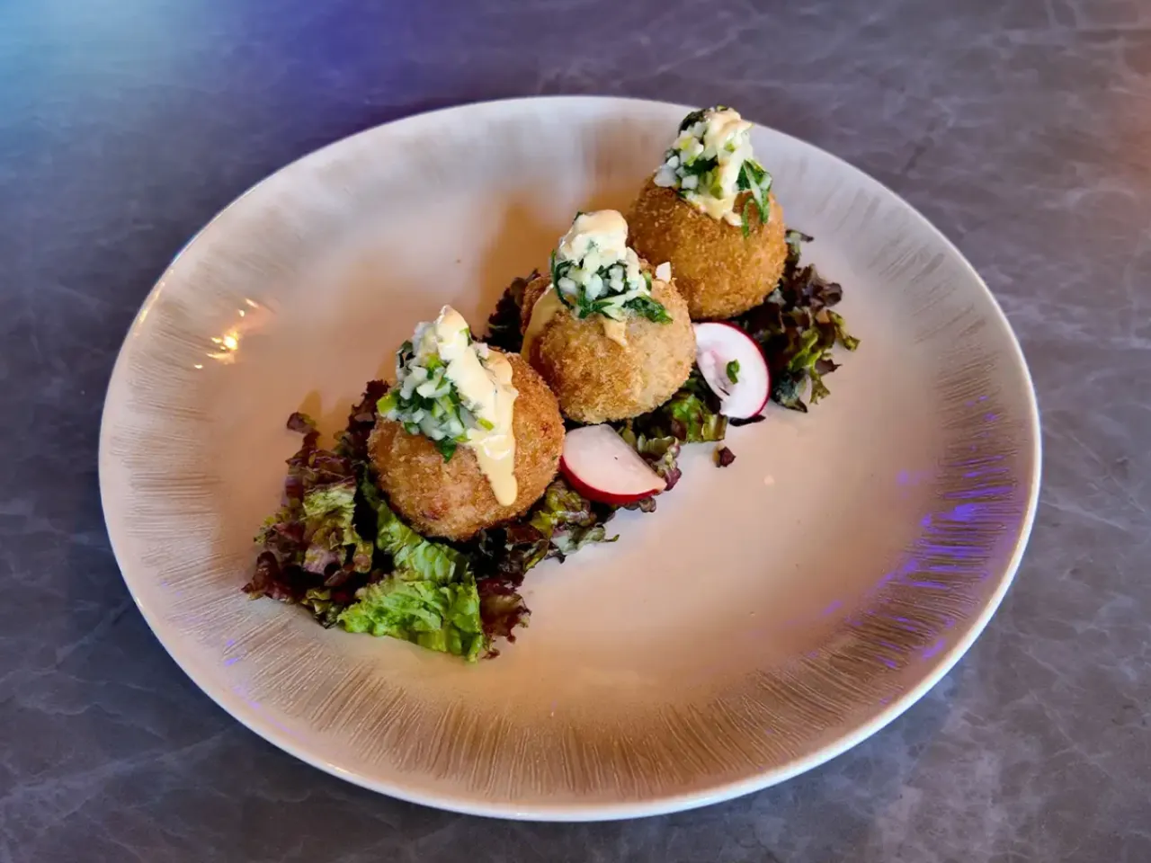 3 croquetas de pulpo inyectadas con mayonesa de lomo saltado, coronadas con pebre de manzana verde y menta, sobre una cama de hojas verdes, rábanos encurtidos y limón sutil. Sorprendente y deliciosa.