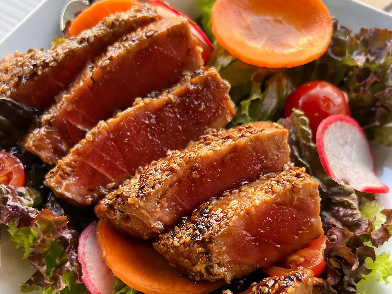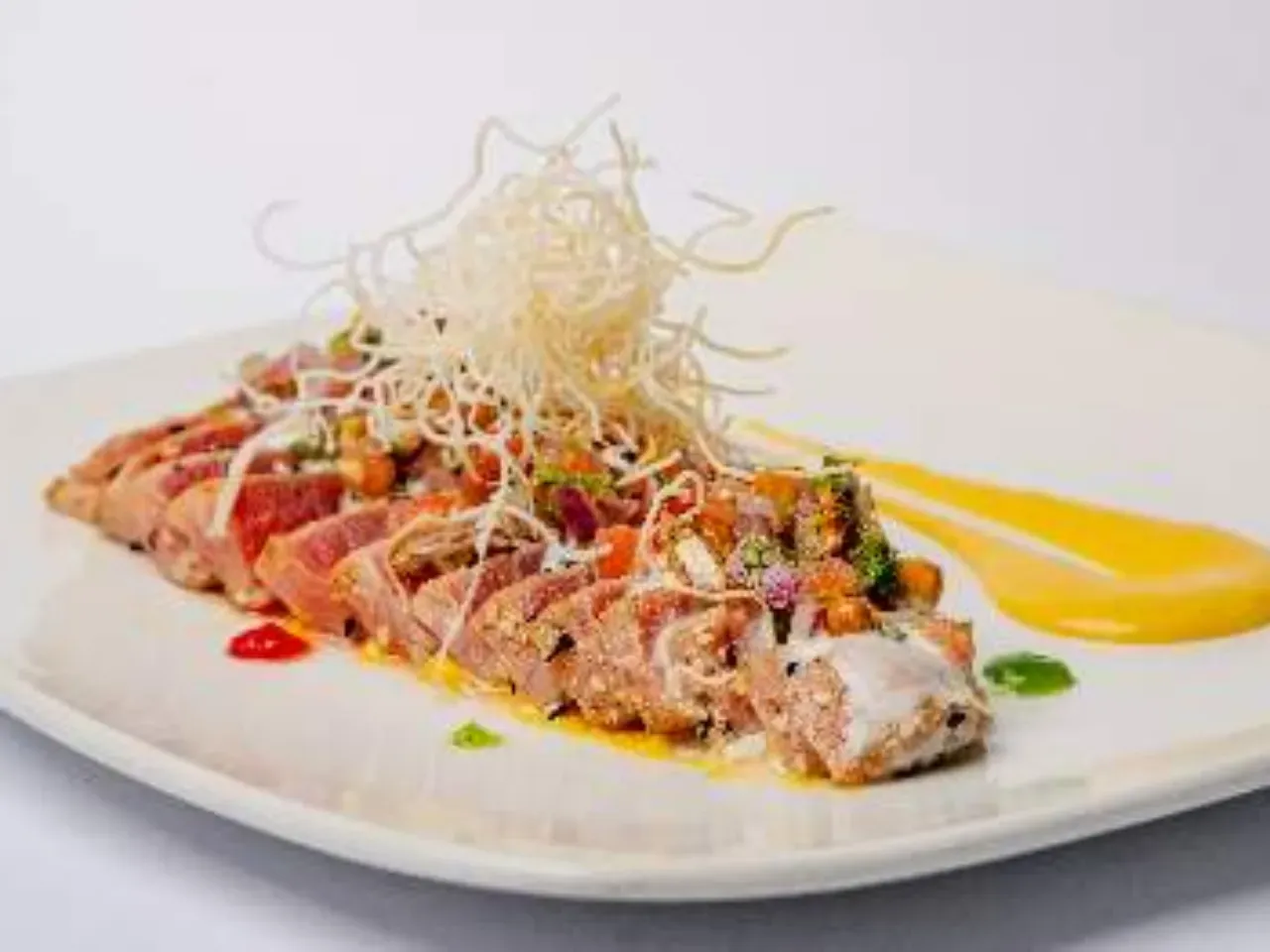 Atún sellado en costra de coco aceto balsámico,y sésamo sobre un fresco mix de pimentón ,pepino y tomate cherry y el toque secreto bahía loreto.
