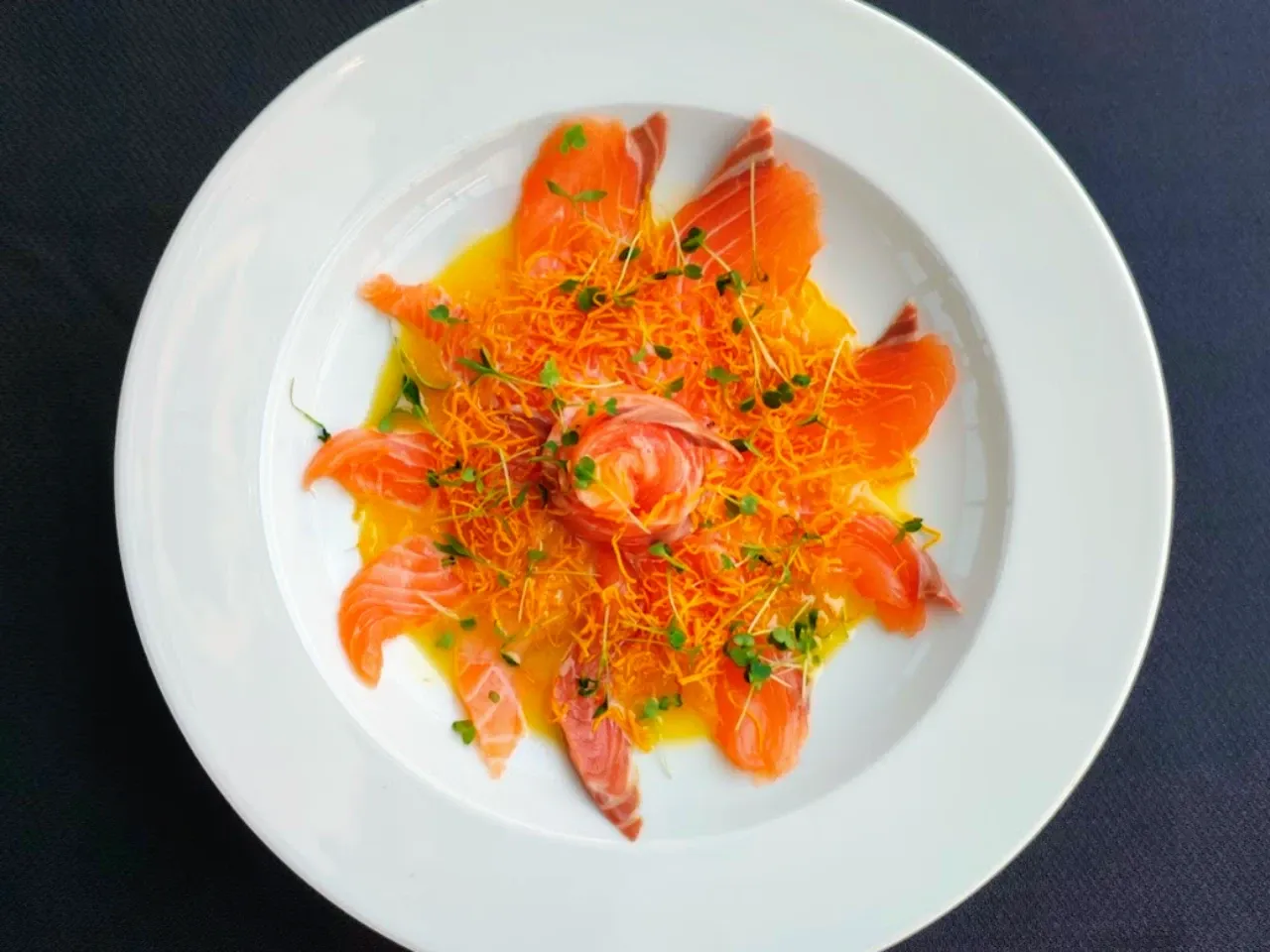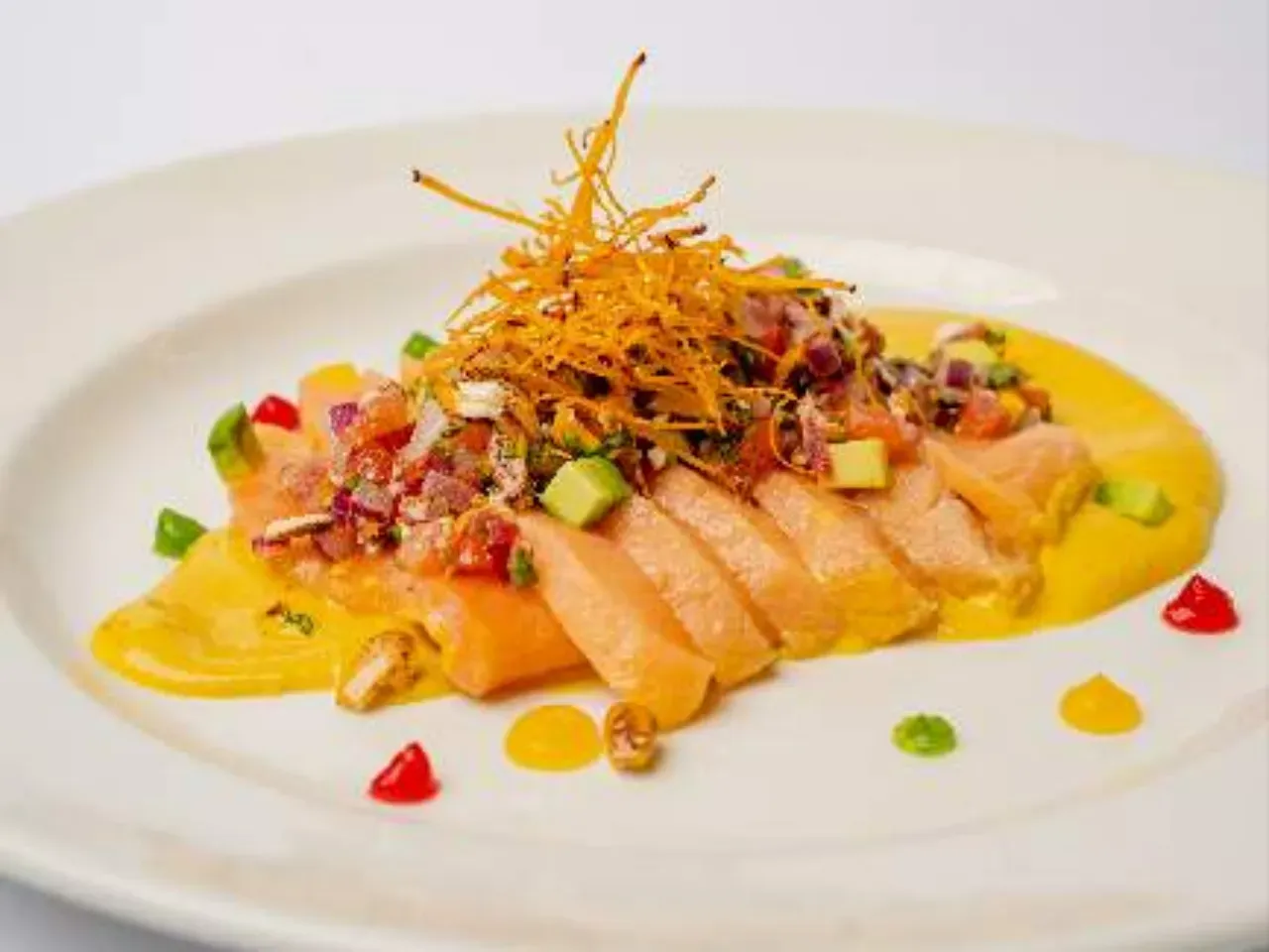 Láminas de salmón con toques de mango y chalaquita sobre espejo de acevichada de maracuyá decorado con chiffonade.