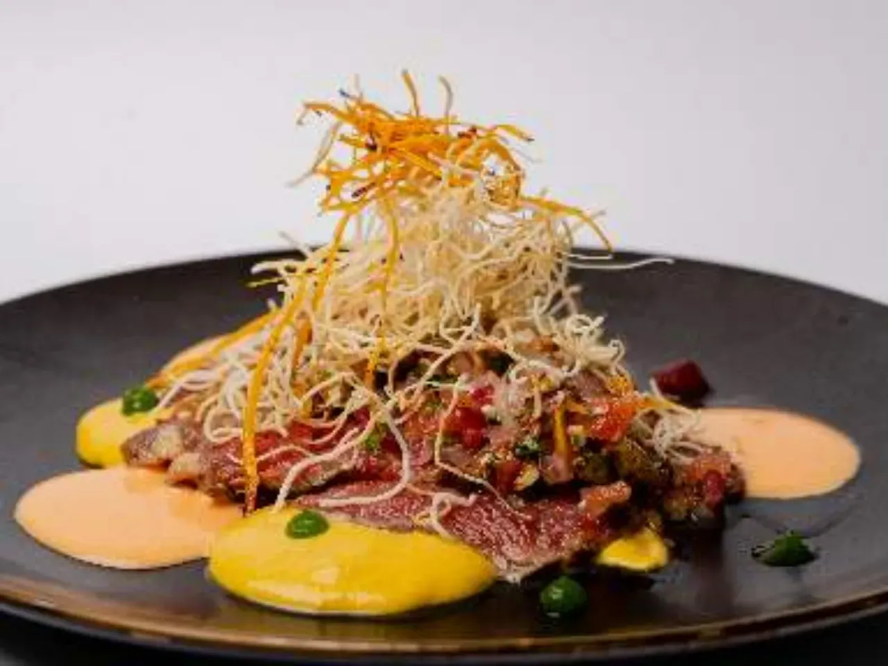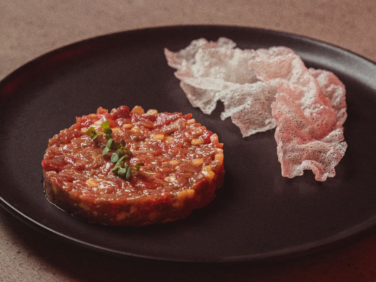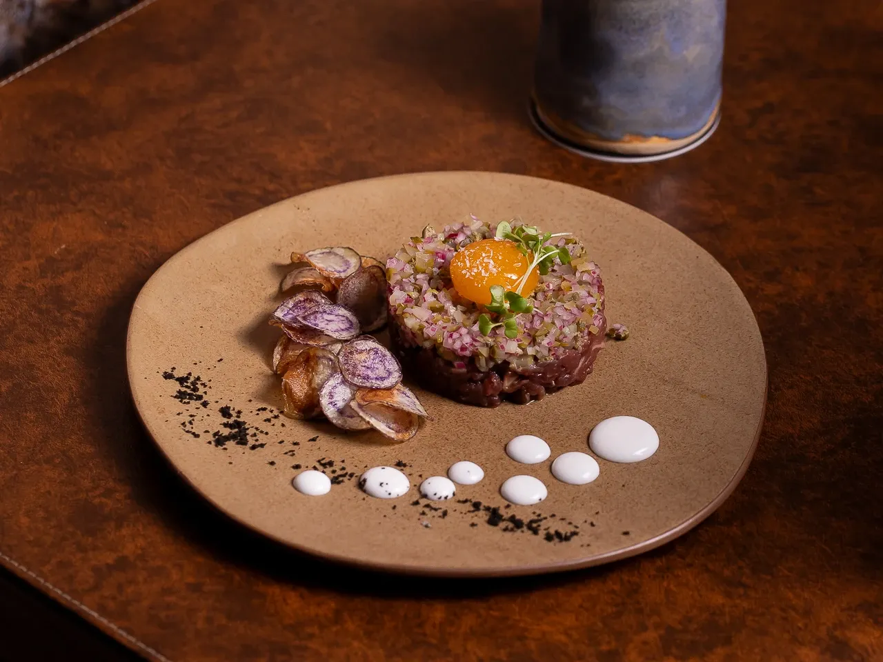 Carne de ciervo cortada en punta de cuchillo sazonada con yema pasteurizada, aceite de ají y encurtido de pepino, finalizado con crocante de cebolla y una delgada galleta con polvo de perejil.