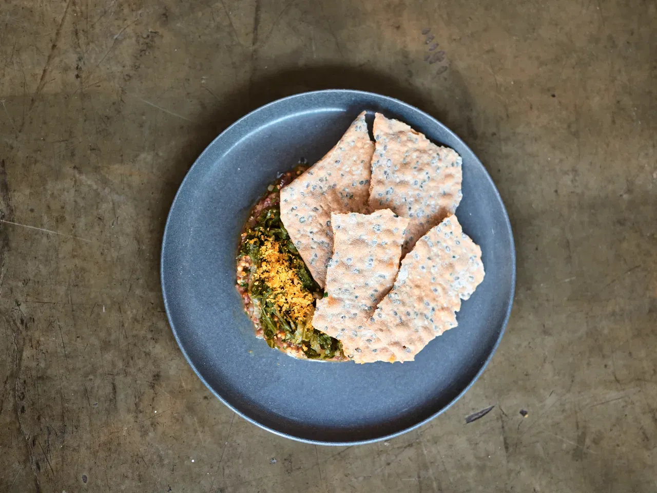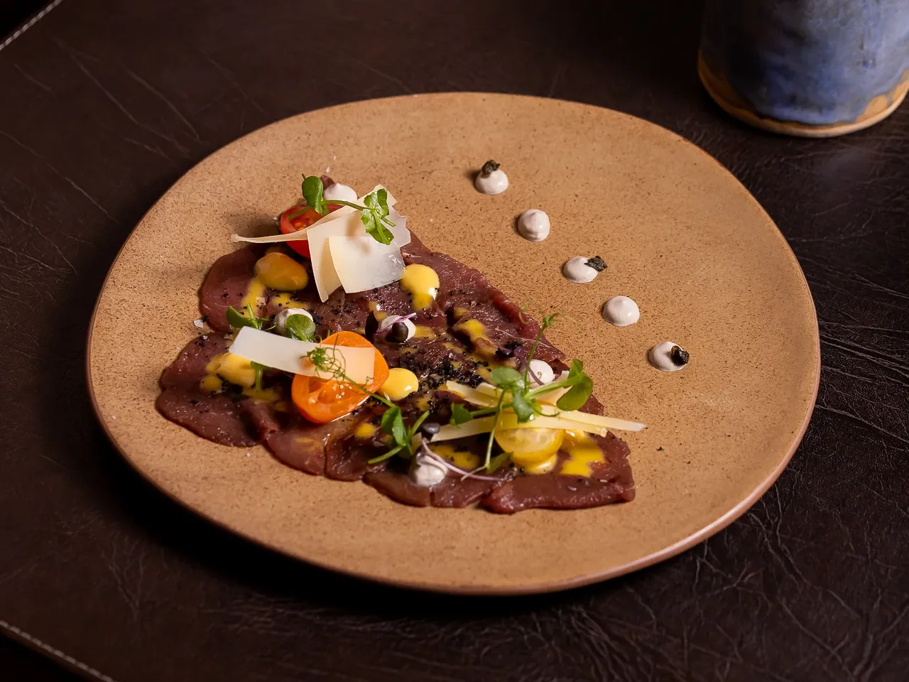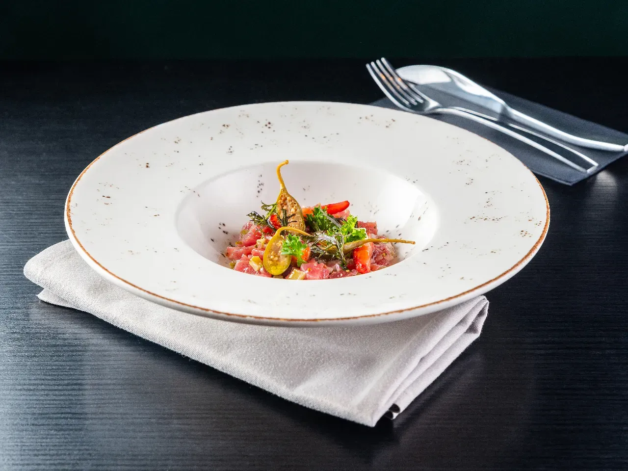 Carne de ciervo cortada en punta de cuchillo sazonada con yema pasteurizada, aceite de ají y encurtido de pepino, finalizado con crocante de cebolla y una delgada galleta con polvo de perejil.