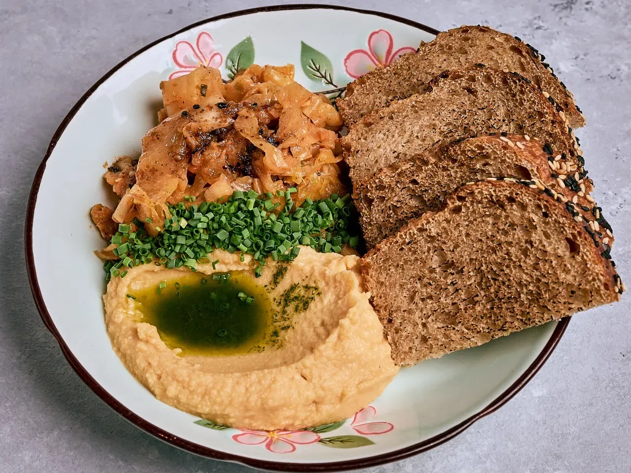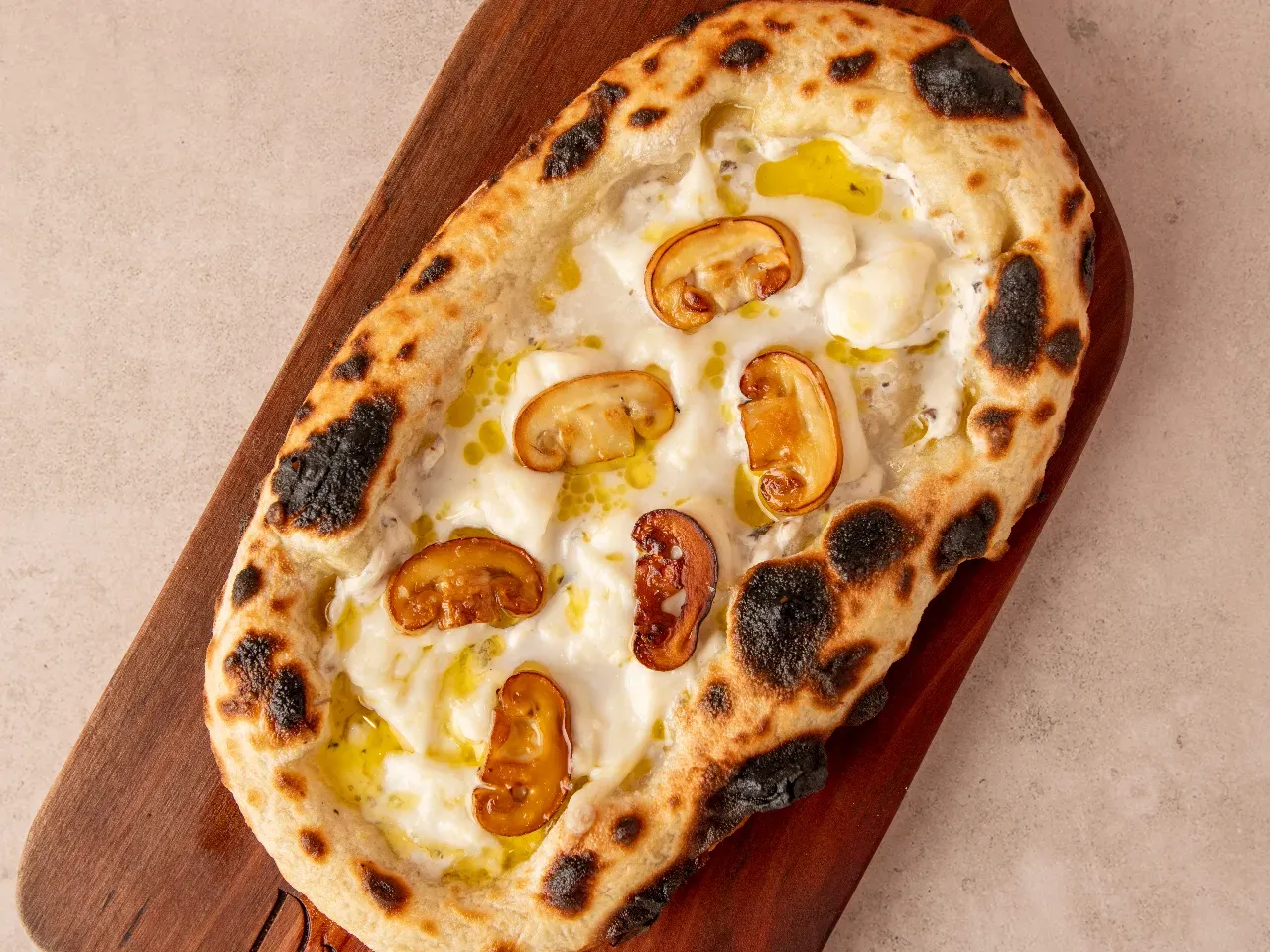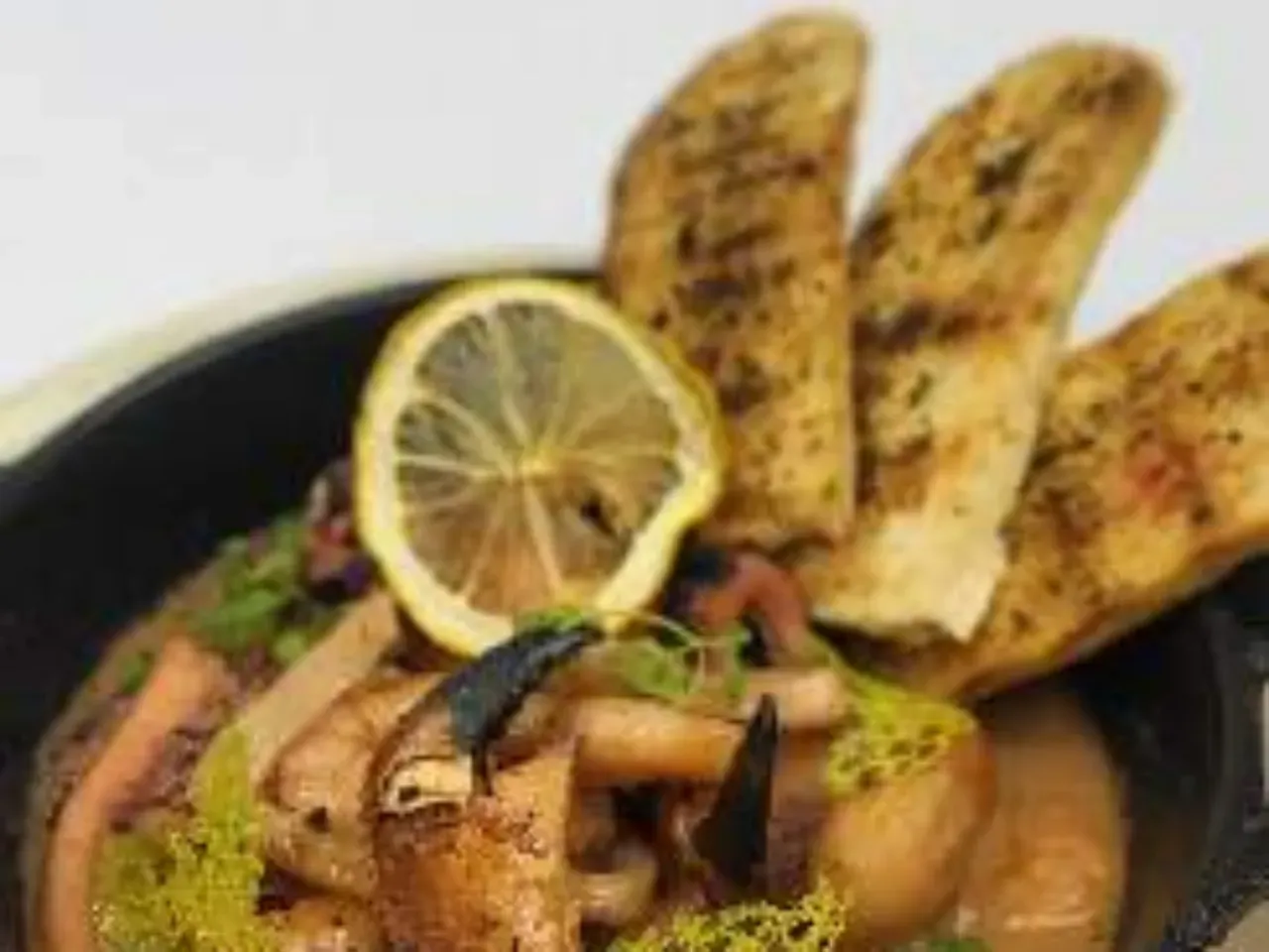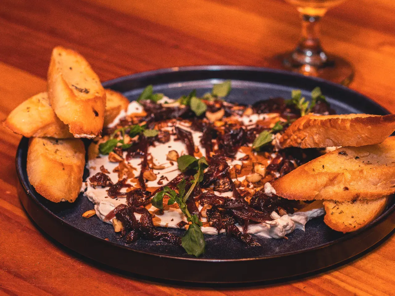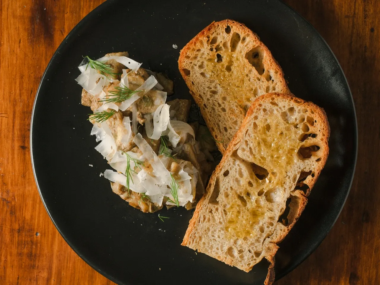 Pan de masa madre con ricota de la casa finalizado con mix de hongos confitados