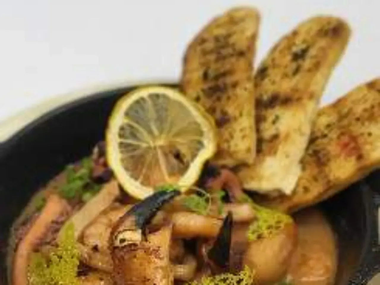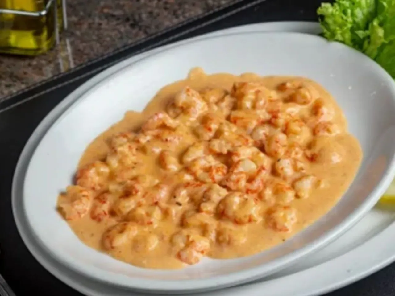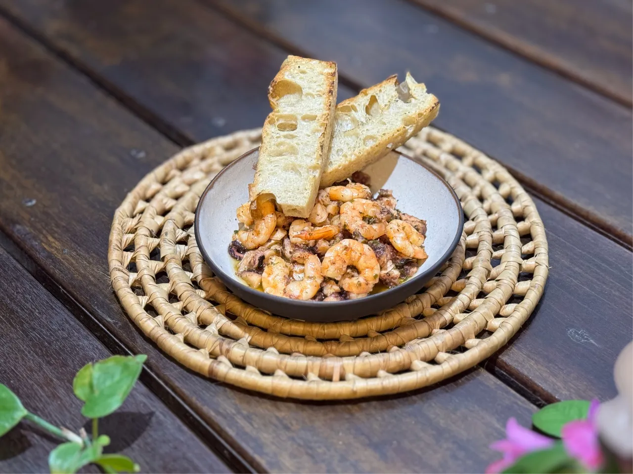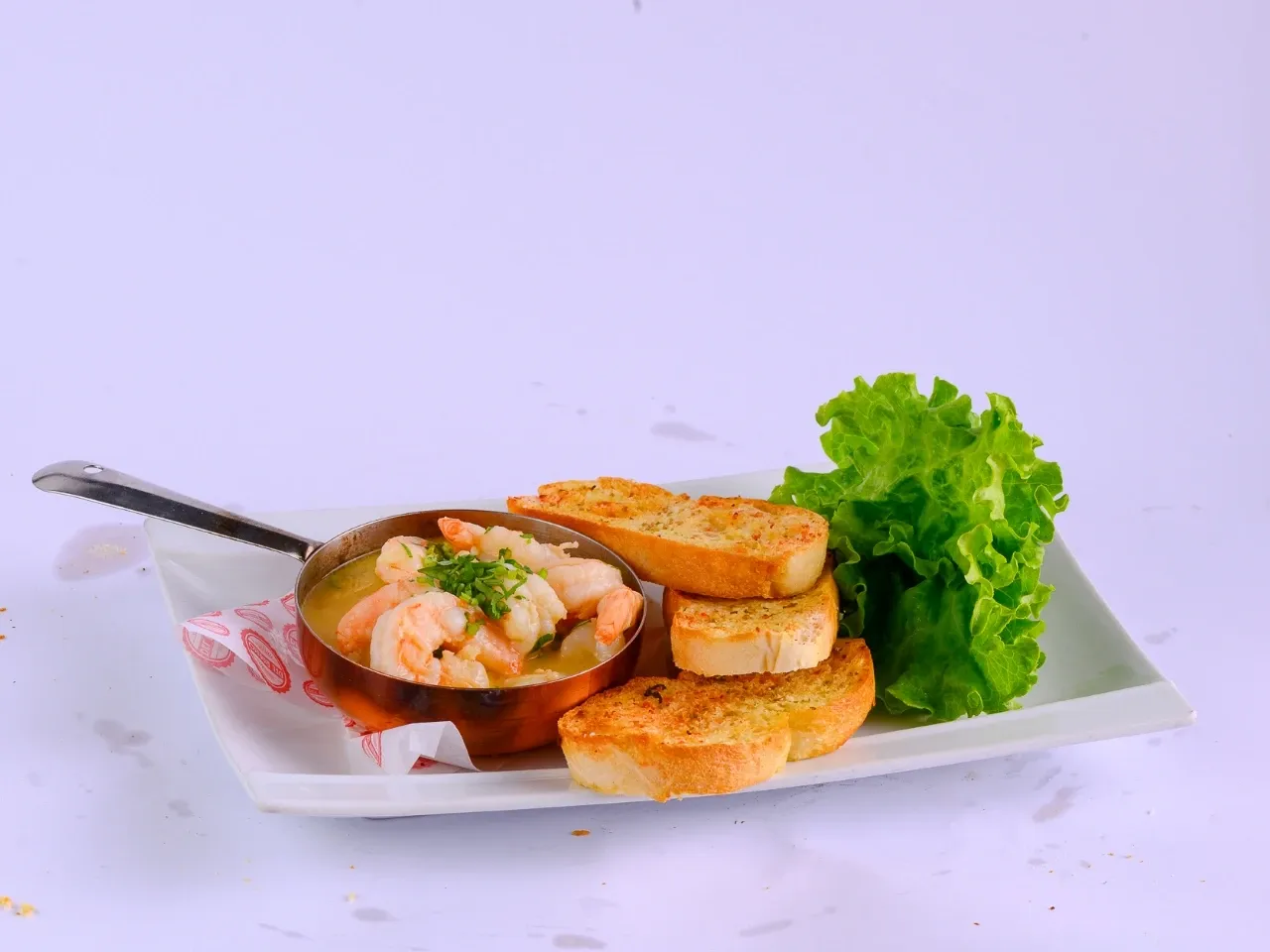 Seis langostinos en su salsa especial tipo bisque, sobre cama de cebolla estofada en mantequilla de ajo. (Incluye focaccia)