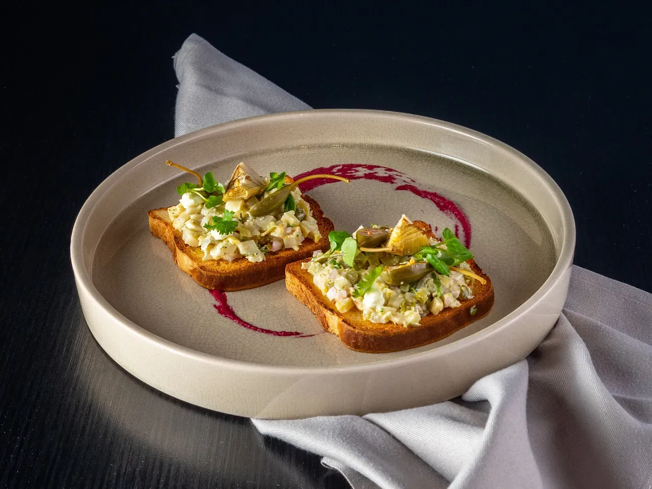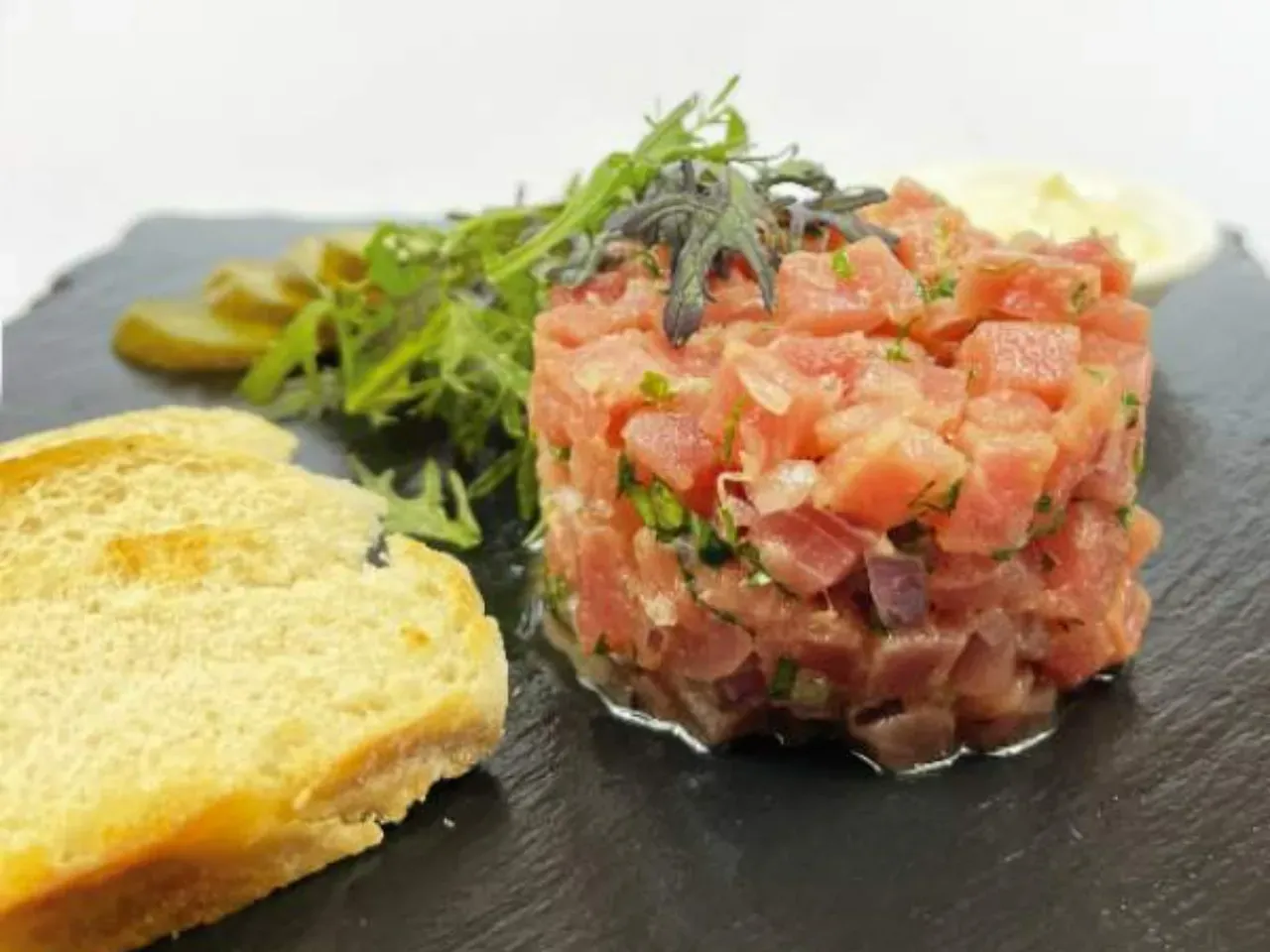Atun rojo cortado y pequeños cubos, aderezado con mostaza antigua, limon, alcaparras con una mayonesa de curcuma y tostadas