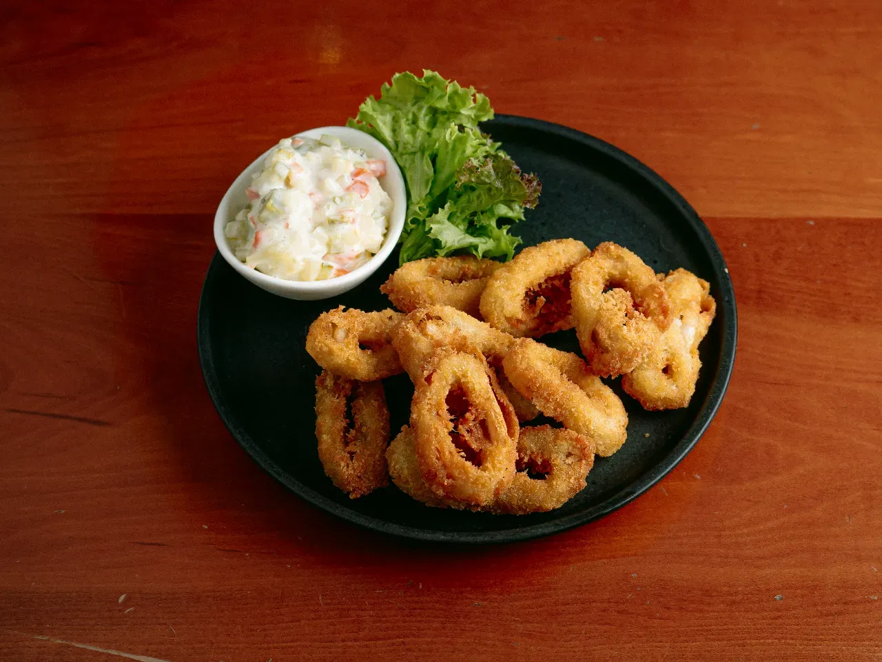 5 aros de cebolla apanados en panko acompañados de salta tártara casera y epicat.