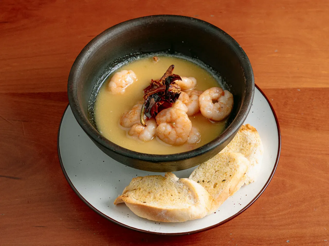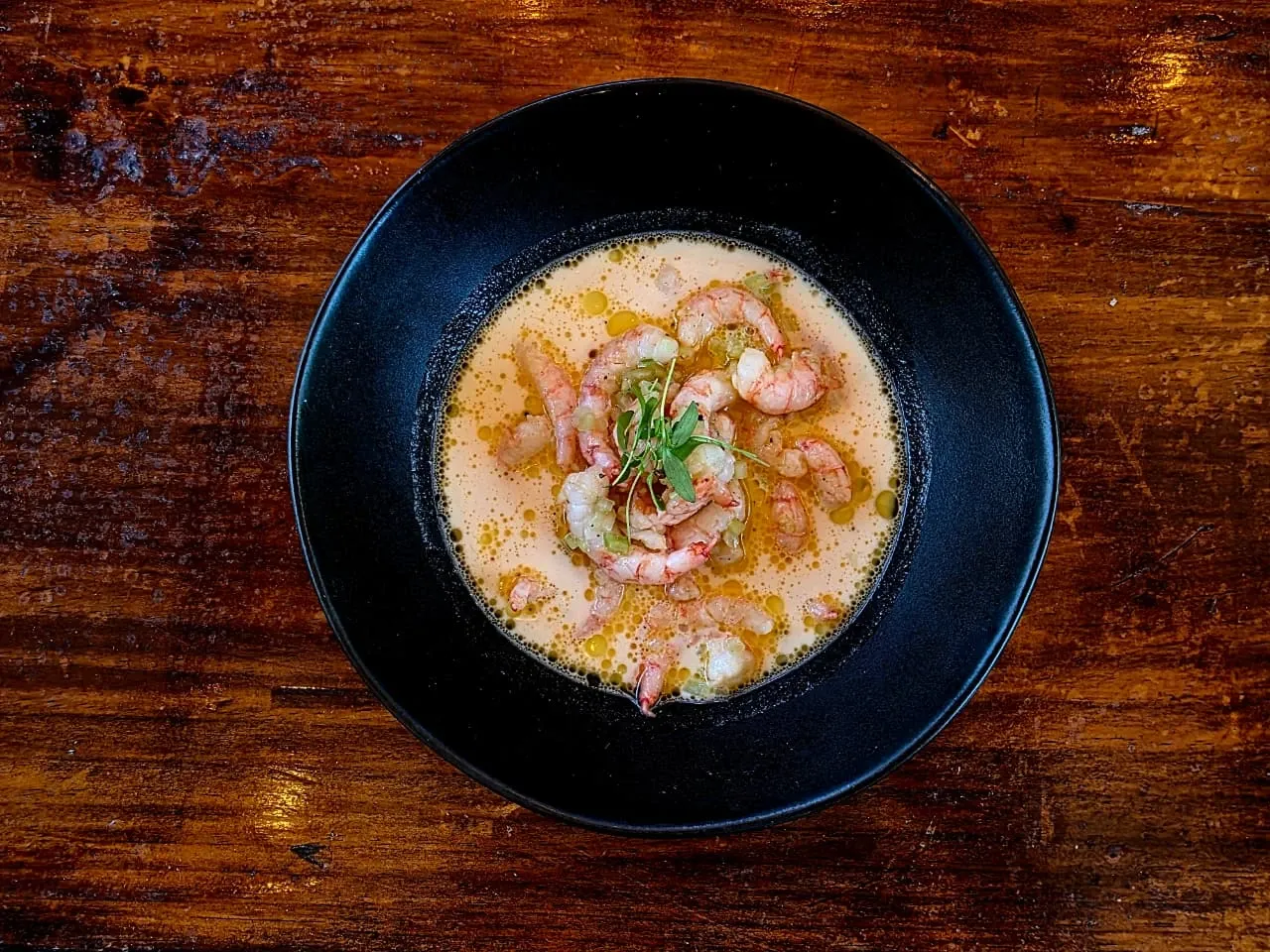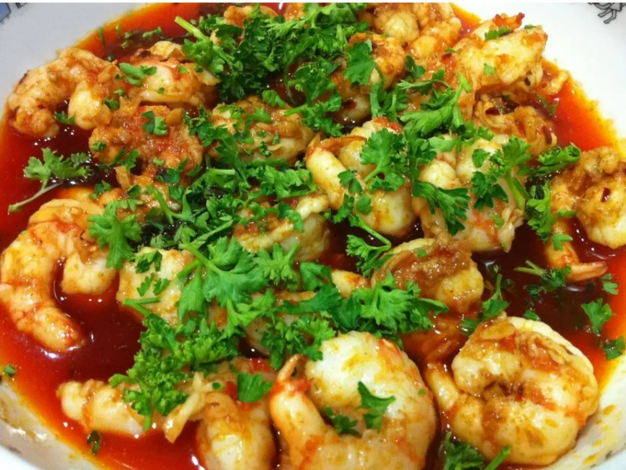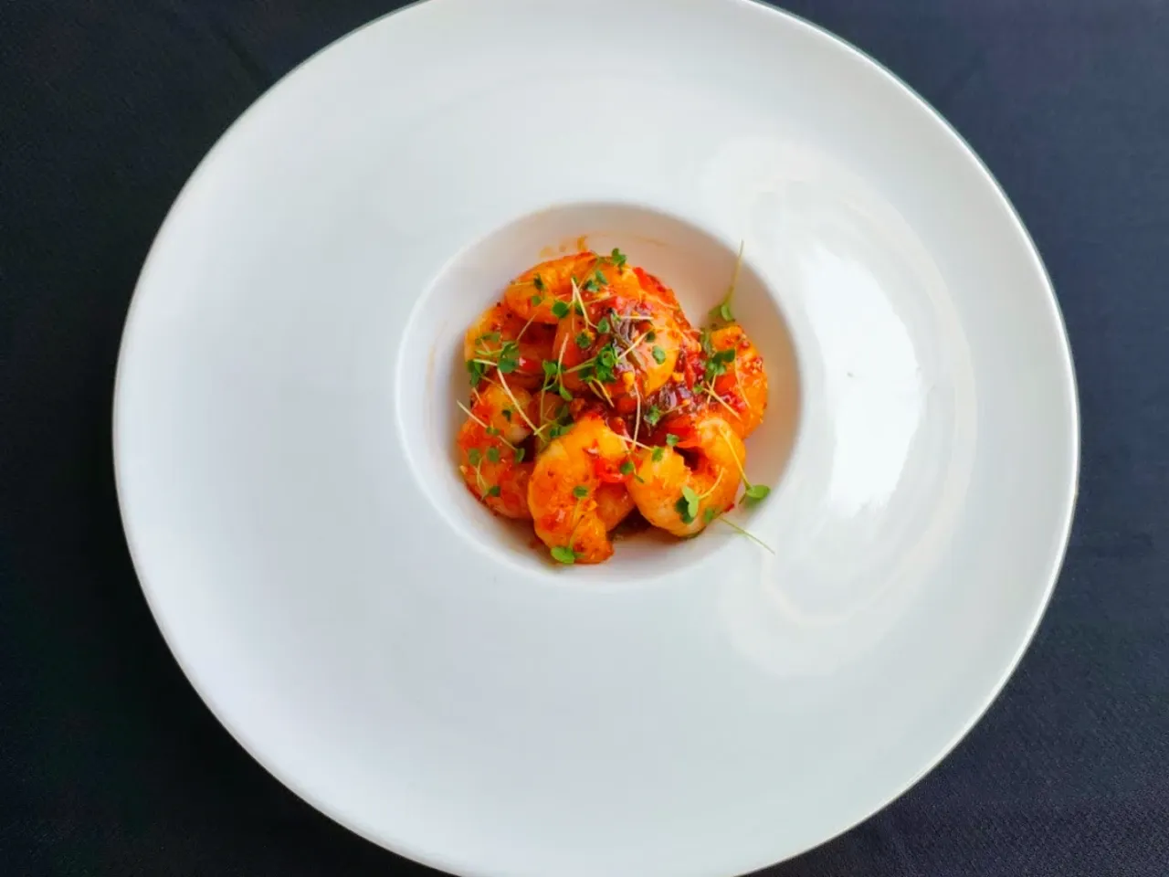Camarones en una reducción de aceite de oliva y ají cacho de cabra
