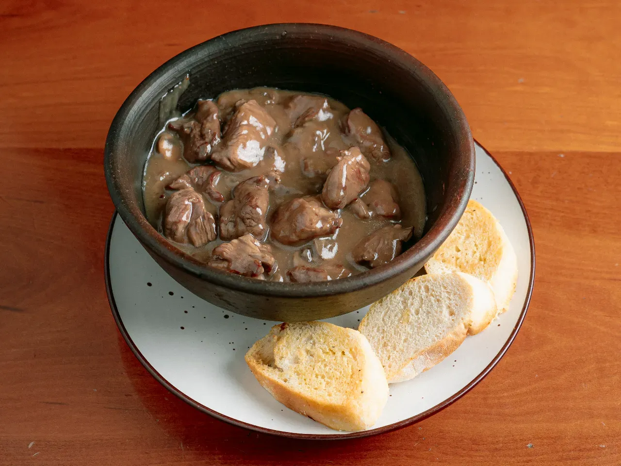 cubos de lomo salteado en olivo, vino blanco, mantequilla y terminado con merquen y cilantro