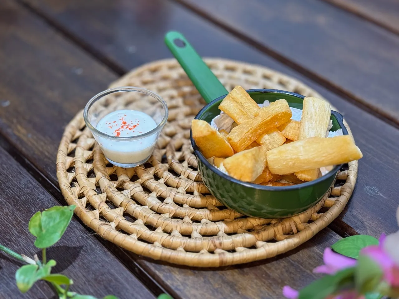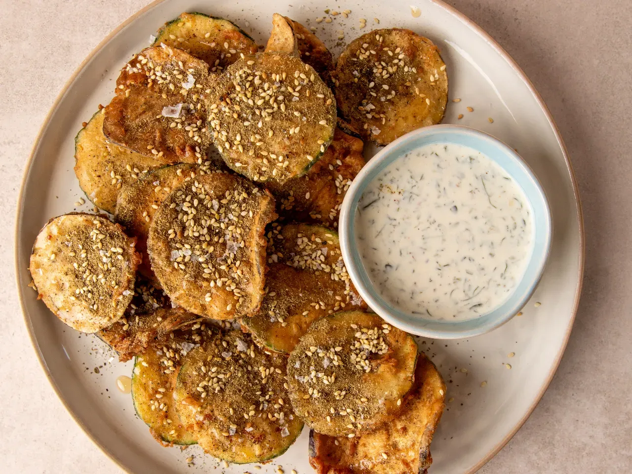 Mix de vegetales fritos, sazonados con sal negra y polvo de mango, acompañados de una crema ácida de pepino