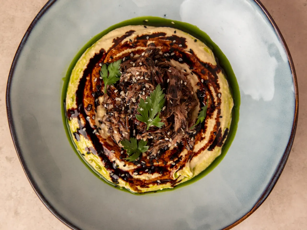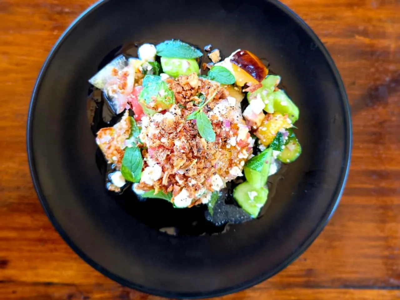 Ensalada fresca y contrastada de sandía en dos texturas, fresca y encurtida, acompañada de pepino árabe desaguado, tomates cherry y cebolla crispy. Se integra queso feta y hojas de menta para aportar cremosidad y frescor. Se termina con un aliño equilibrado a base de soya, vinagre de arroz y el propio líquido del encurtido de …