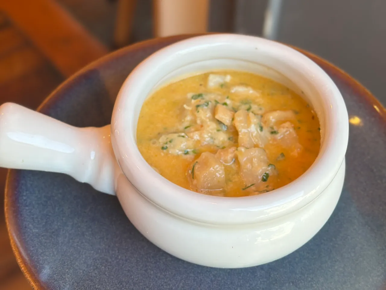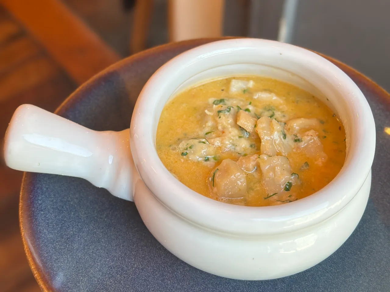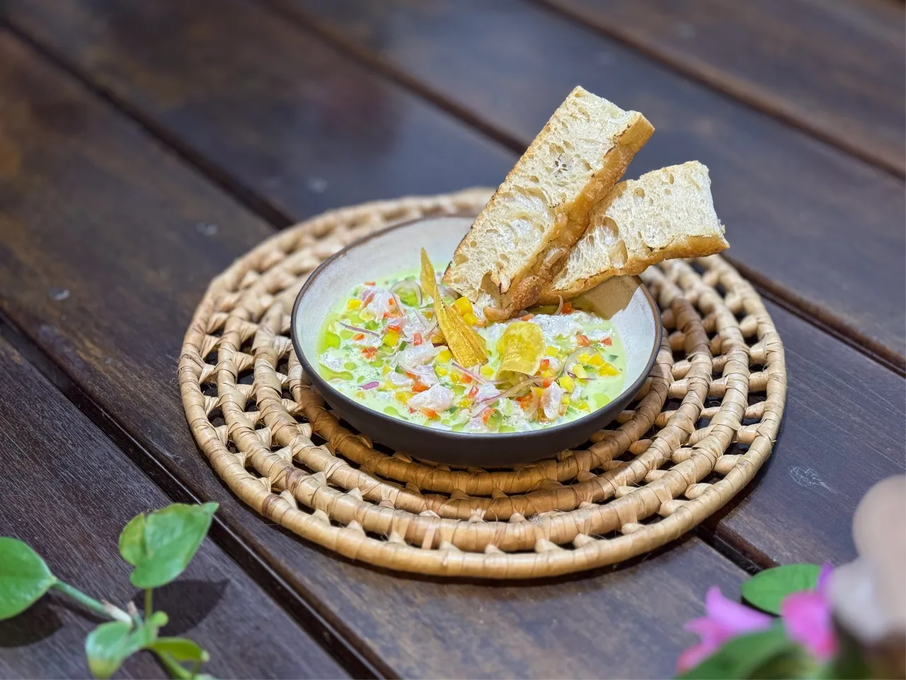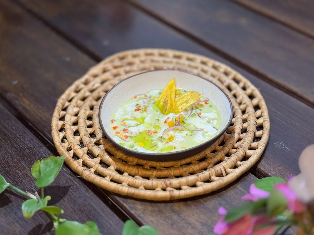 Pesca del día marinada en leche de coco con jengibre, limón, chile, cilantro, pimientos, cebolla y mango; con chips de plátano y casabe